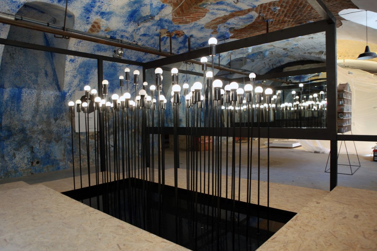 be water di Paolo Didonè reinterpreta le aree dismesse attraverso una vasca d’acqua punteggiata da steli luminosi che simboleggiano nuove prospettive di cambiamento.