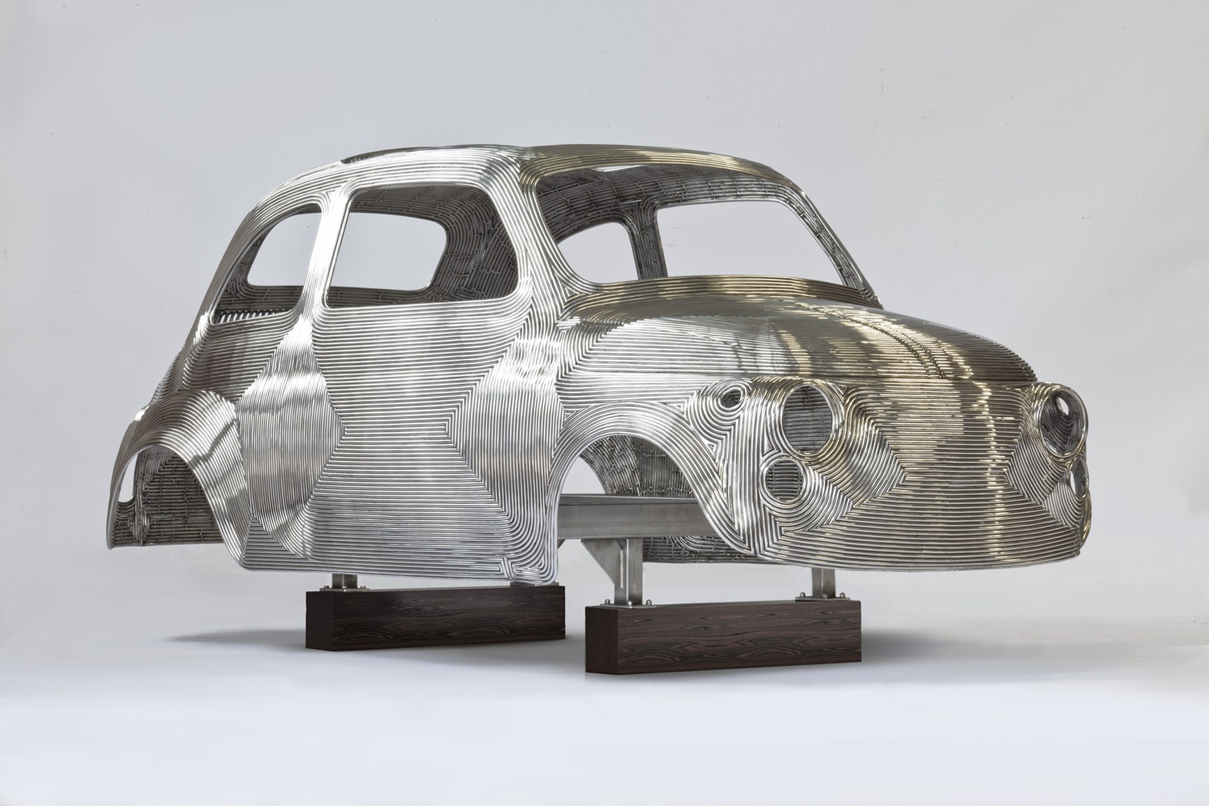 Ad affiancare l’installazione la scultura Roddy Giacosa, creata con centinaia di barre in acciaio inox lucido posizionate su un’armatura metallica con la forma di una Fiat 500.