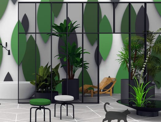 Lea Ceramiche partecipa con il nuovo System L2 (con 20 mm di spessore). La decorazione delle pareti, realizzate nella lastra ultra sottile Slimtech con stampa digitale personalizzata, riprende il richiamo alla verticalità del verde della collezione Mauk disegnata da Diego Grandi; nello spazio esterno la collezione Kensington dal decoro geometrico Brick fa da sfondo all’area living.
