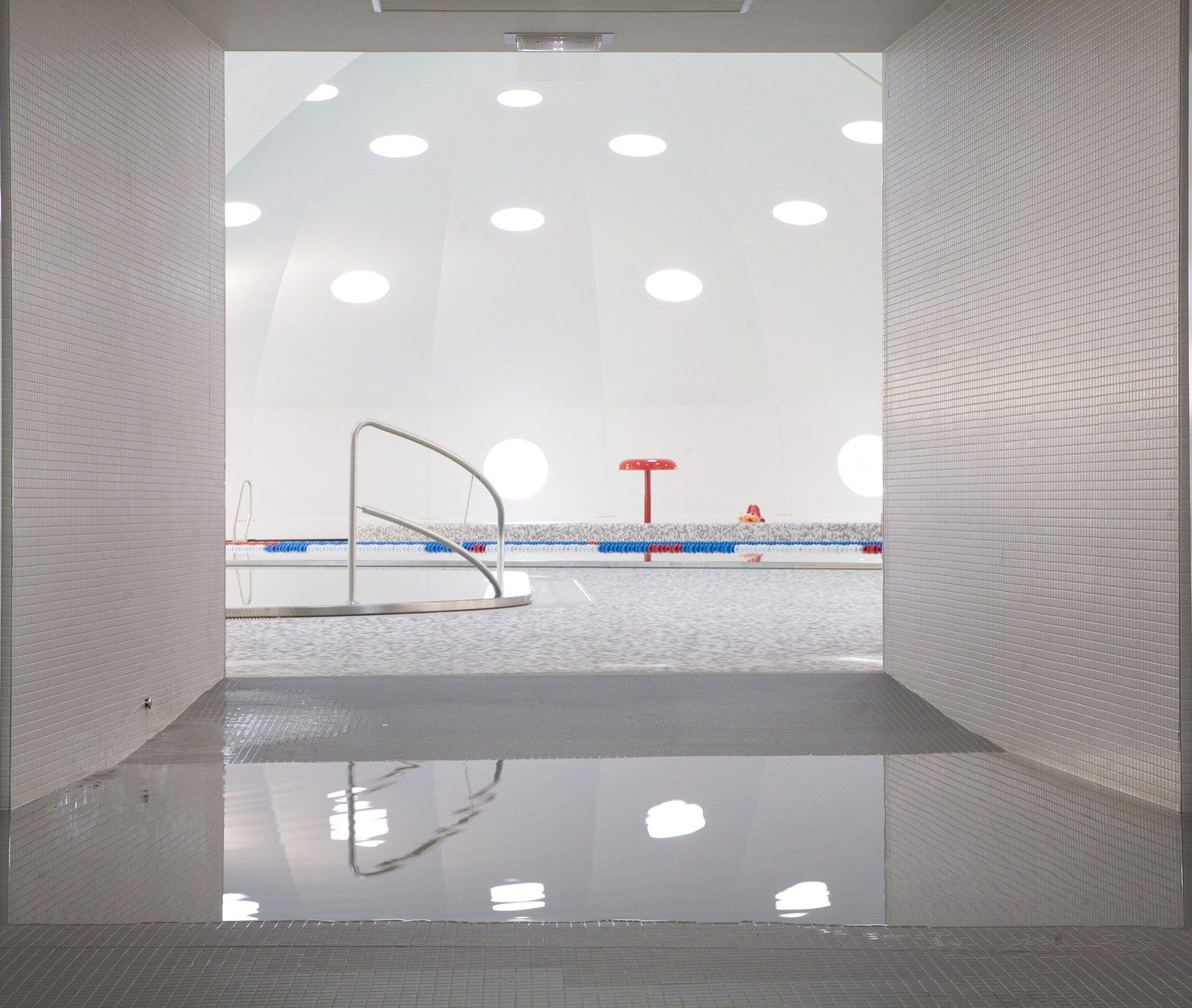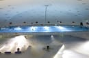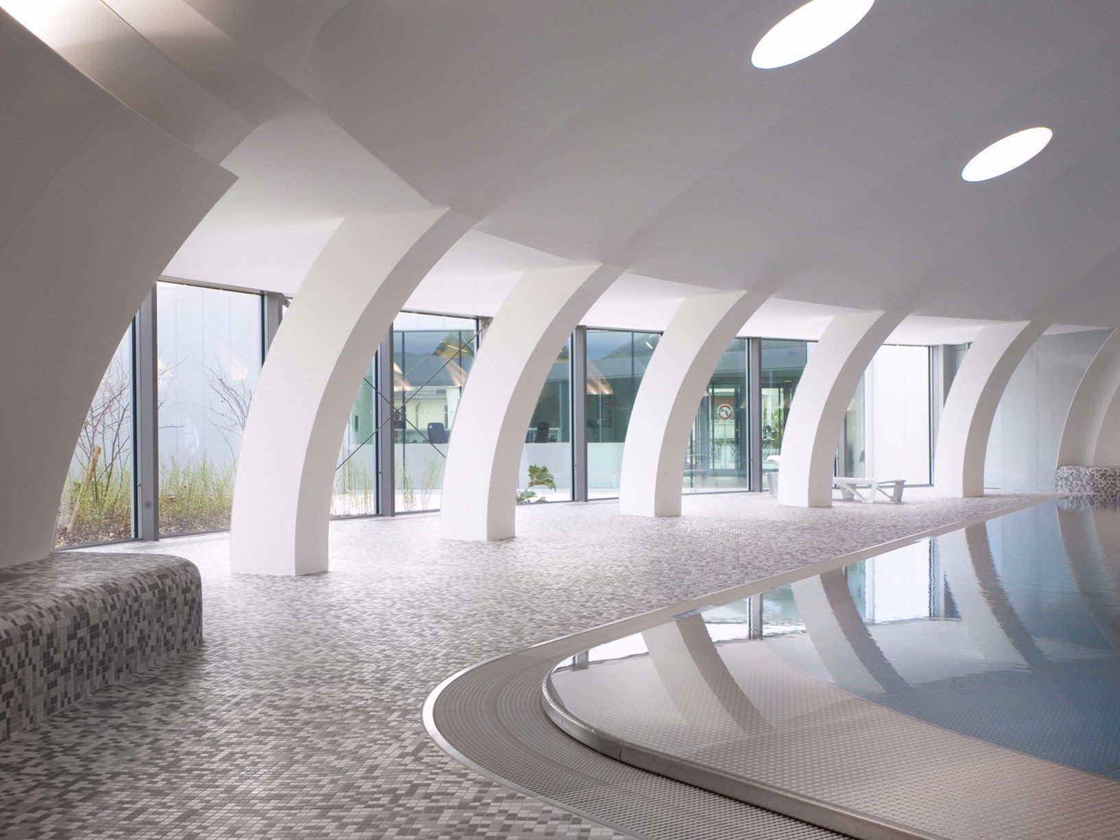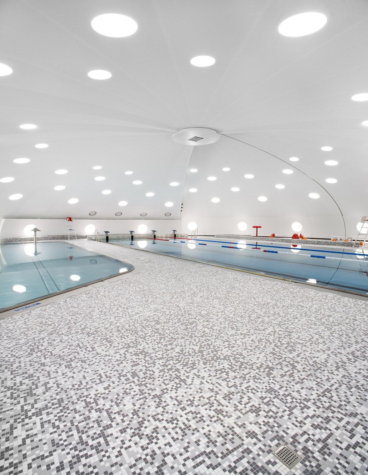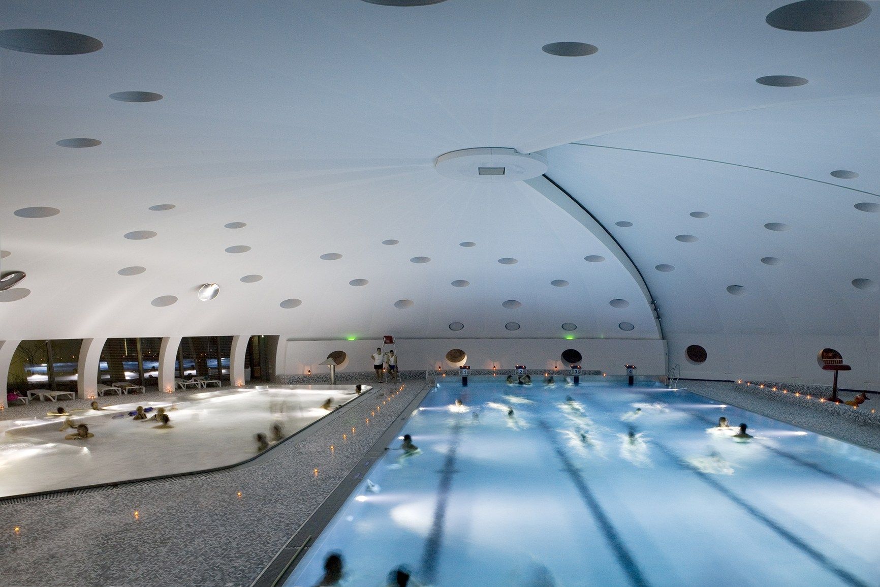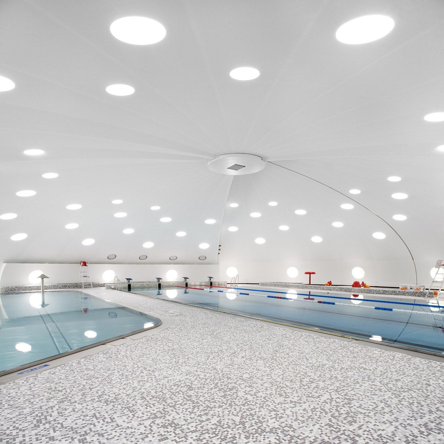 La forma in sezione verticale e trasversale, dunque, non è stata modificata e la cupola ha conservato la sua funzionale apertura a 120 gradi, necessaria a seconda del clima esterno, per trasformare la piscina da coperta a piscina all’aperto. Al suo interno, dove prima c’erano anche gli spogliatoi, sono state installate tre ampie vasche. L’edificio ‘boomerang’, visibile nella sezione orizzontale, circondato da zone verdi, di parchi e campi sportivi, invece, ospita la hall, gli spogliatoi, gli uffici e i locali tecnici, ed è caratterizzato dalla presenza di ampie vetrate che lo collegano con l’esterno.