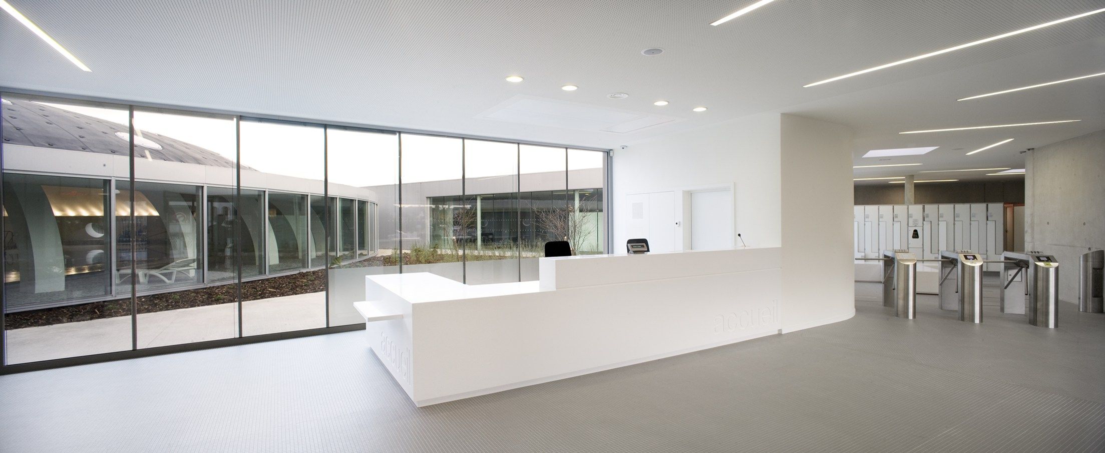 La scelta della tonalità Alpine White assicura una diffusione ottimale della luce in tutto l’edificio. Gli ambienti ricavati nell’edificio ‘boomerang’ sono poi organizzati attorno a un patio vetrato che garantisce una generosa luce naturale. Le numerose trasparenze, che creano uno spazio continuo e aperto, permettono infine agli addetti responsabili dell’accoglienza del pubblico di comunicare visivamente tra di loro.