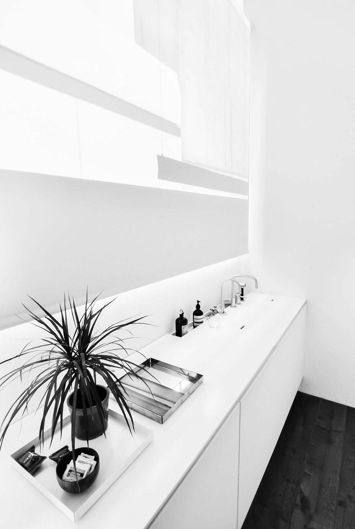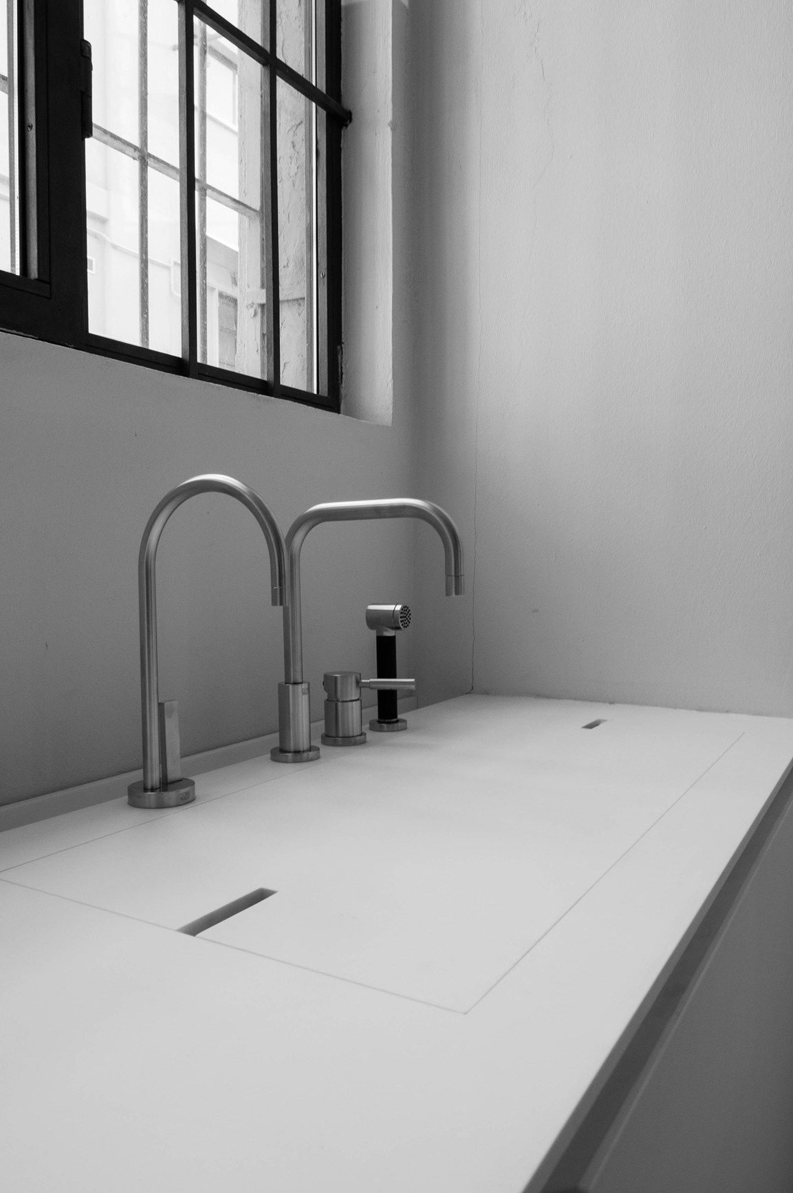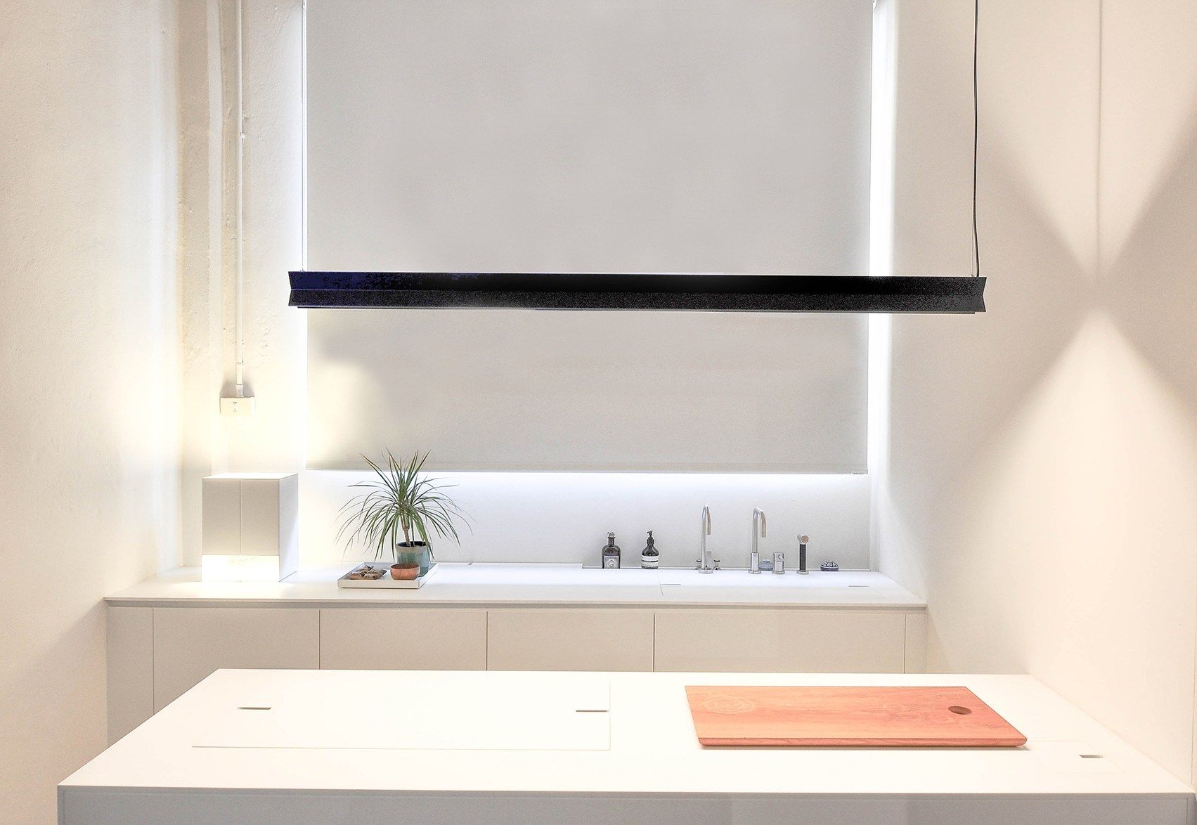 L’utilizzo della pietra acrilica HI-MACS®, che può essere lavorata in maniera tale da eliminare alla vista i segni di giunzione tra le parti, ha contribuito notevolmente a conferire agli elementi, completamente su misura, un senso incredibile di uniformità e continuità, dando l’impressione che i singoli moduli siano ricavati da blocchi unici e più grandi di materia. L’assenza di pori sulla superficie della pietra acrilica, inoltre, si rivela particolarmente indicata per l’impiego in cucina e impedisce ai batteri e allo sporco di annidarsi, rendendo più semplici le operazioni di pulizia. Una particolare finitura gommata, pensata proprio dal progettista, accentua infine l’espressione tattile degli elementi, rendendoli quasi setosi, incredibilmente caldi.