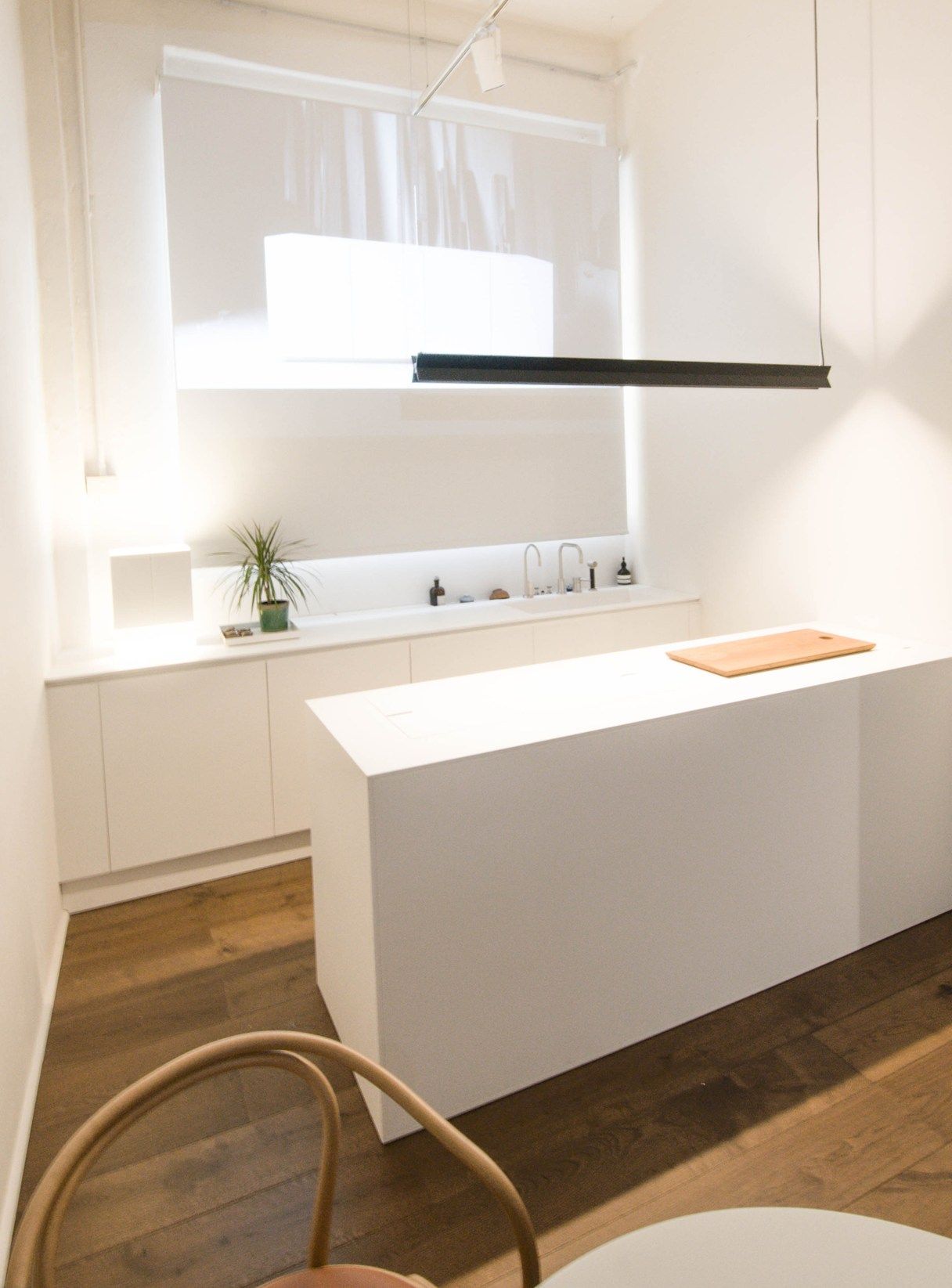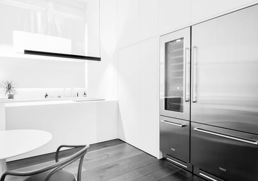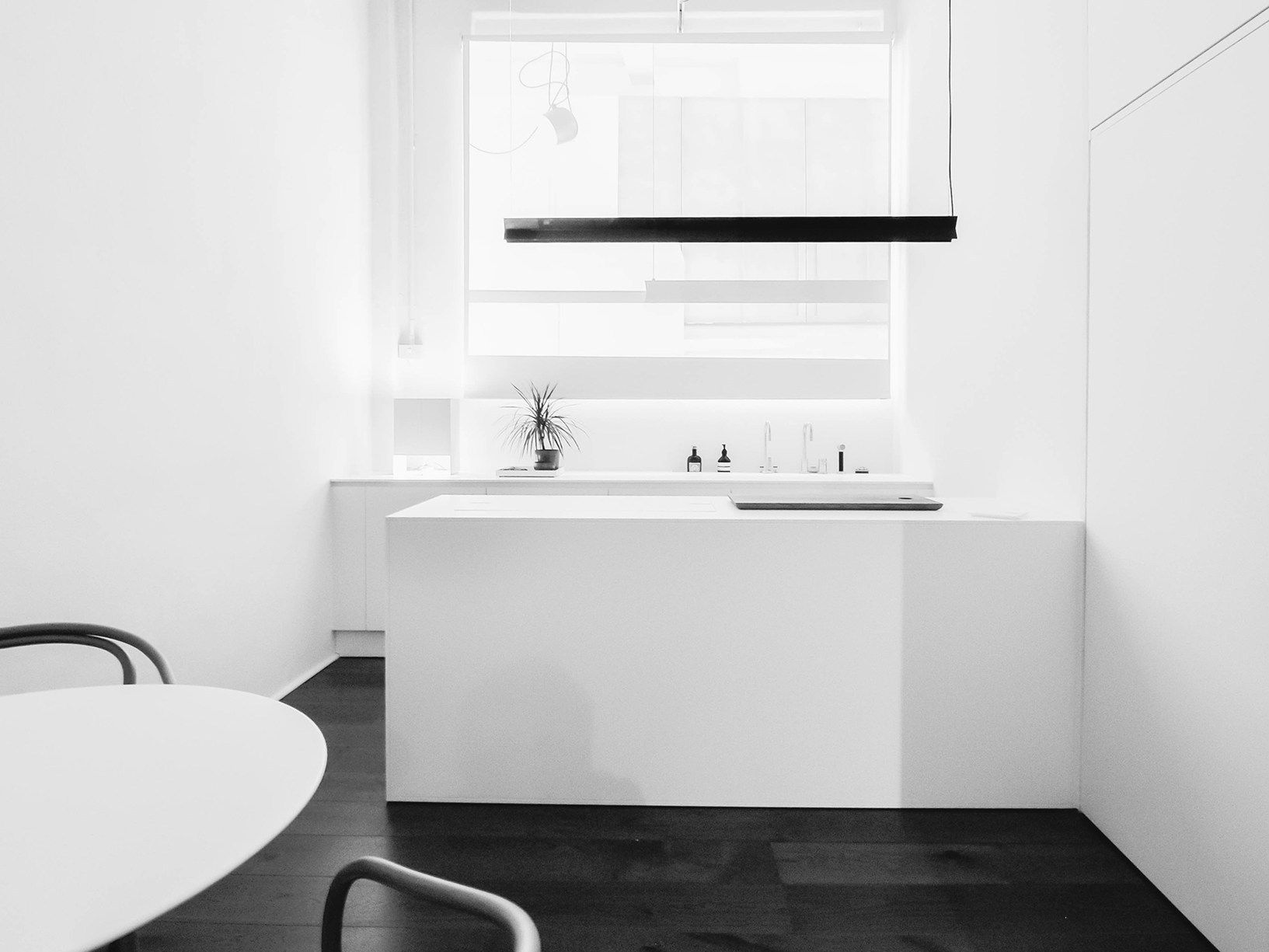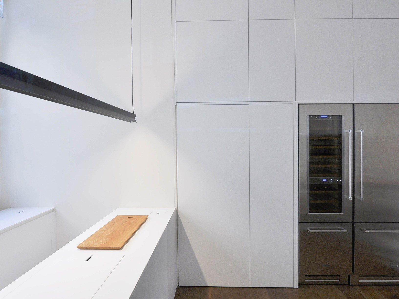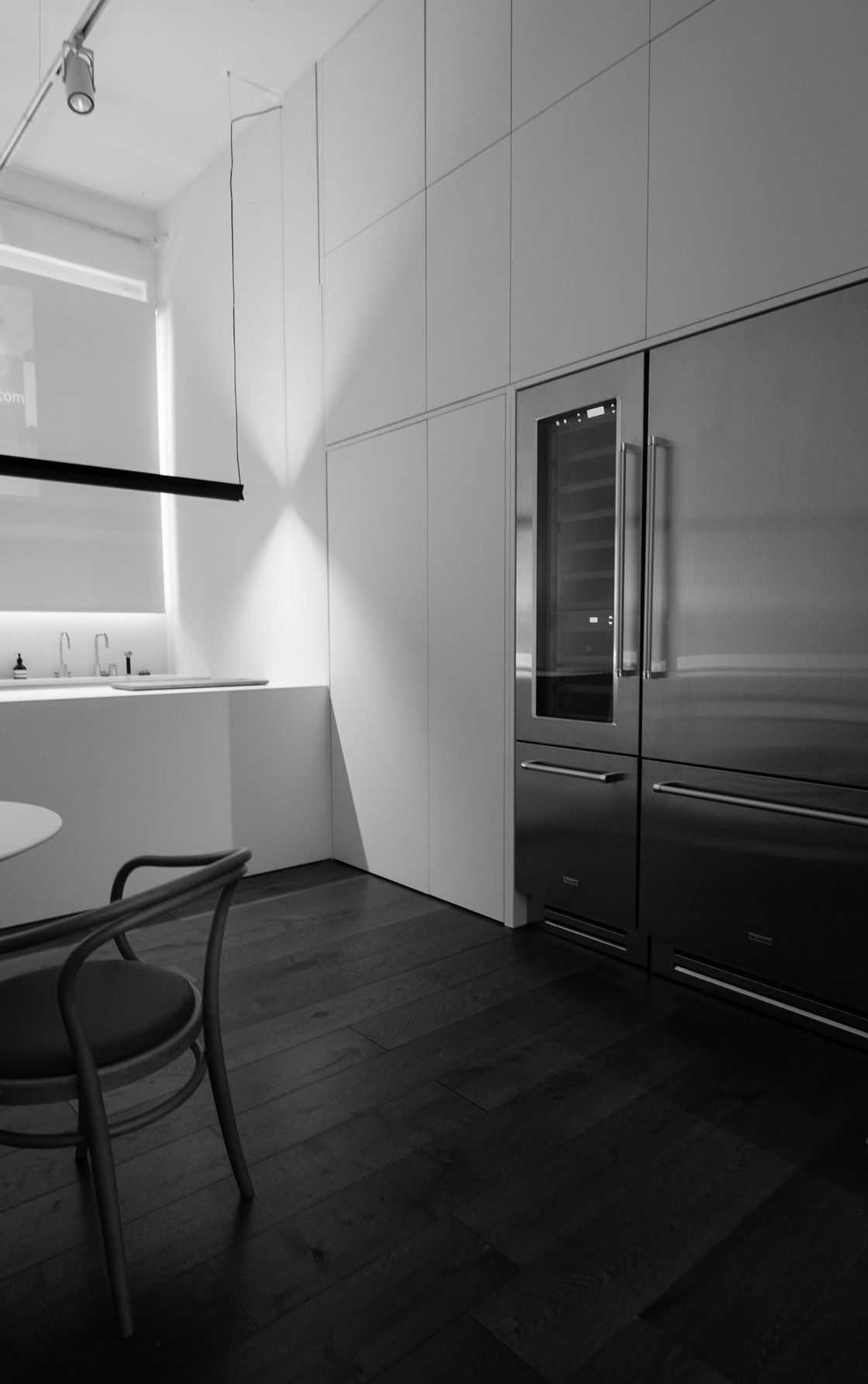 Questo innovativo prodotto è, infatti, pensato per nascondere alla vista gli ingombri nel momento in cui non ve n’è utilizzo: la zona lavaggio, con vasca e lavastoviglie, così come la zona cottura, con piano a induzione e forno elettrico, o la zona approvvigionamento, con dispensa e frigorifero, sono facilmente accessibili ma pervase totalmente dal bianco, nascoste in moduli rigorosi dalla bellezza atemporale.