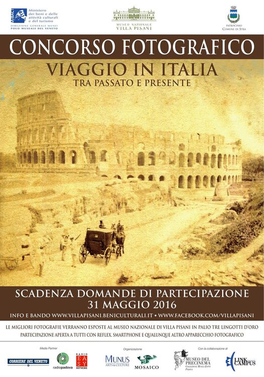 10/05/2016 – Munus, società concessionaria per la gestione dei servizi museali del Museo Nazionale di Villa Pisani a Stra (Venezia), presenta il concorso fotografico “Viaggio in Italia - Tra Passato e Presente”, organizzato in collaborazione con la Direzione del Polo Museale del Veneto. Il Concorso ha lo scopo di sensibilizzare giovani e meno giovani sulle tematiche legate all’arte e alla cultura, stimolando la creatività. Finalità principale è la rielaborazione e l’interpretazione personale dell’identità artistica e architettonica delle città d’arte e dei luoghi della cultura italiani attraverso la tecnica fotografica.