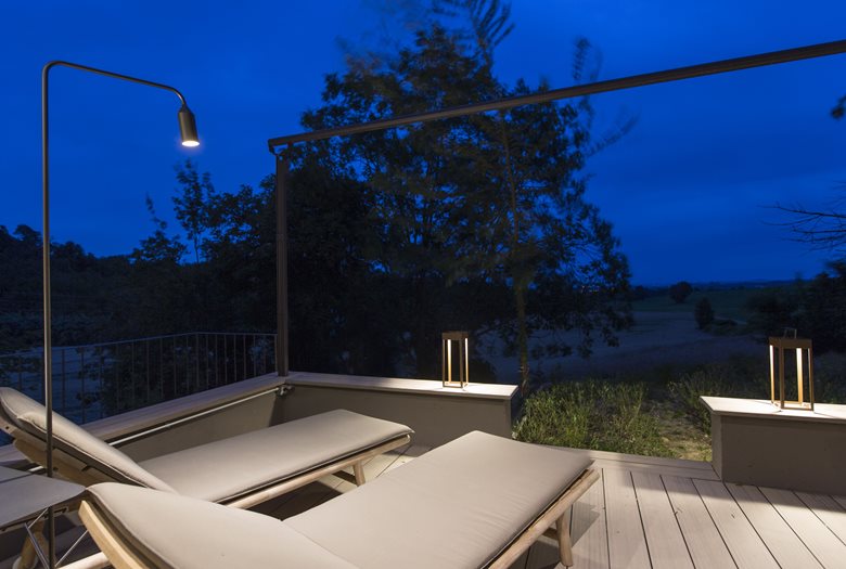 I fasci radenti di ESAGONOaccompagnano con discrezione i percorsi, le soste e le piacevoli passeggiate serali attorno alla residenza, mentre le lanterne ETEREAoffrono una gradevole e morbida luce nelle aree di svago, per momenti di puro relax e convivialità. Infine, lampade da terra FLAMINGOilluminano, a seconda delle esigenze, i diversi ambienti della terrazza per serate rilassanti e cene estive, grazie all’agevole movibilità della lampada.