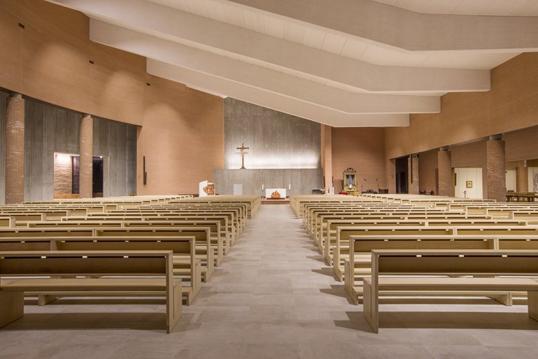 Le grandi vetrate della chiesa, alternate ad ampie pareti effetto brise-soleil in listelli di cotto, sono state progettate in modo da consentire costante illuminazione diurna della struttura, in posizione zenitale a nord nel fonte battesimale, a sud nella custodia del Santissimo e nel coro. L’interno si trova così avvolto perimetralmente da tenui bagliori di luce, mutevoli con il passare delle ore, conservando nel cuore dell’aula domenicale un’atmosfera soffusa e raccolta, ideale per la meditazione e la preghiera.
