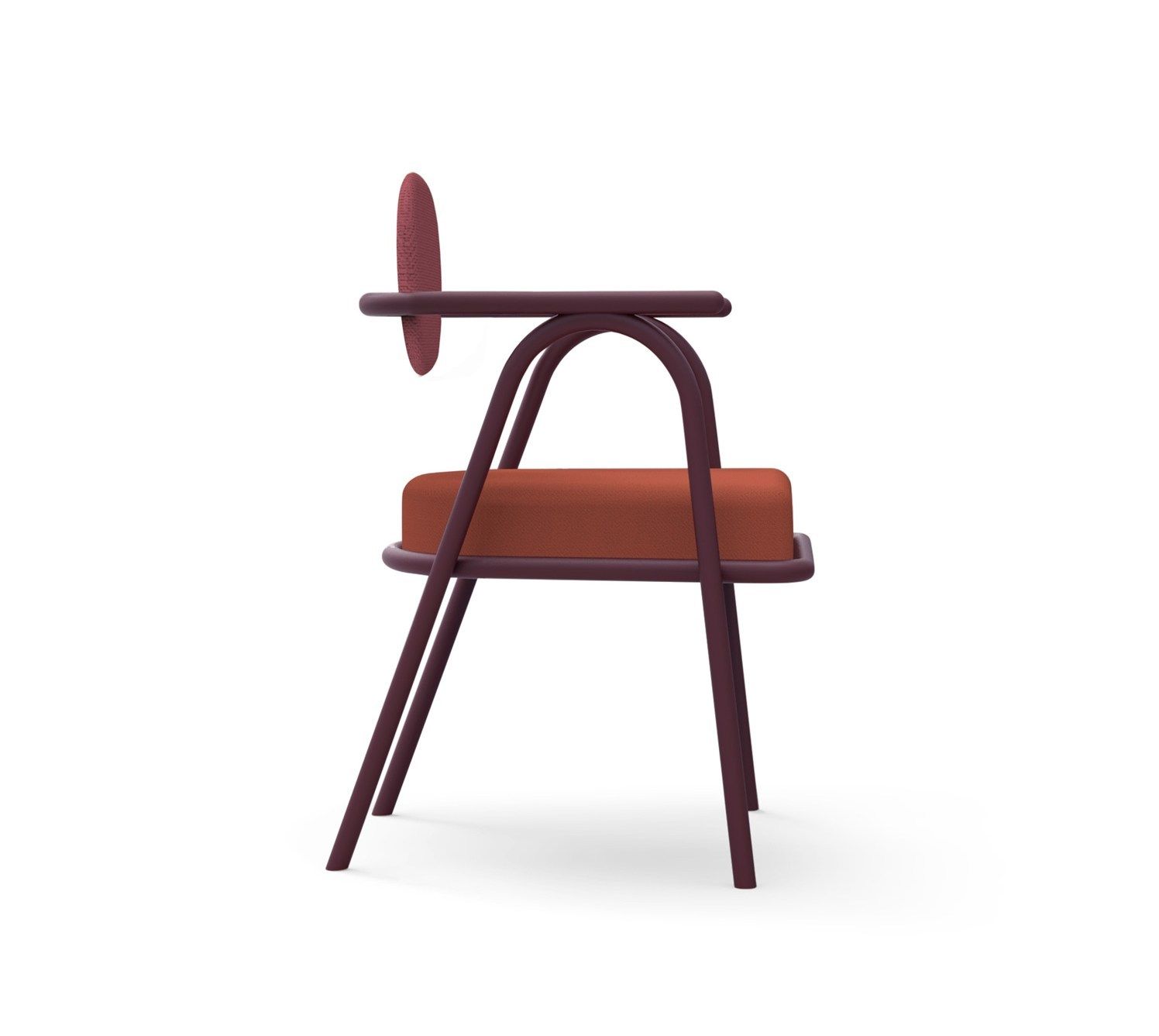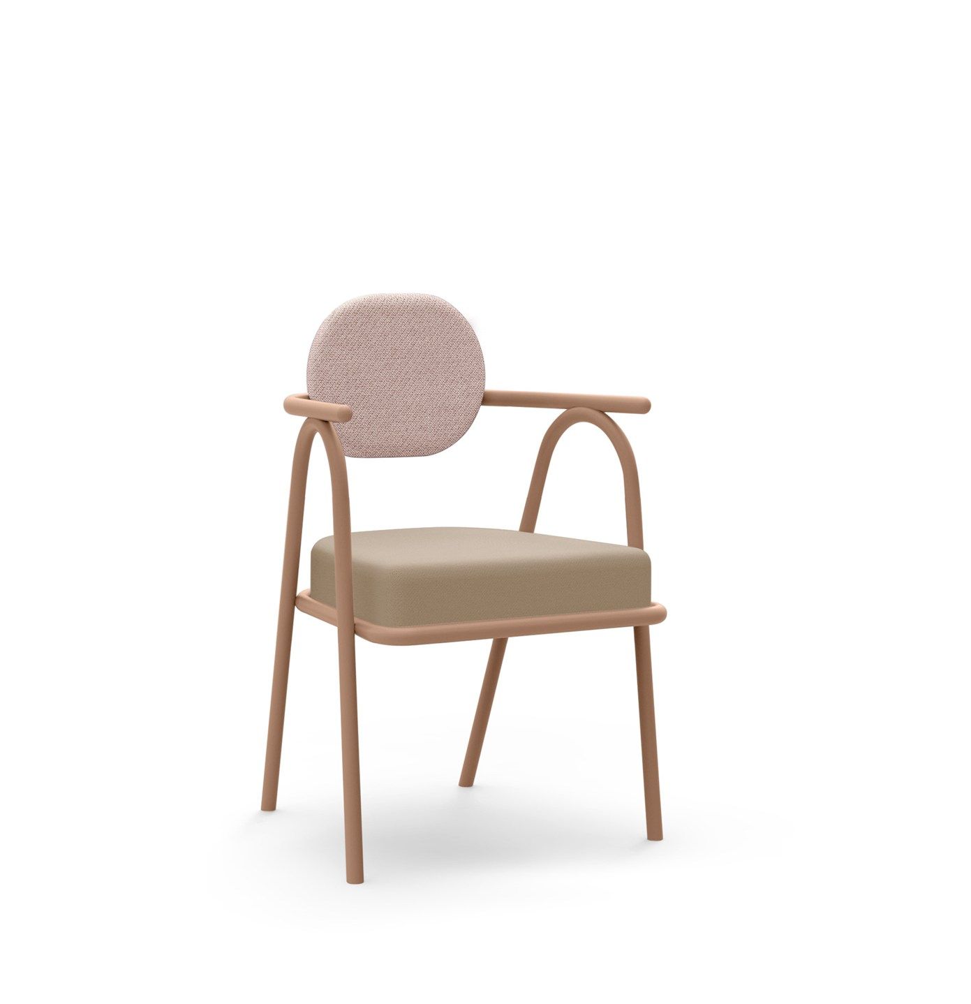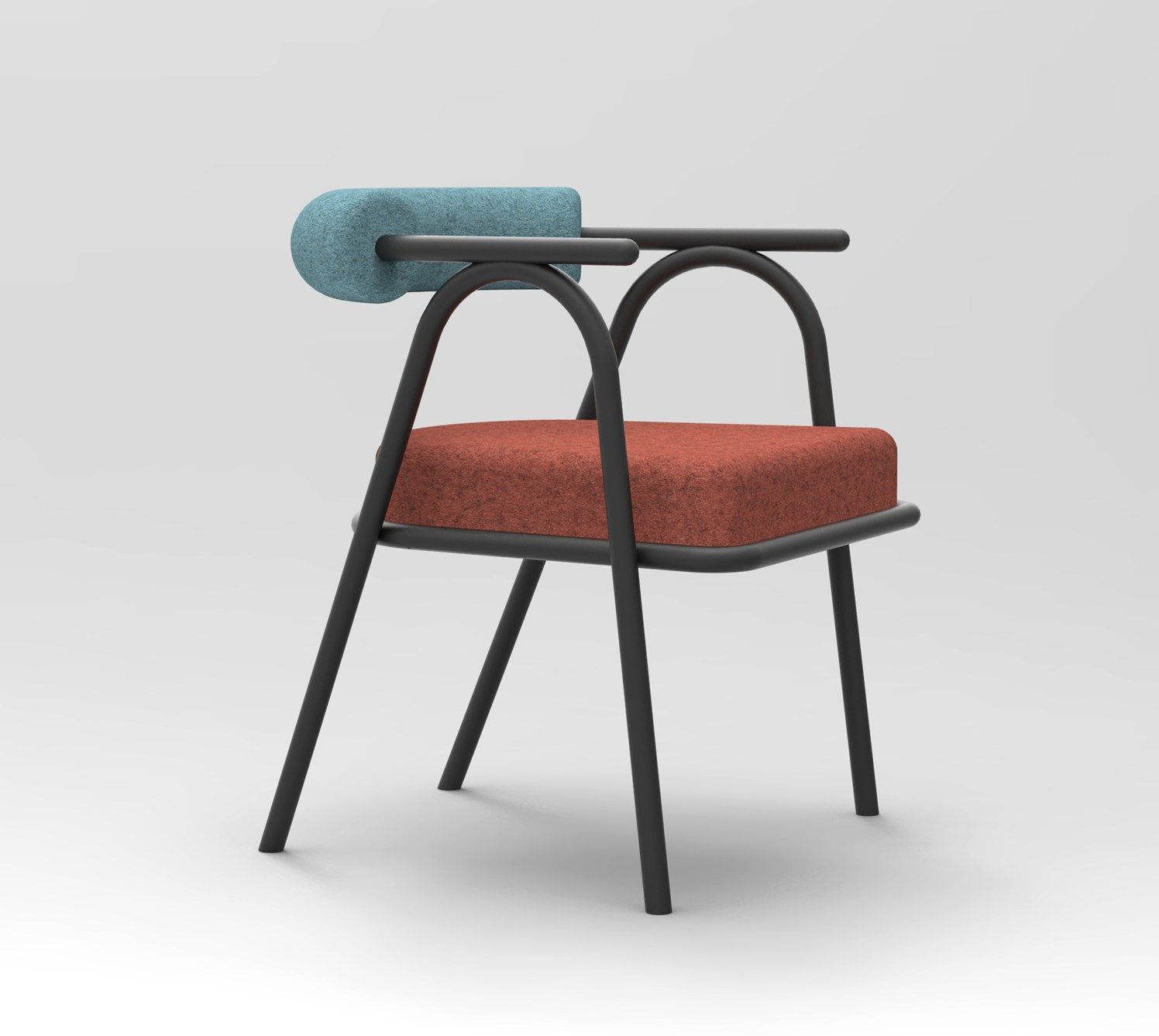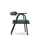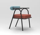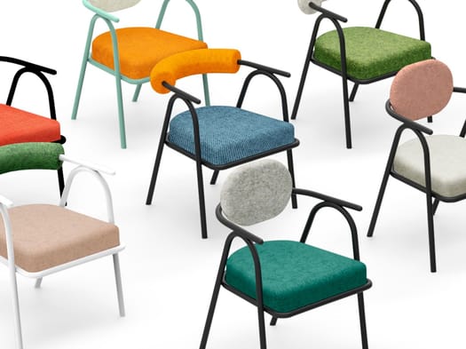 Il gioco di contrasti è poi evidente, non solo nell’accostamento dei colori, ma anche nella ricerca dei volumi tra lo schienale e la seduta, e la scocca esile e monocromatica che si muove sinuosa attraversando le forme accoglienti degli imbottiti.