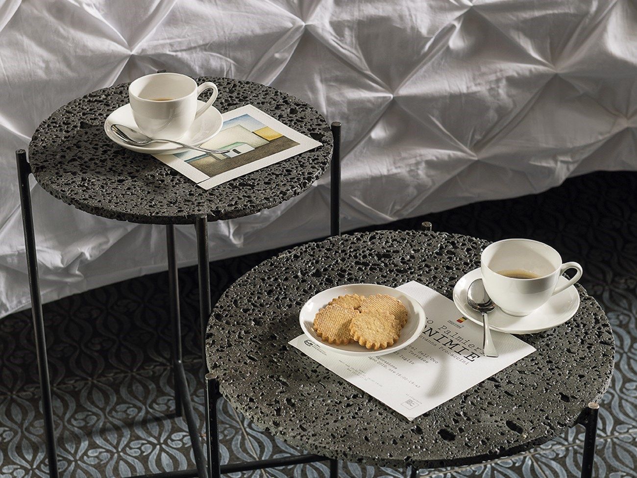 Made a Mano, azienda specializzata nella lavorazione della pietra lavica, ha creato per Coincasa una serie di tavolini in pietra lavica presa dagli strati più profondi della lava dell'Etna e detriti agroforestali compattati.