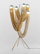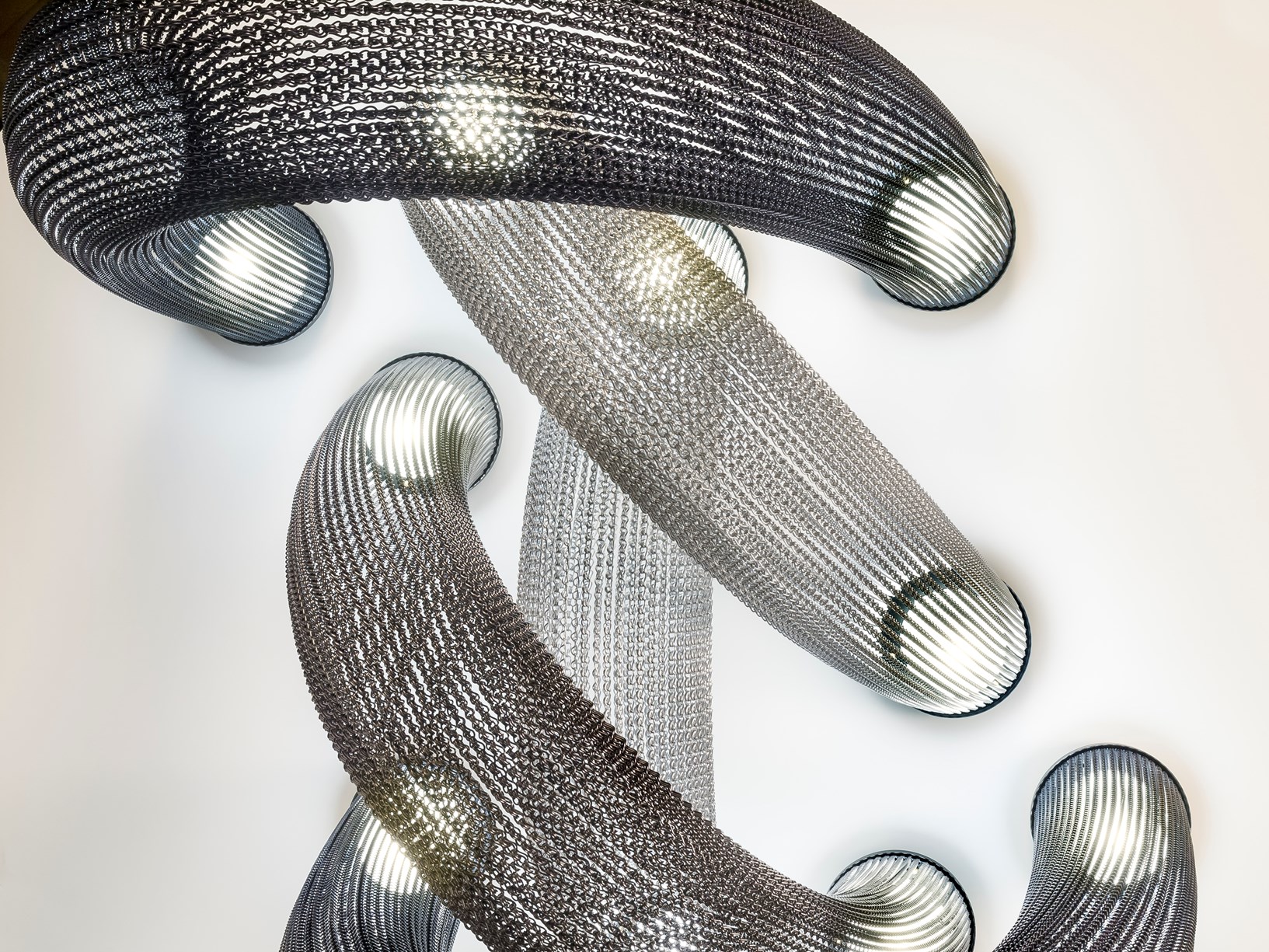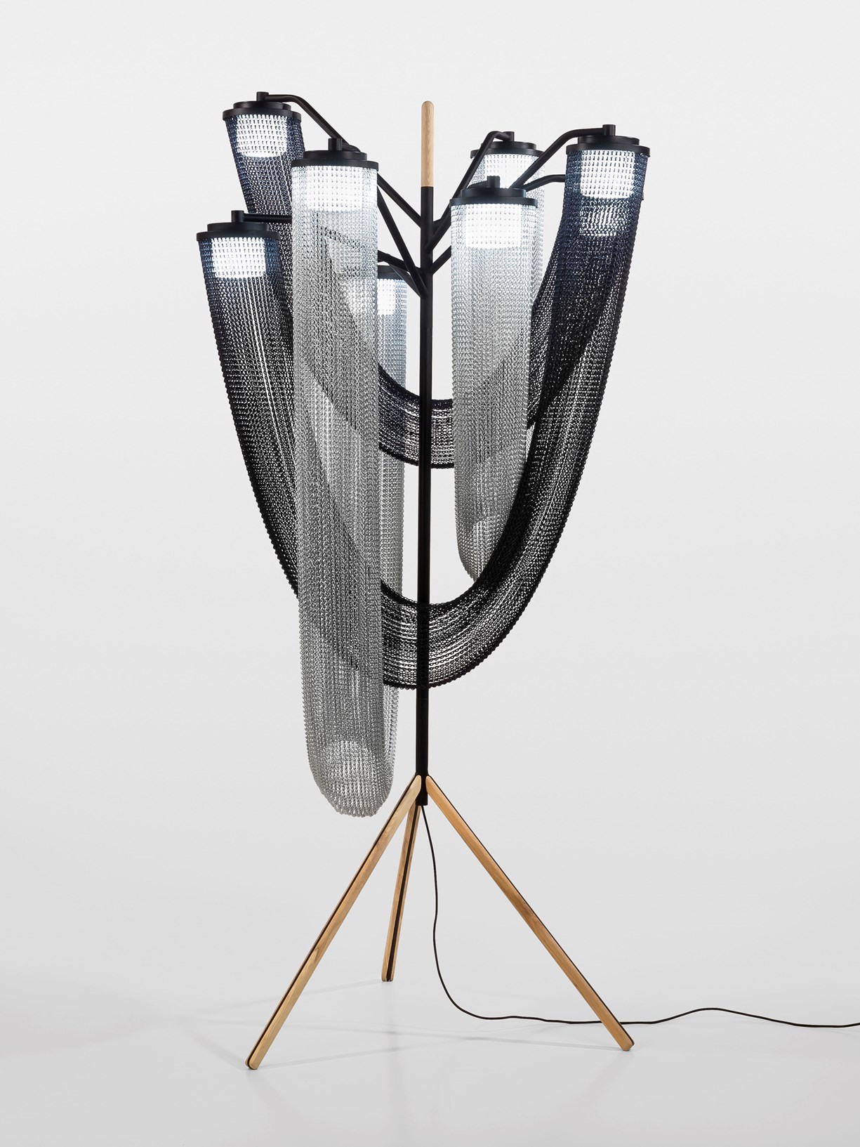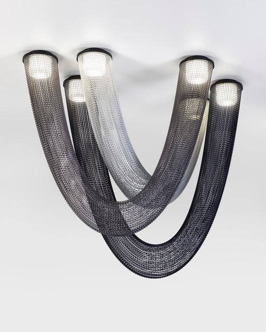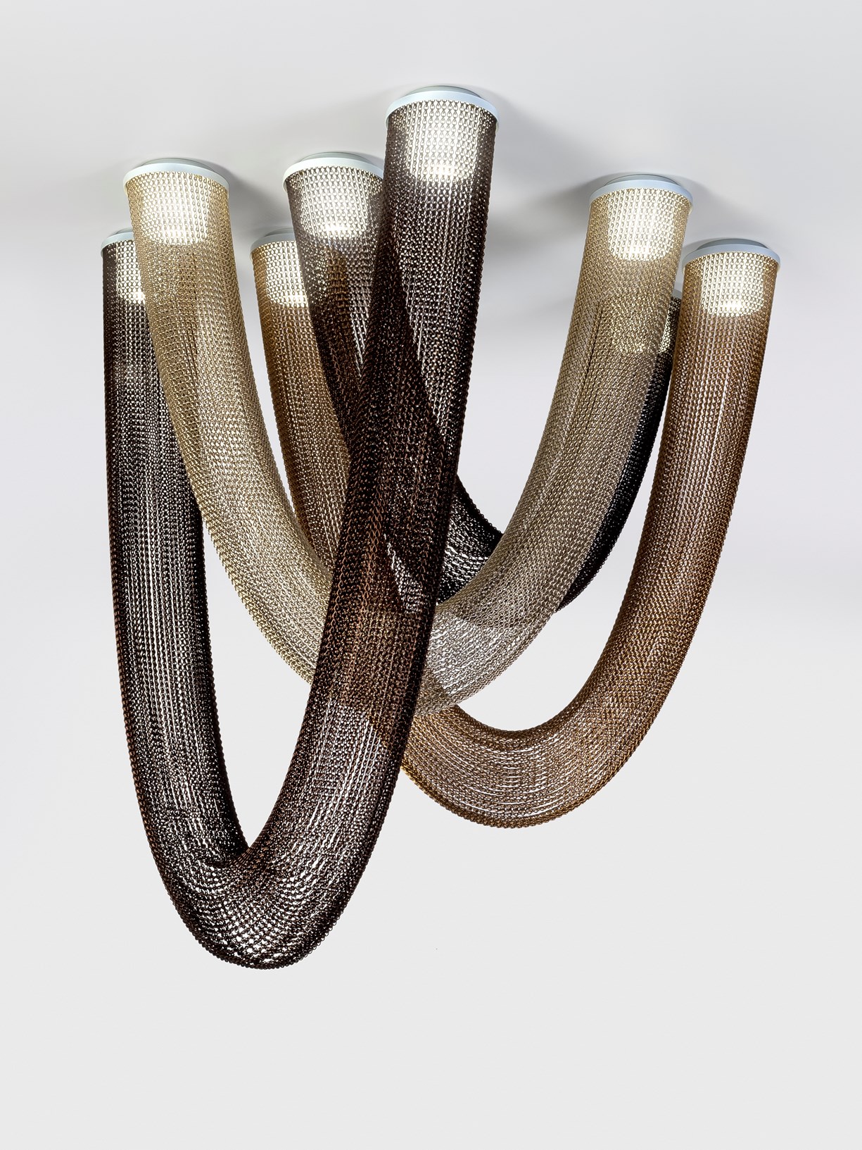 Come racconta Clara del Portillo, co-founder dello studio Yonoh, 'lavorando sulle catene metalliche, materiale tipico di kriskadecor, abbiamo realizzato volumi tridimensionali. Le catene partono dalla sorgente luminosa e creano tubi di lunghezze diverse che si intersecano formando un grande volume liberamente componibile. La luce bagna le catene e si attenua poco alla volta, generando dei sottili fasci luminosi che si riflettono nell'ambiente.'