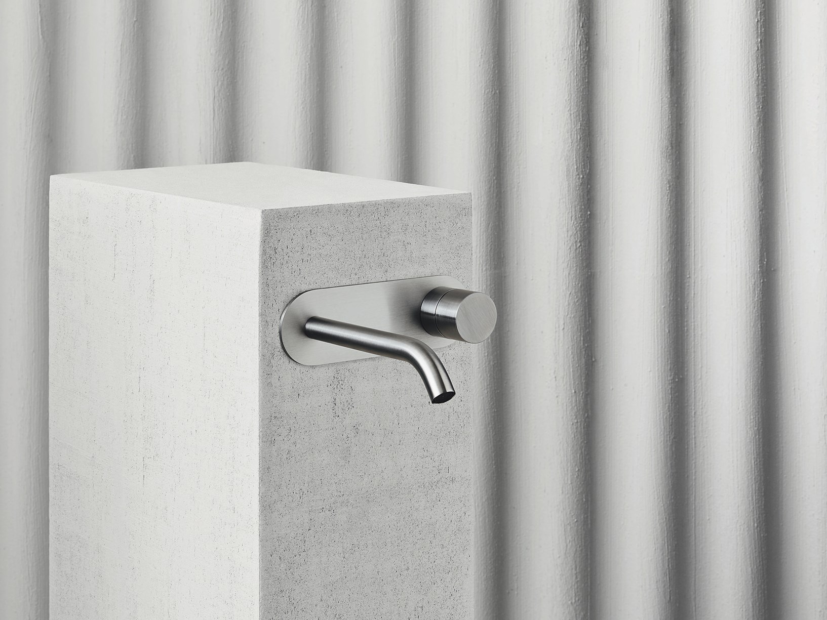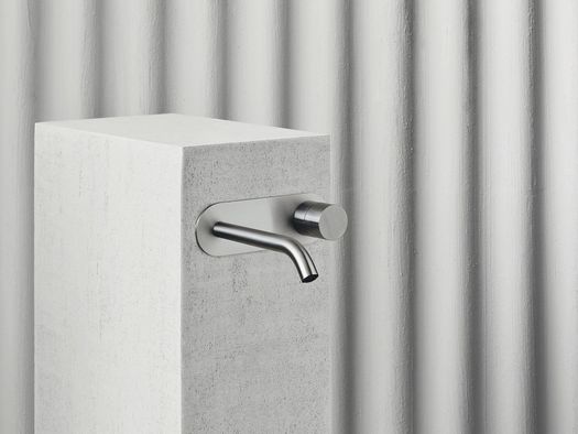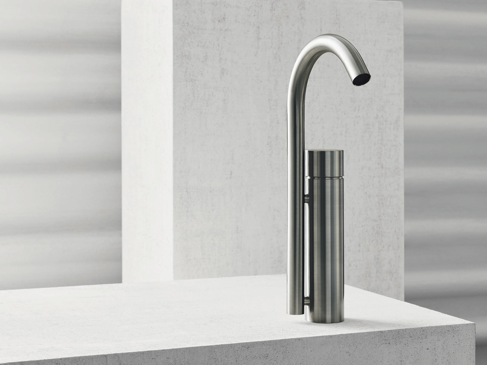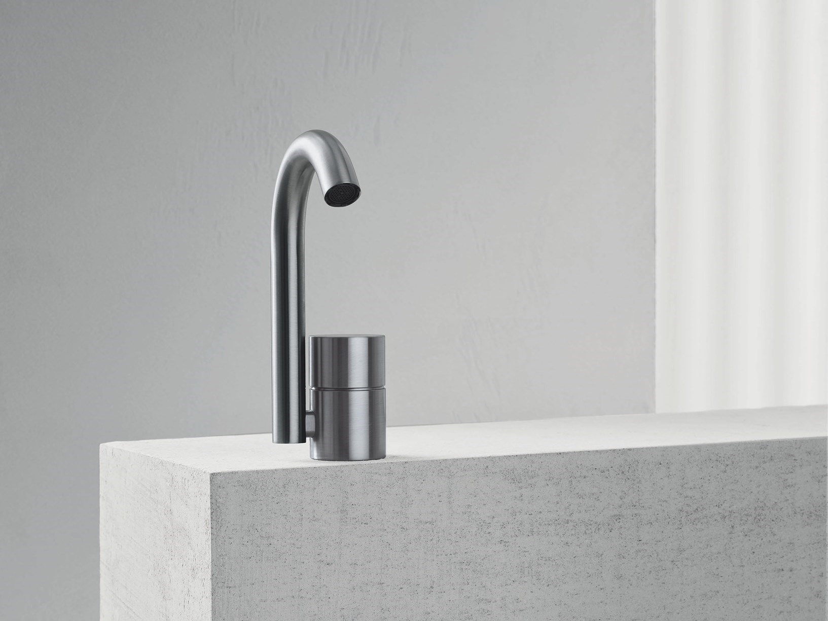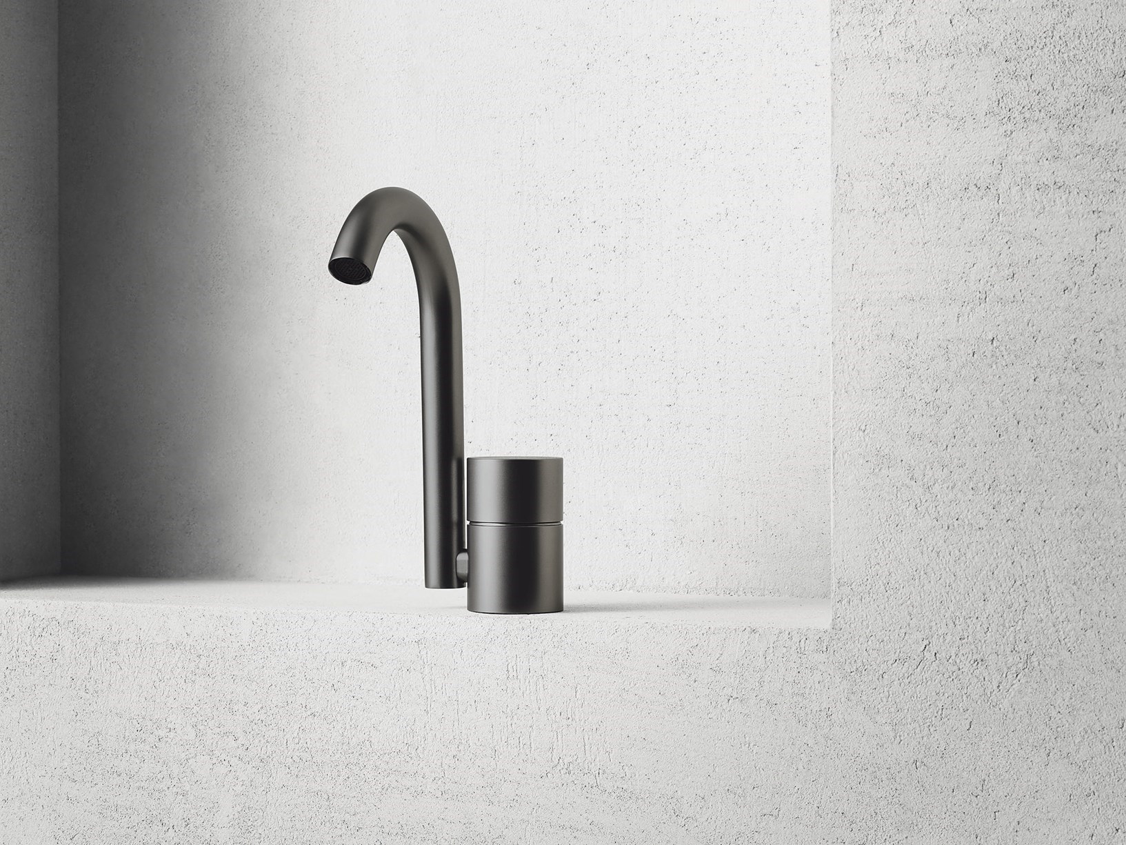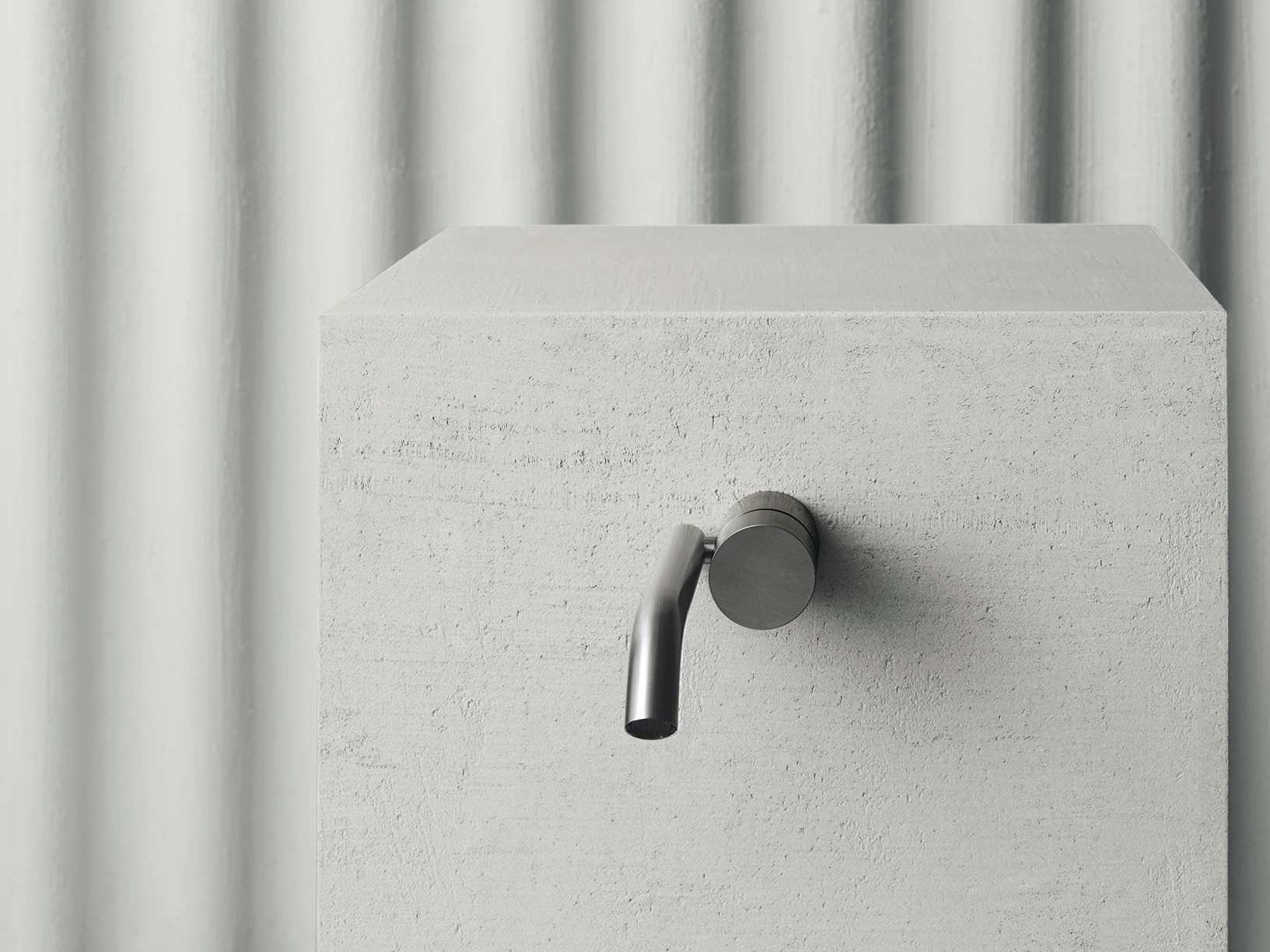 Inaspettato, come molti progetti di Anastassiades, il rubinetto è costituito da due elementi distinti - la manopola e la bocca - uniti da un terzo elemento cilindrico orizzontale.