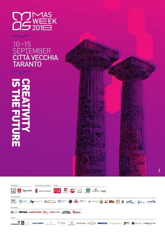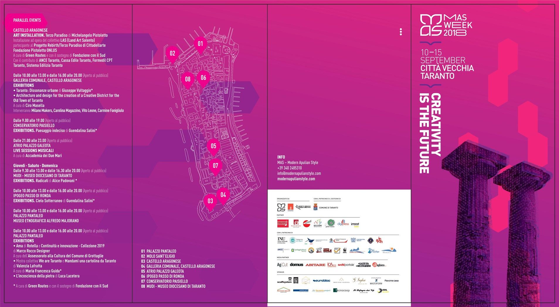 Il claim di questa edizione è “Creativity is the future”. L’evento è organizzato dalla società di architettura e ingegneria MAS - Modern Apulian Style, dall’Ordine degli Architetti P.P.C. della Provincia di Taranto e dal Distretto Produttivo ‘Puglia Creativa’ con il patrocinio e il sostegno del Comune di Taranto.