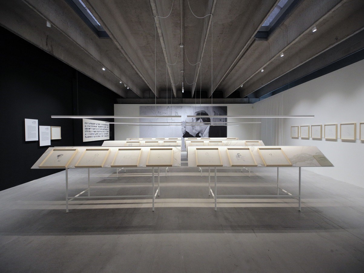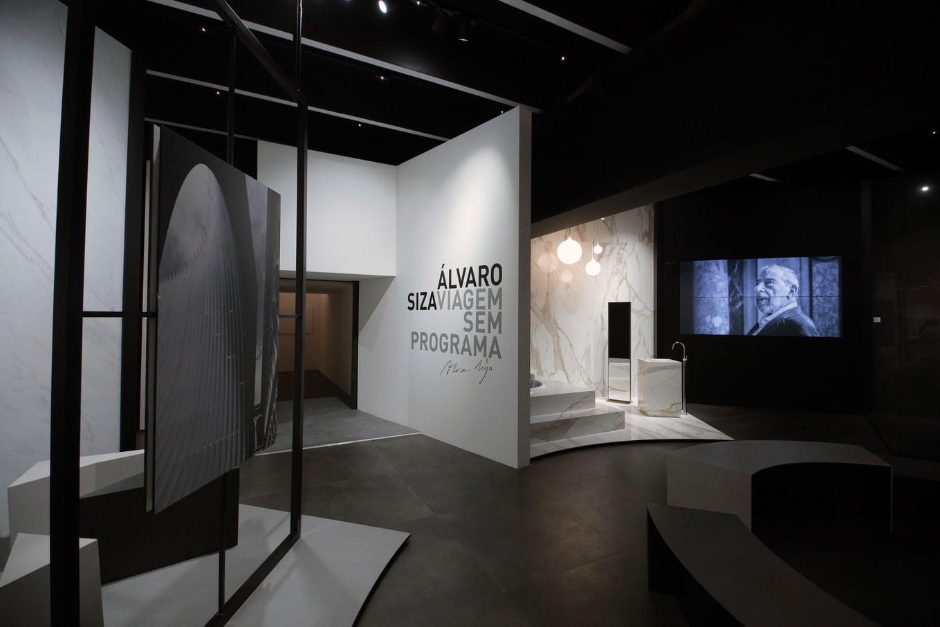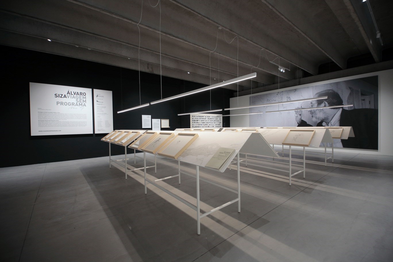 Per il progetto di “Viagem sem programa”, nato dalla collaborazione tra la redazione del portale Floornature e lo studio di architettura Dumbo Design che ne ha seguito la curatela, Fiandre ha progettato un concept su misura che intendeva valorizzare le opere esposte. Le 53 realizzazioni dell’architetto lusitano, simboli di un viaggio che ripercorre la vita professionale e personale dell’artista, trovavano ampio spazio in una delle sale del bureau, un ambiente industriale in cui le superfici ceramiche rivestivano gli arredi ponendo precisi accenti su alcuni particolari rilevanti. Tre linee di eleganti leggii presentavano i disegni autografi, che assieme ad una selezione di immagini evocative appese alle pareti rendevano l’atmosfera ancora più intima e accogliente.