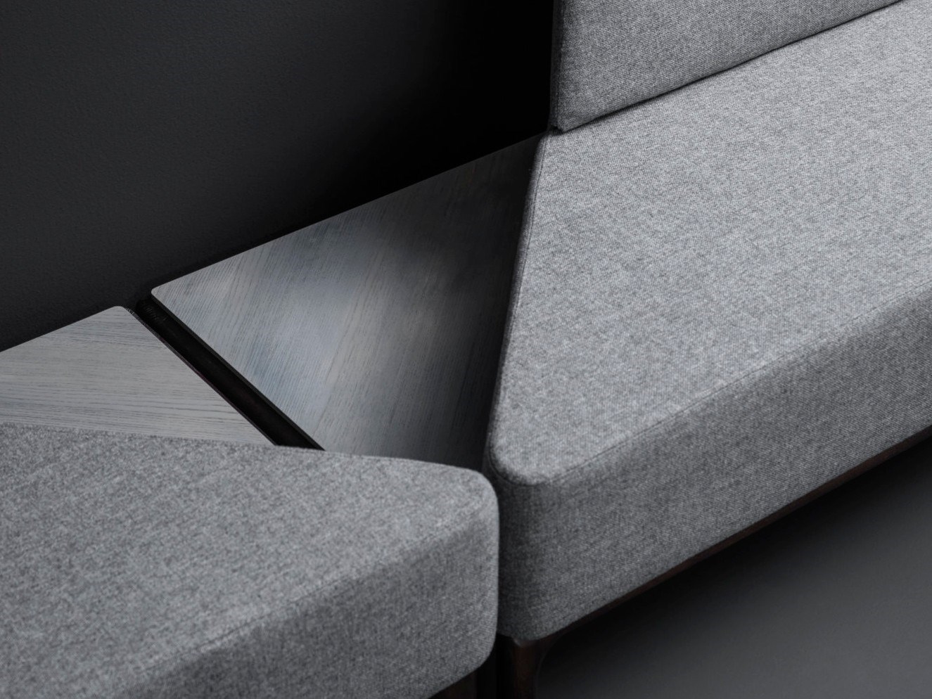 Gli elementi che compongono il divano modulare sono di forma trapezoidale. Affiancati tra loro, aderiscono perfettamente creando una seduta a soluzione continua, ma possono anche essere alternati ad ampi tavolini in massello di frassino, stilisticamente coerenti con l’insieme. Sono disponibili in due versioni. Nella versione con sedute speculari, gli elementi accostati creano un divano da centro stanza che può svilupparsi in composizioni infinite. La stessa geometria caratterizza la versione del modulo da parete a seduta unica, mantenendo inalterata la sua forte personalità.