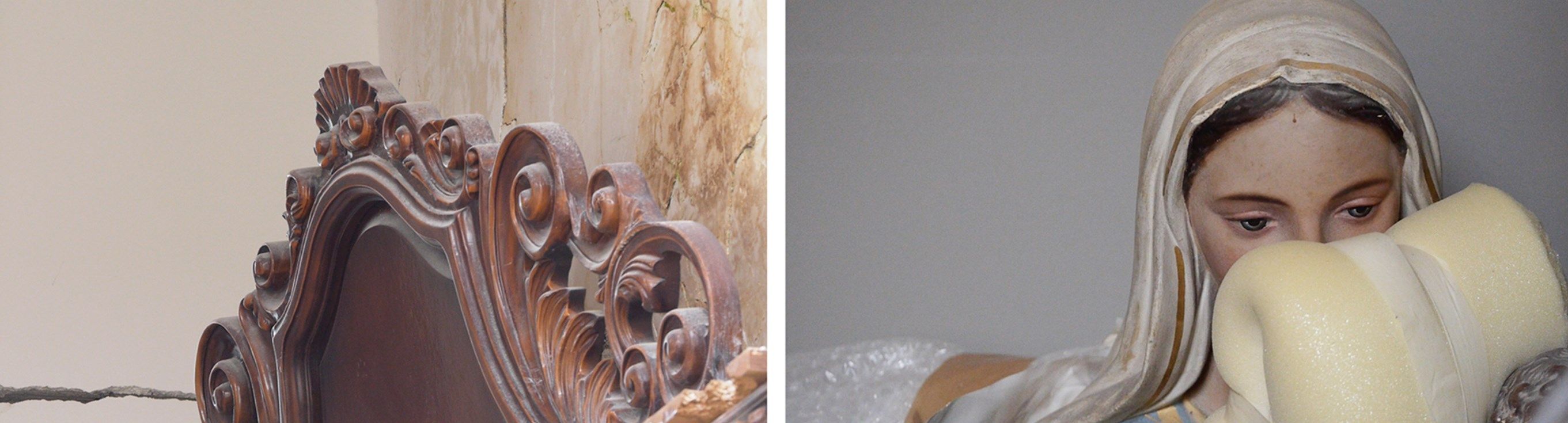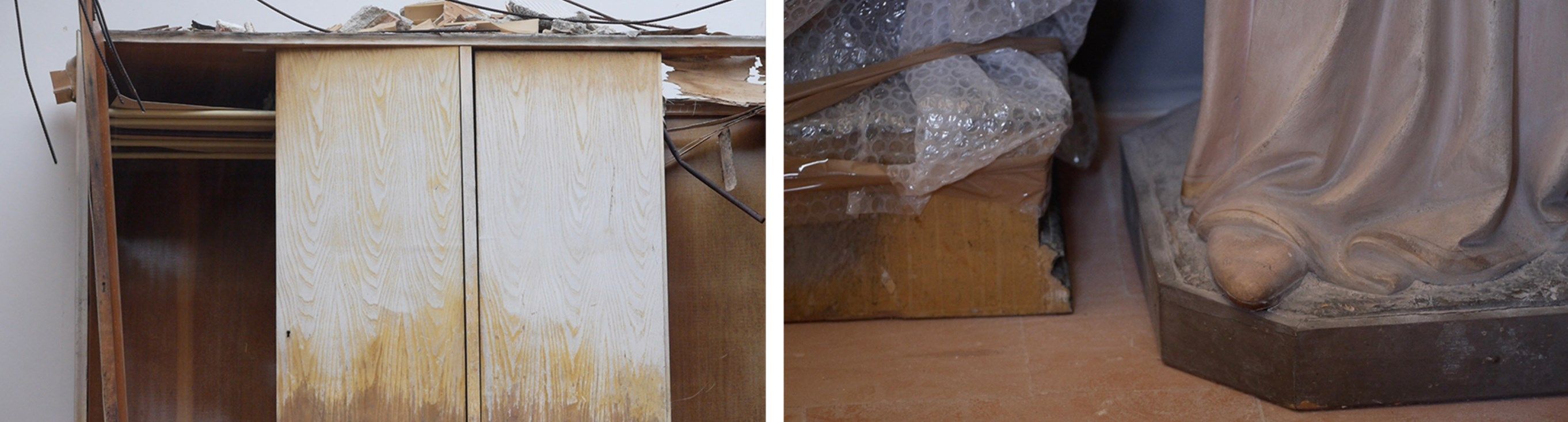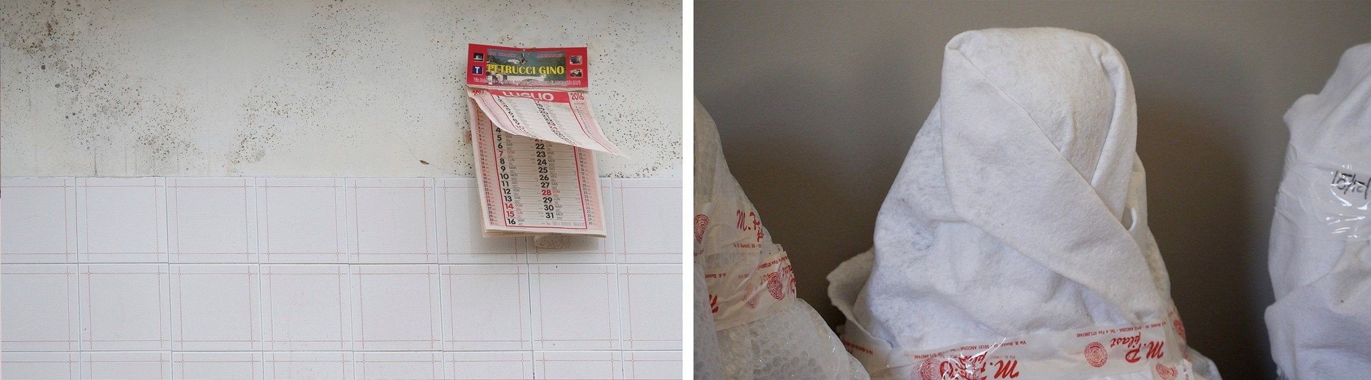 Lo sguardo di Petra Noordkamp, infine, lavora direttamente sul “trauma”, si posa sui segni del passaggio e dell’interruzione improvvisa del tempo, sulla persistenza della memoria e sulle tracce che essa lascia. L'artista si concentra in un primo momento sul territorio di Arquata del Tronto e Visso, esplorando le abitazioni private distrutte ma ancora dense di oggetti, ai quali di donare attenzione, registrandone e preservandone la memoria. Noordkamp, il cui progetto è stato realizzato anche grazie al sostegno dell’Ambasciata dei Paesi Bassi, visita poi i magazzini di Ancona e San Severino Marche in cui sono custoditi centinaia di sculture e dipinti salvati dalle chiese devastate, ritraendoli imballati in carta da archivio e plastica a bolle.
