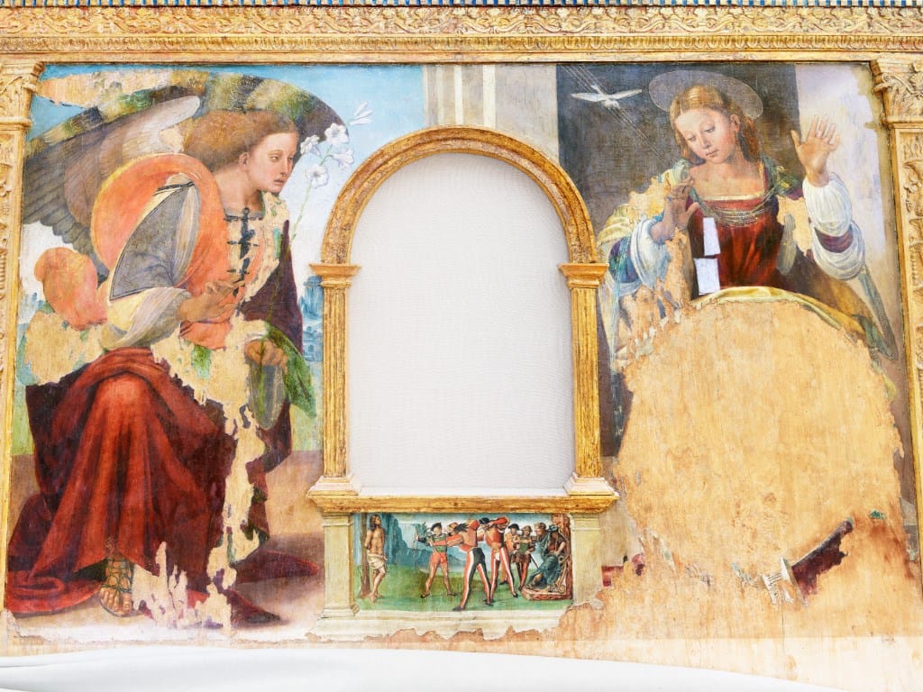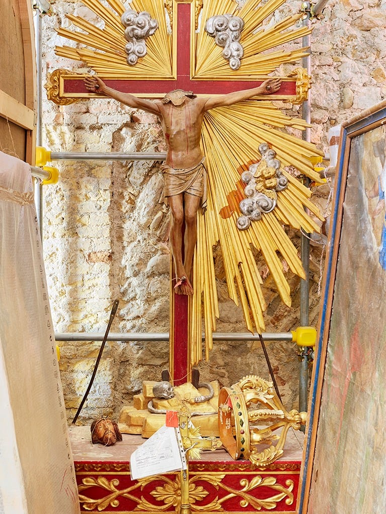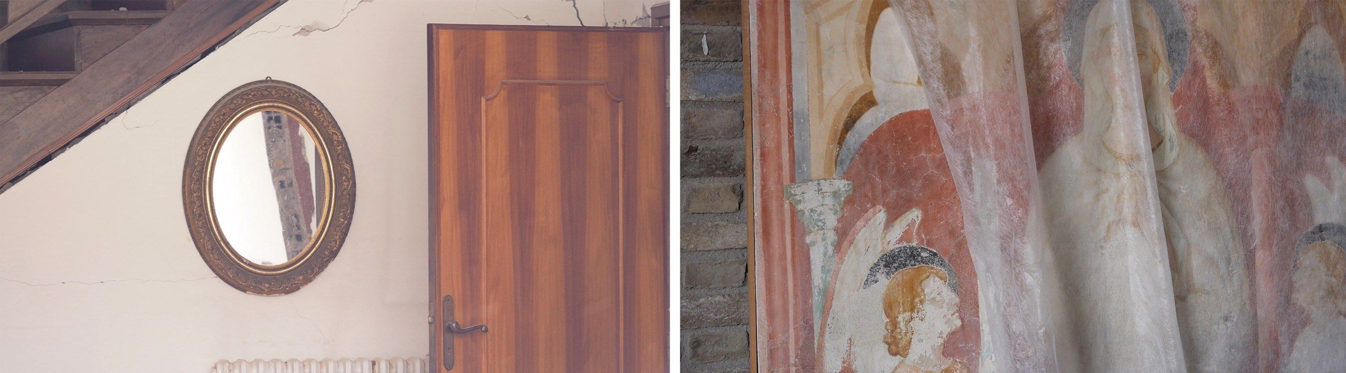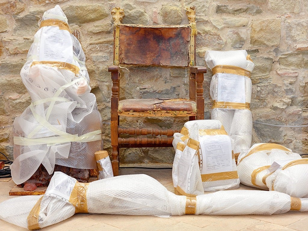 Lo sguardo di Petra Noordkamp, infine, lavora direttamente sul “trauma”, si posa sui segni del passaggio e dell’interruzione improvvisa del tempo, sulla persistenza della memoria e sulle tracce che essa lascia. L'artista si concentra in un primo momento sul territorio di Arquata del Tronto e Visso, esplorando le abitazioni private distrutte ma ancora dense di oggetti, ai quali di donare attenzione, registrandone e preservandone la memoria. Noordkamp, il cui progetto è stato realizzato anche grazie al sostegno dell’Ambasciata dei Paesi Bassi, visita poi i magazzini di Ancona e San Severino Marche in cui sono custoditi centinaia di sculture e dipinti salvati dalle chiese devastate, ritraendoli imballati in carta da archivio e plastica a bolle.