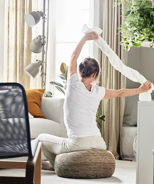 Diverse anche le proposte per creare un piccolo angolo dedicato al fitness, a una pausa relax o di meditazione. Il morbido pouf SANDARED si può trasformare in una palla fitness e un asciugamano in una fascia per gli esercizi. Per i più addicted il tappetino pieghevole PLUFSIG è un pratico salvaspazio da mettere via appena terminata la propria pratica. Una volta ritagliato un po' di spazio non resta che sdraiarsi e iniziare l'attività.