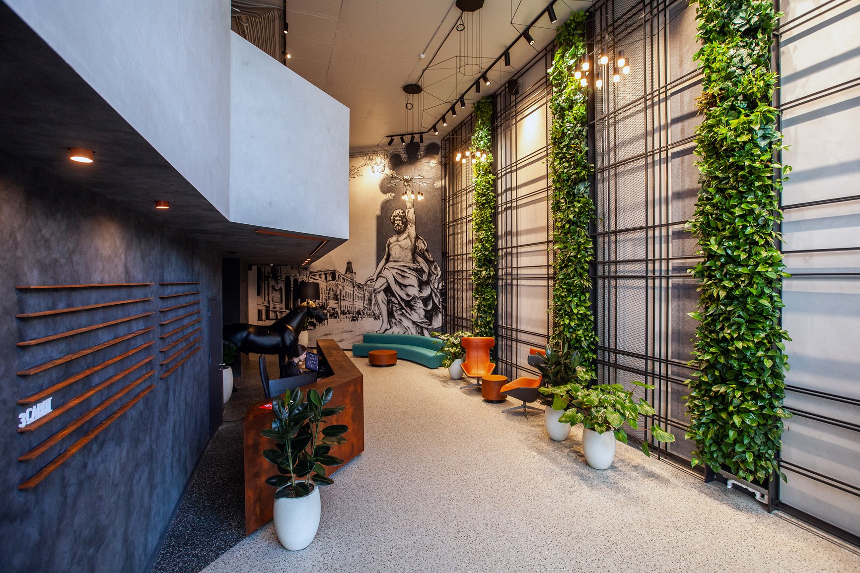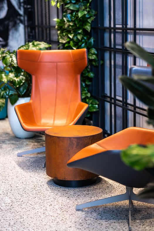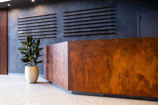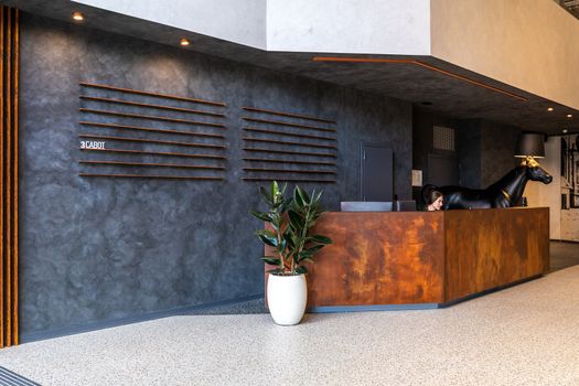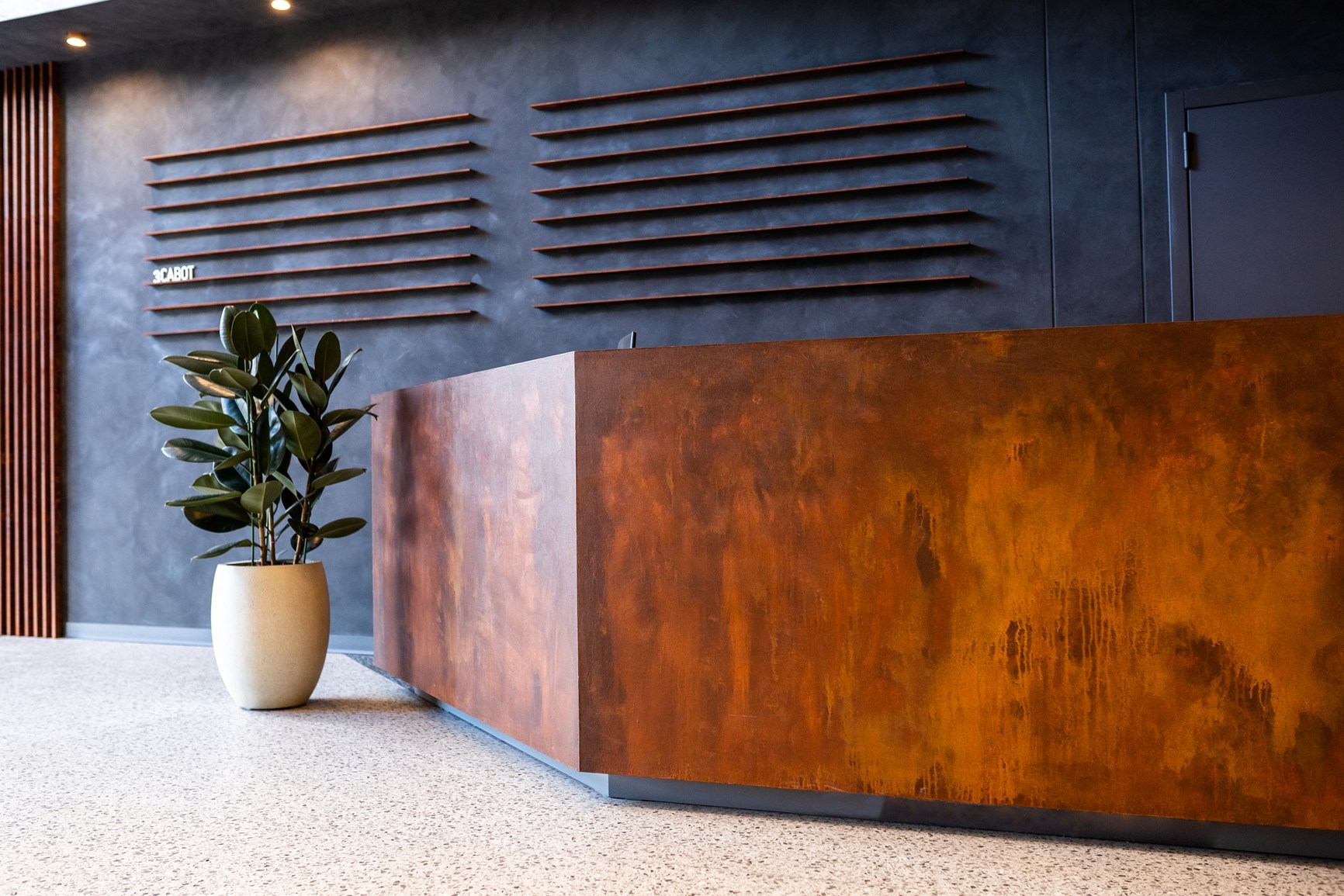 A Jauna Teika, Oxydecor® è stato utilizzato per rivestire mensole, tavolini, e bancone reception. Inoltre, le sue inconfondibili tonalità marrone-rossastro decorano anche i profili degli ascensori – creando un piacevole gioco di richiami cromatici e materici con gli elementi di arredo.