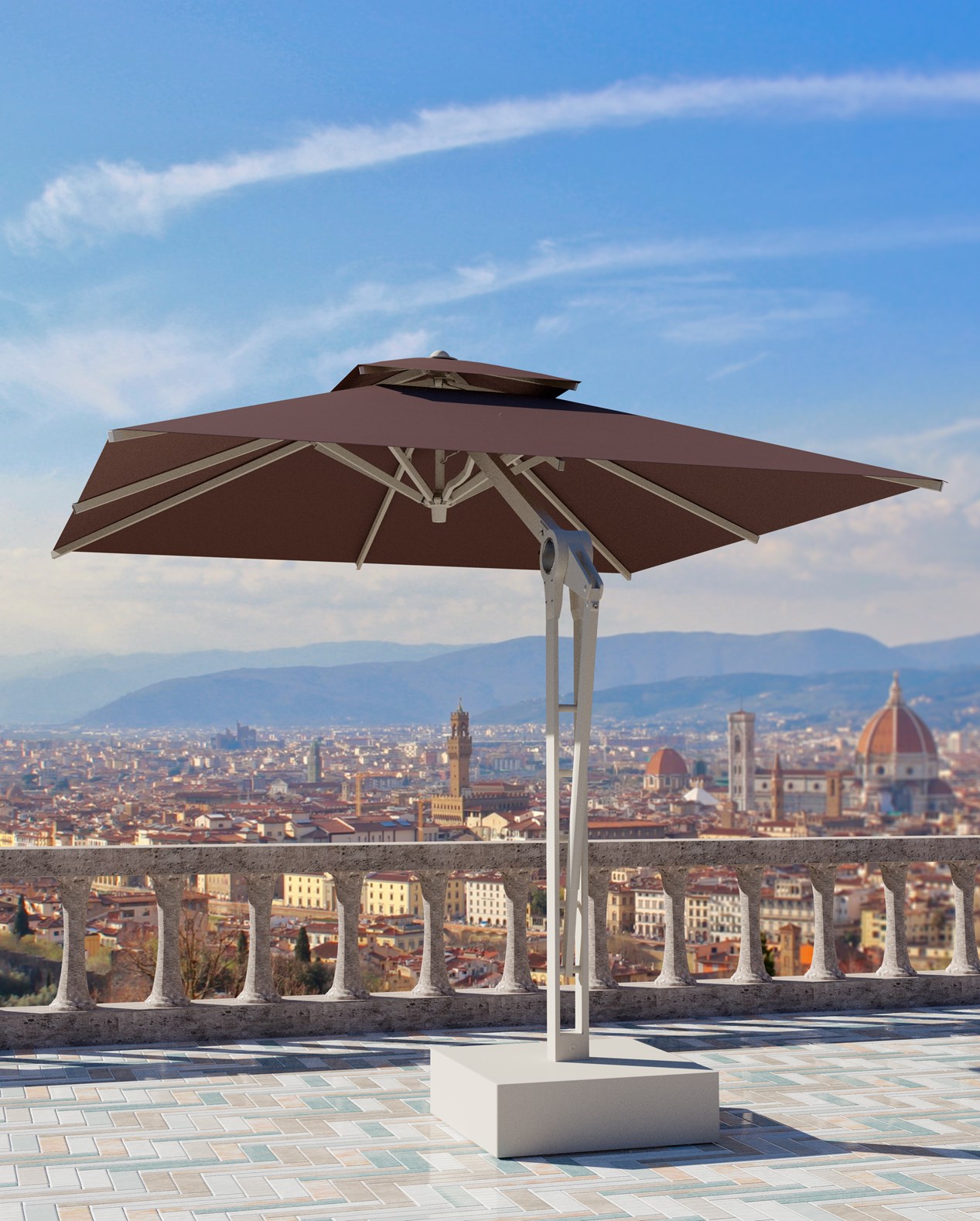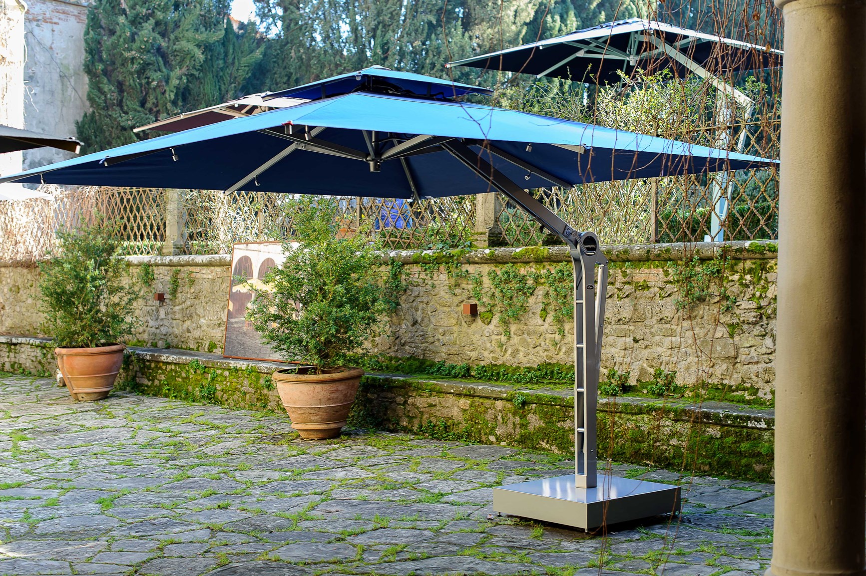 Poggesi propone una vasta gamma di ombrelloni a palo centrale e laterale interamente personalizzabili cromaticamente sia nel telo che nella struttura portante, come in una vera e propria bottega artigiana. Tutti gli ombrelloni sono realizzati in alluminio e acciaio inox della miglior qualità, rivestiti con polveri termoindurenti a base di poliestere: sono proprio queste polveri che ne consentono la varietà cromatica e ne assicurano una elevata resistenza alla corrosione, durabilità e robustezza.