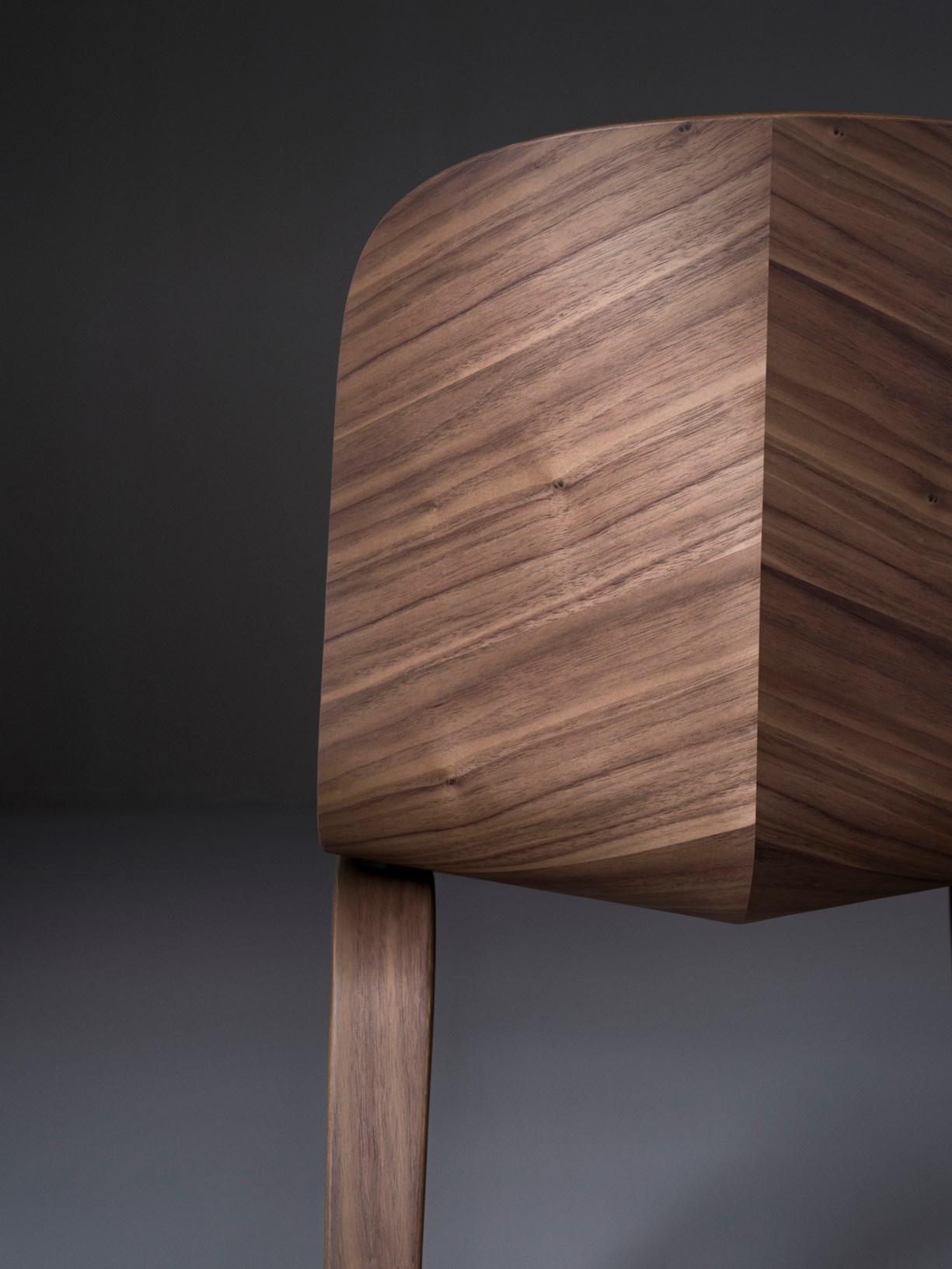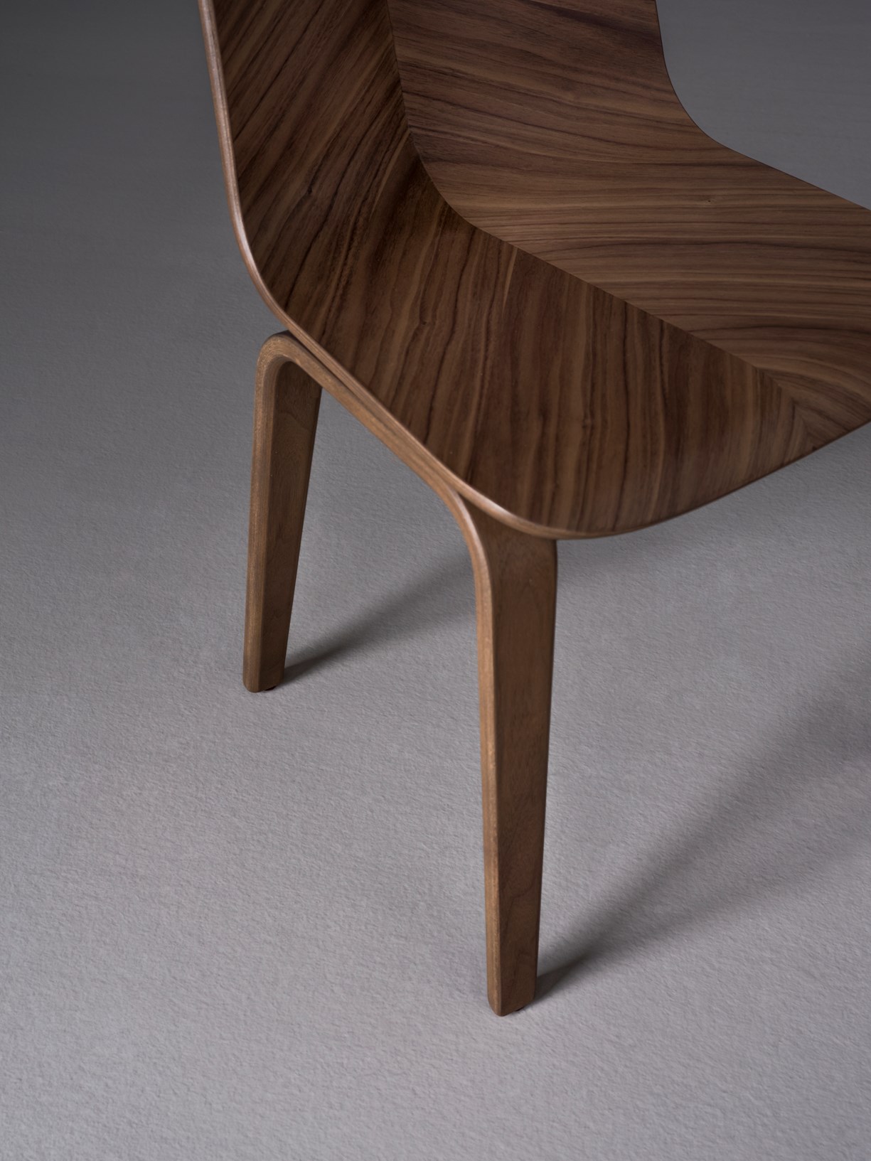 Elemento caratteristico di tutta la collezione eÌ€ l’avvolgente scocca in legno multistrato curvato, che si compone di due parti distinte speculari tra loro. Una scelta che determina una particolare profonditaÌ€ della curvatura e omaggio al tema della simmetria.