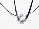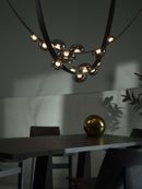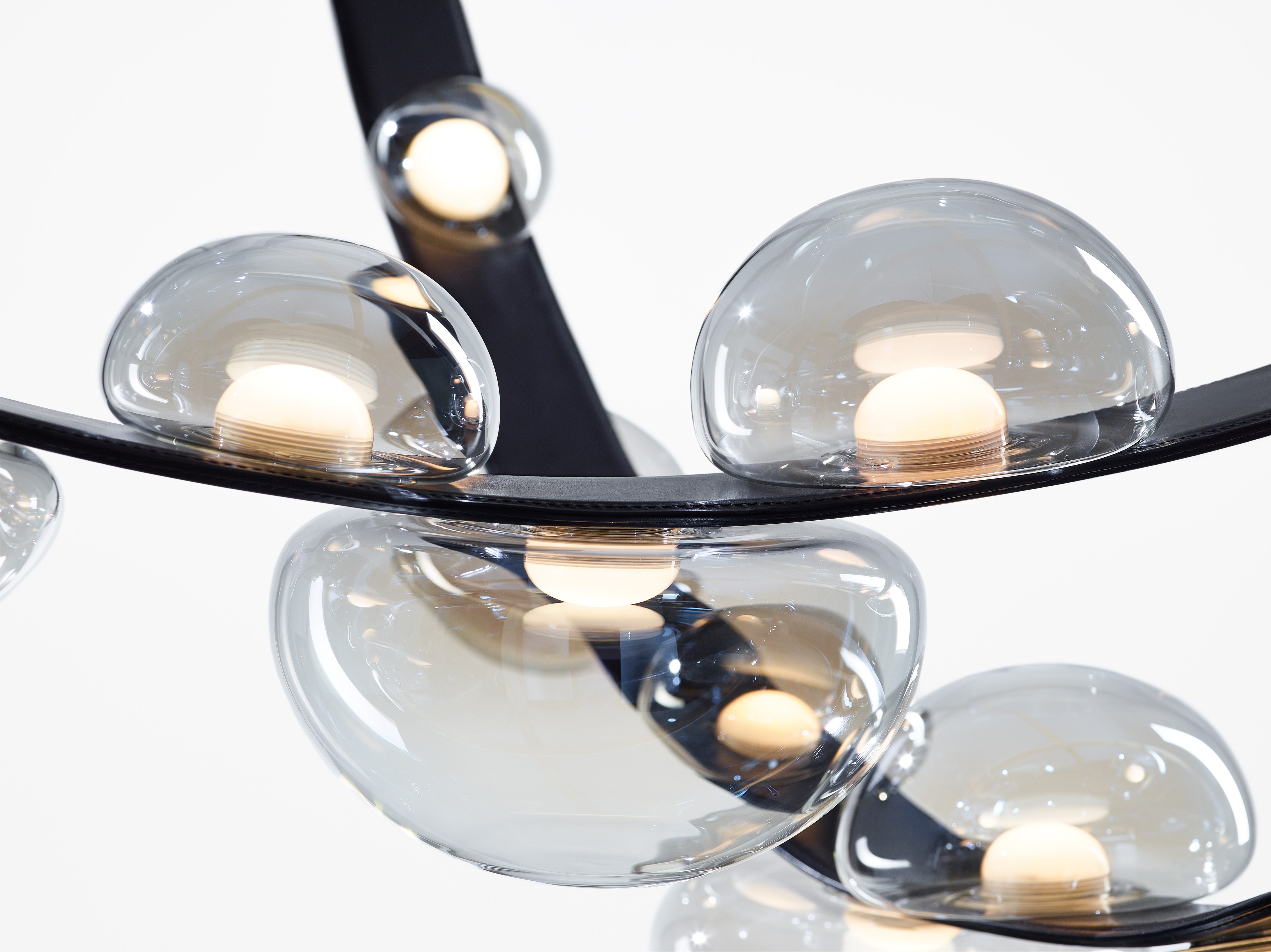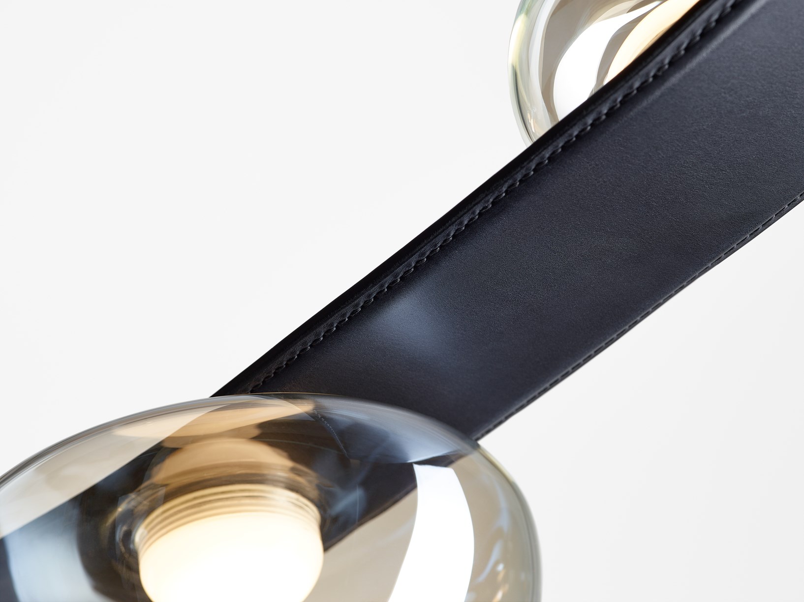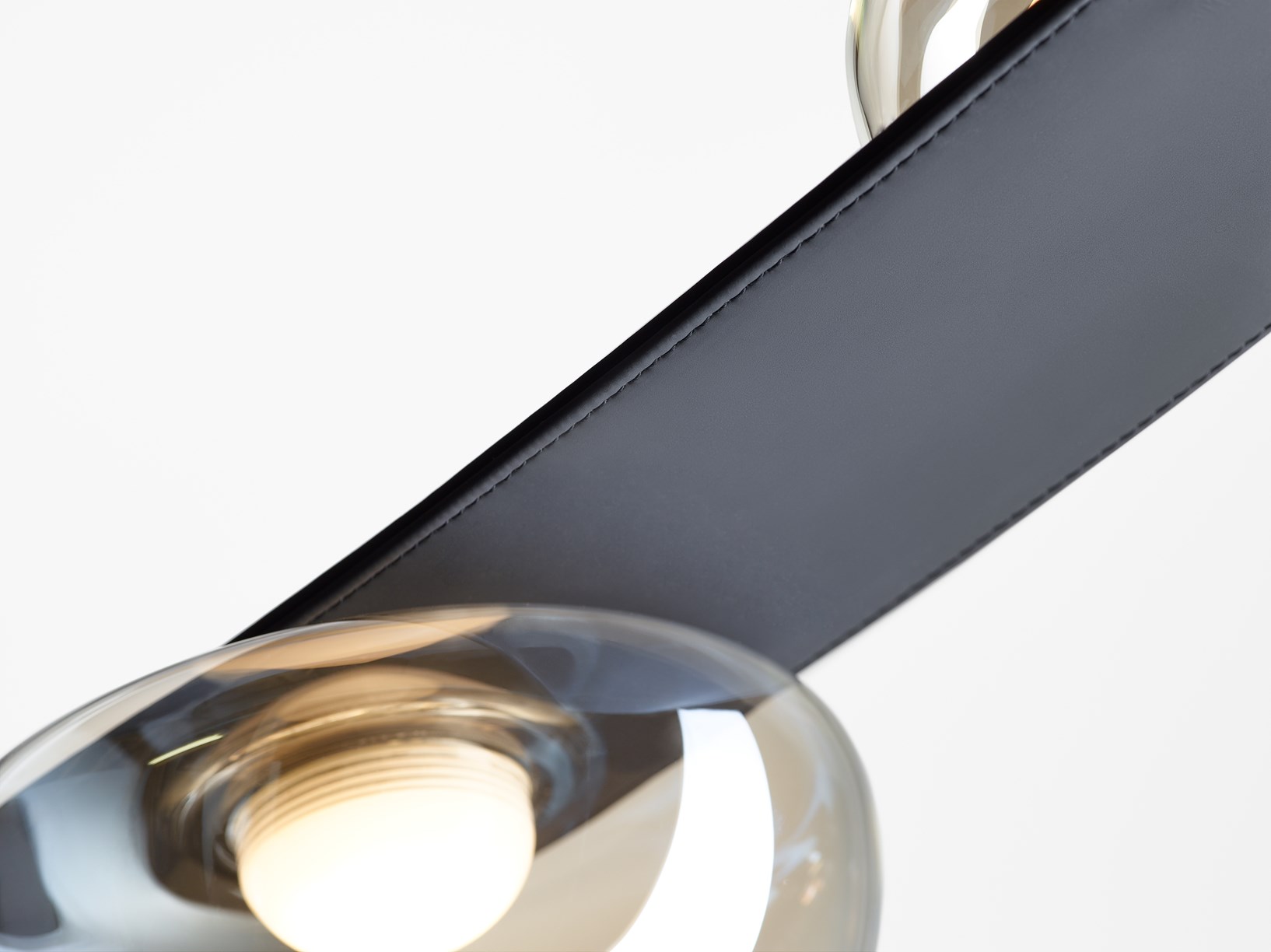 Gli elementi di cristallo dalla sfumatura color madreperla aderiscono perfettamente alle strisce in cuoio o materiale sintetico cucite a mano, illuminate dalla sorgente luminosa interna. La collezione consente numerose possibilità compositive sospese nello spazio.