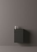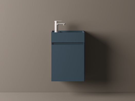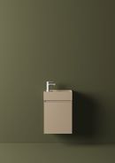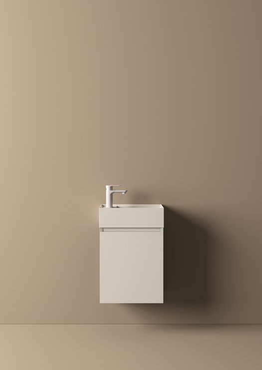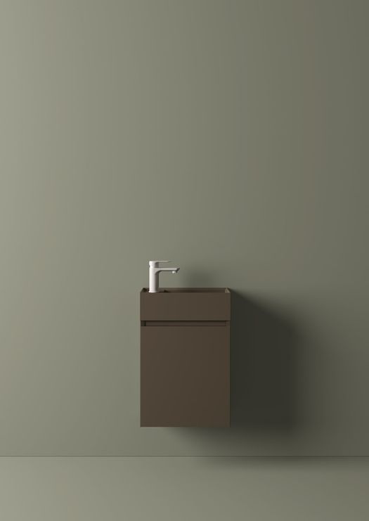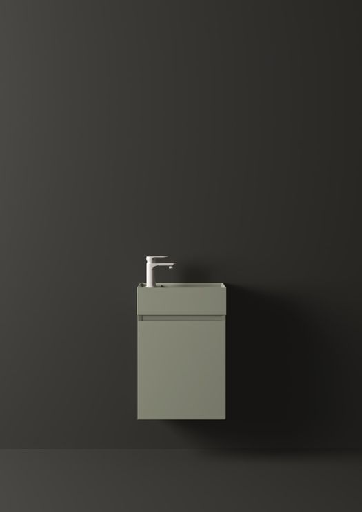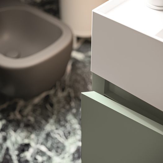 Il lavabo integrato, lineare ed essenziale, viene proposto in mineralguss bianco lucido o opaco, o in 15 versioni matt colorate - dove spiccano nuove ricercate cromie come il blu denim, il verde salvia e il verde felce - per creare composizioni ton-sur-ton o interessanti abbinamenti con la base sottostante.