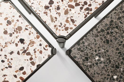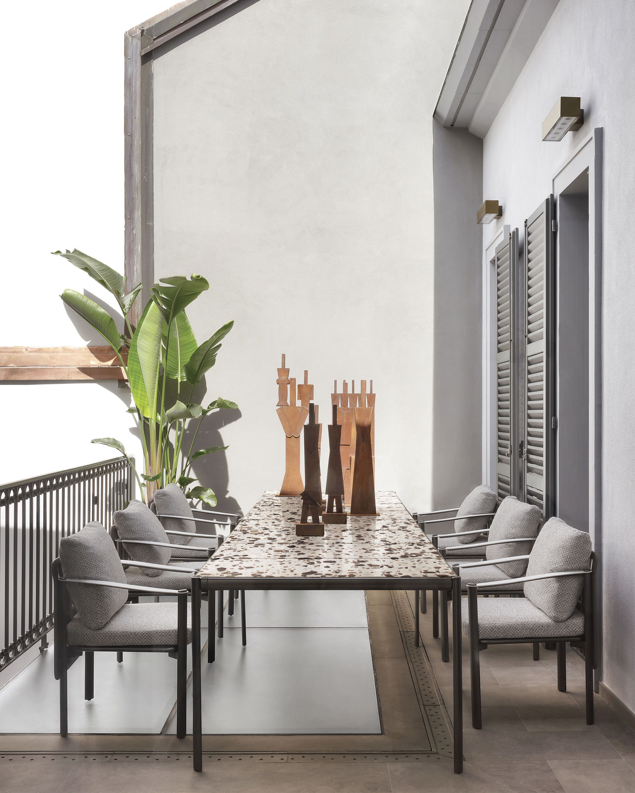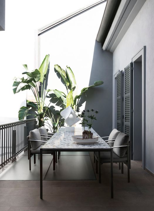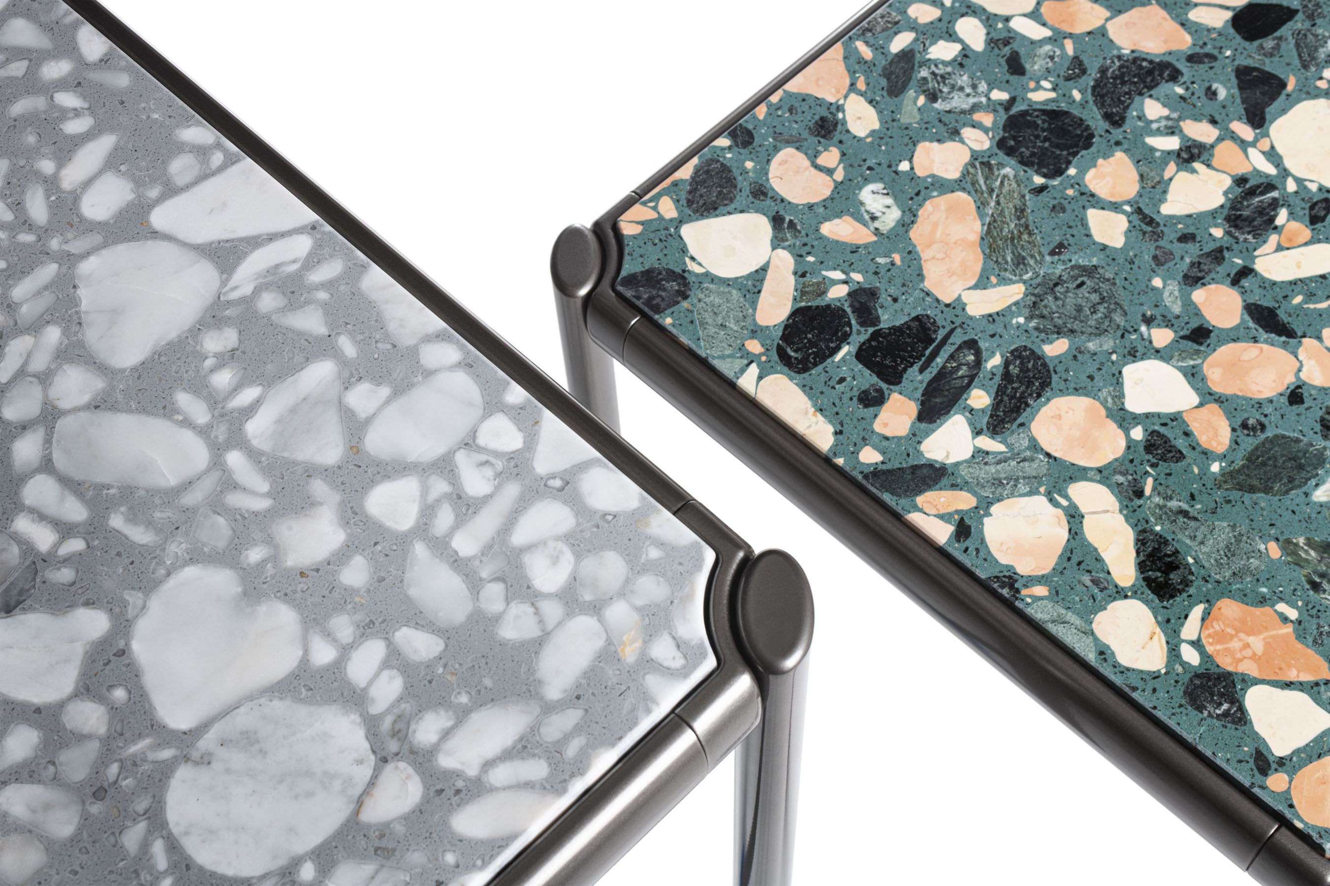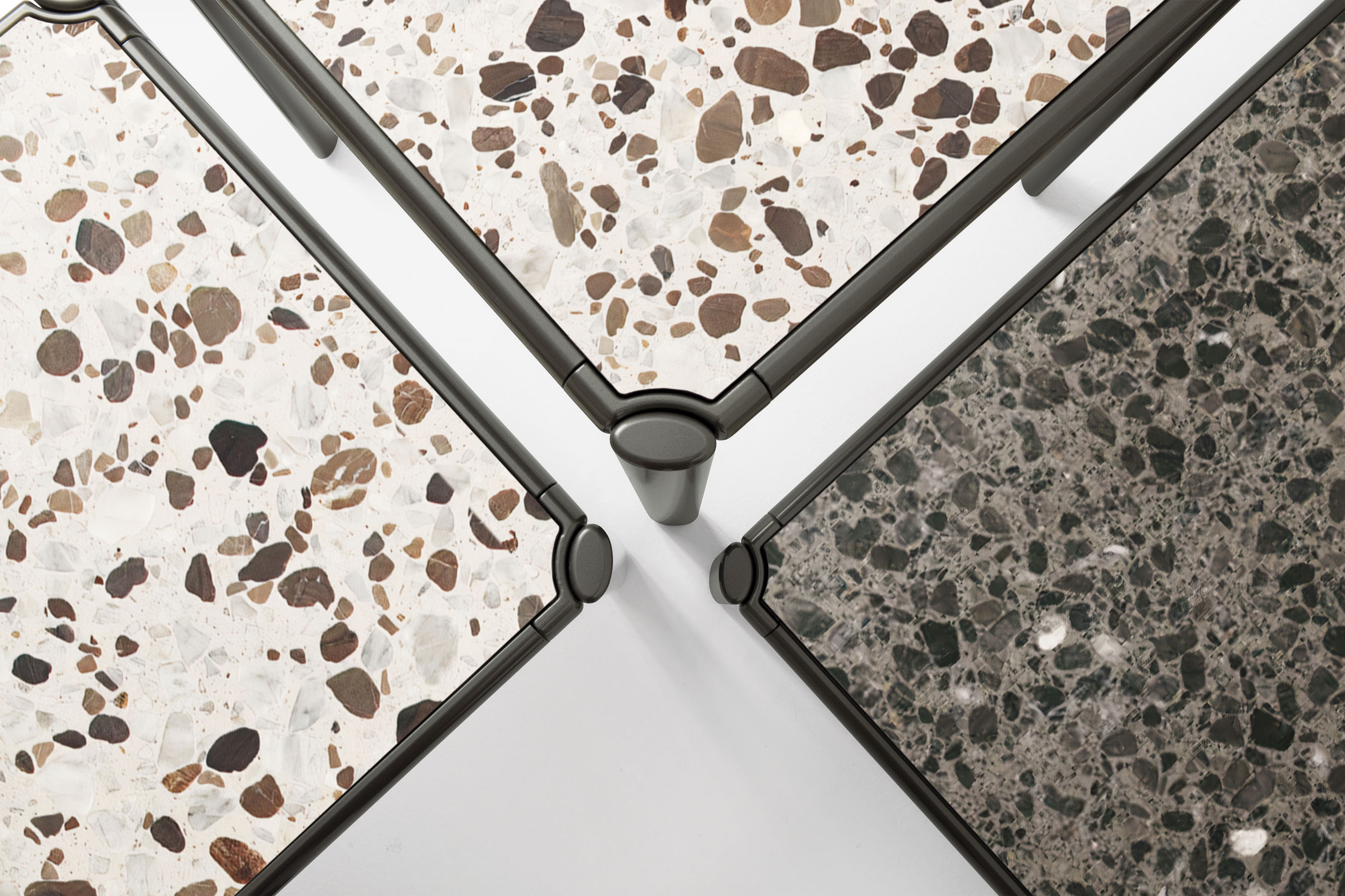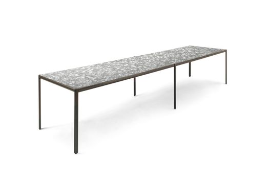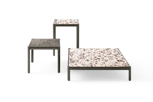 I tavoli e tavolini Aldìa, con le loro superfici disegnate da frammenti di pietre naturali, rimandano a una naturalità ancestrale. La leggera struttura in metallo verniciato finitura pewter incornicia il top disponibile nella versione palladiana, formata da frammenti di marmo travertino noce annegati in una mescola di polvere di marmo e graniglia, nelle varianti tufo e calcare.