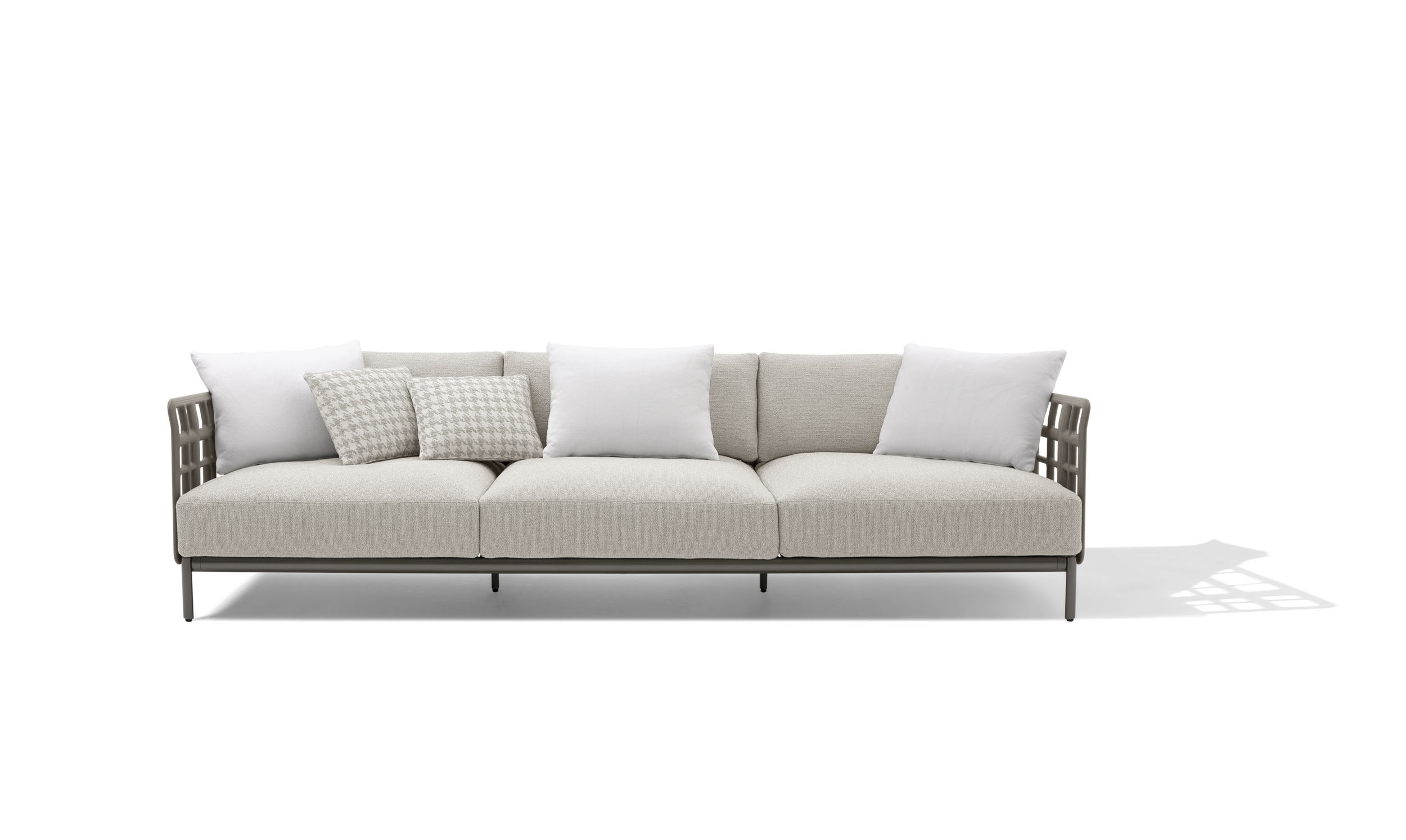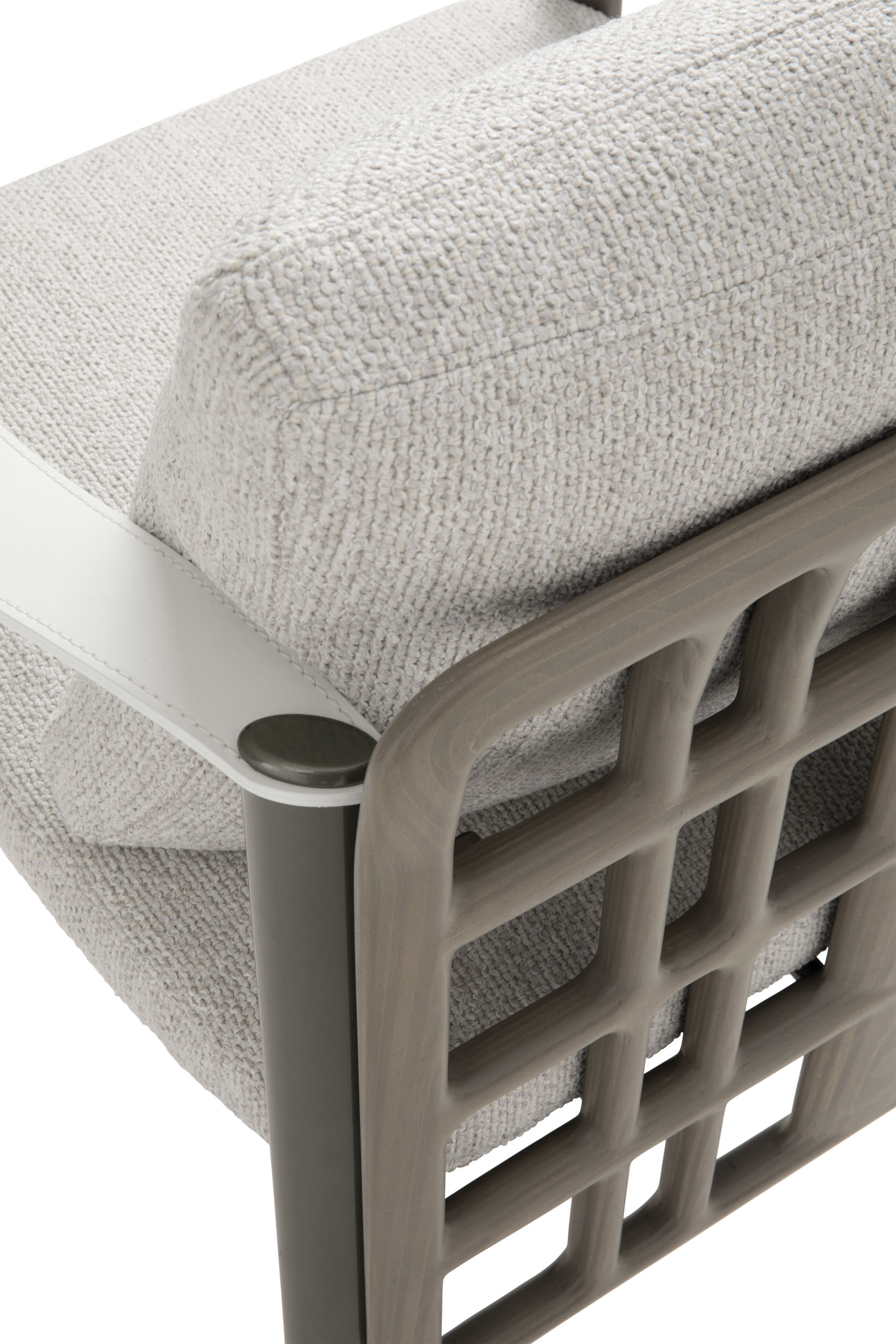 I braccioli del divano sono realizzati come lo schienale; quelli della poltroncina Aldìa, invece, sono in gomma EVA polimero idrorepellente, ideale per l’utilizzo all’aria aperta, disponibile nei colori bianco, sabbia, testa di moro, mattone, blu bally, grigio.