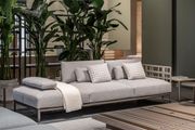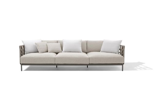 Differenti moduli, con base in metallo verniciato, permettono di configurare il divano da giardino Aldìa dando vita a numerose composizioni che possono essere integrate anche da elementi di appoggio. I moduli del divano possono inoltre essere utilizzati come pouf, singolarmente o aggregati in diverse configurazioni.