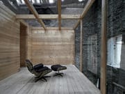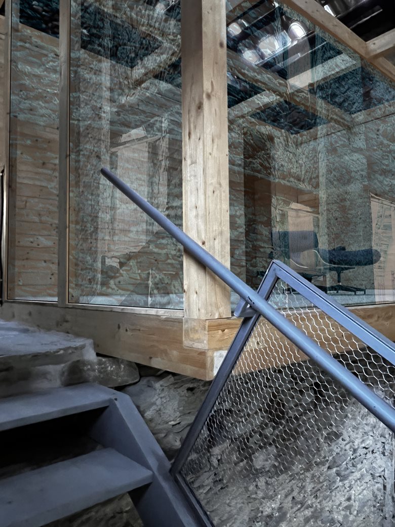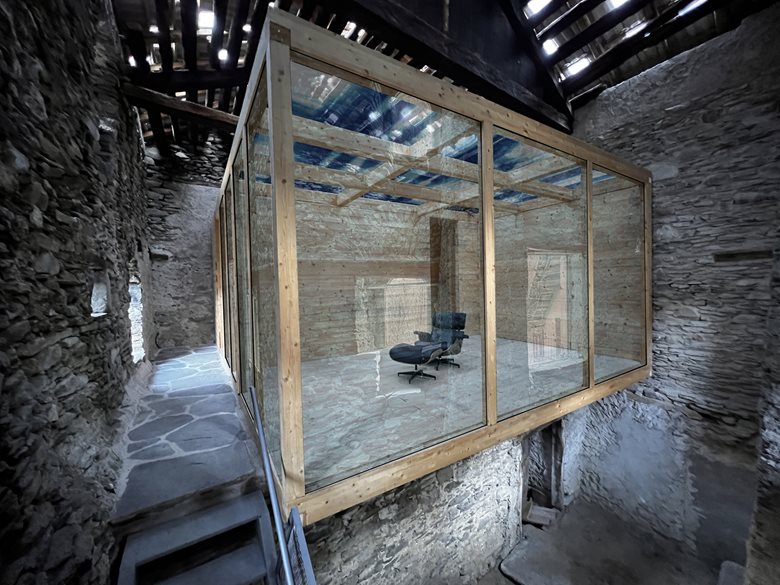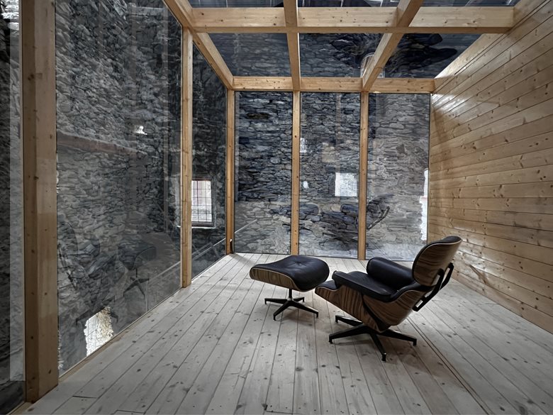 Al suo interno, l’architetto Castellino ha introdotto un volume indipendente in legno lamellare e vetro, una sorta di capsula abitativa sospesa nello spazio a pochi centimetri dal suolo, leggermente a sbalzo, e accessibile tramite una leggera scala metallica idealmente retraibile. La nuova struttura, pur completamente autonoma rispetto all’involucro preesistente, dialoga con esso attraverso un sottile equilibrio tra contrasto materico e continuità spaziale.