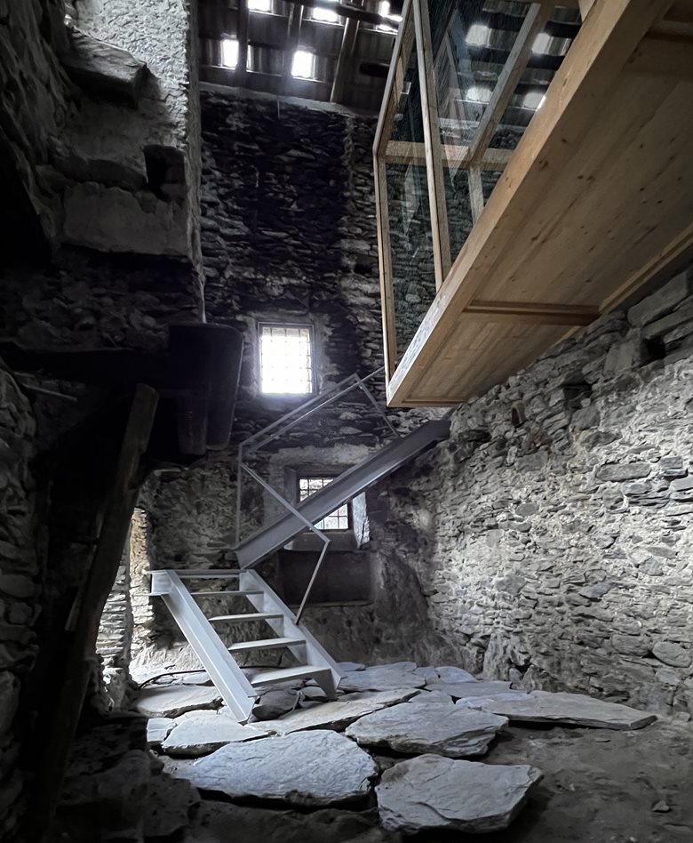 Il manufatto versava in uno stato di parziale abbandono: gli orizzontamenti interni erano crollati, lasciando un grande spazio vuoto a tutta altezza, dove permanevano tracce delle suddivisioni originarie e un imponente camino a tutt’altezza sulla parete di fondo. La struttura muraria in pietra a secco mostrava i segni del tempo, ma conservava intatta la forza espressiva della tradizione costruttiva locale.
