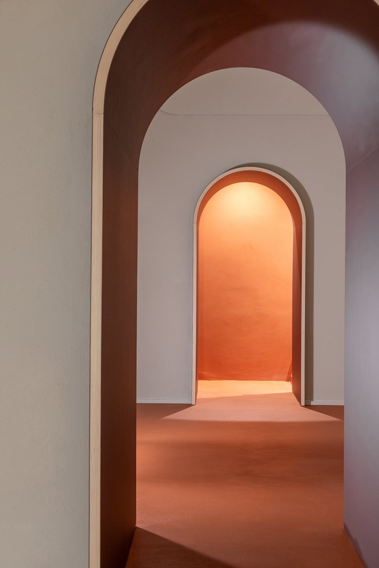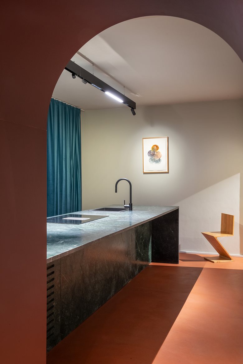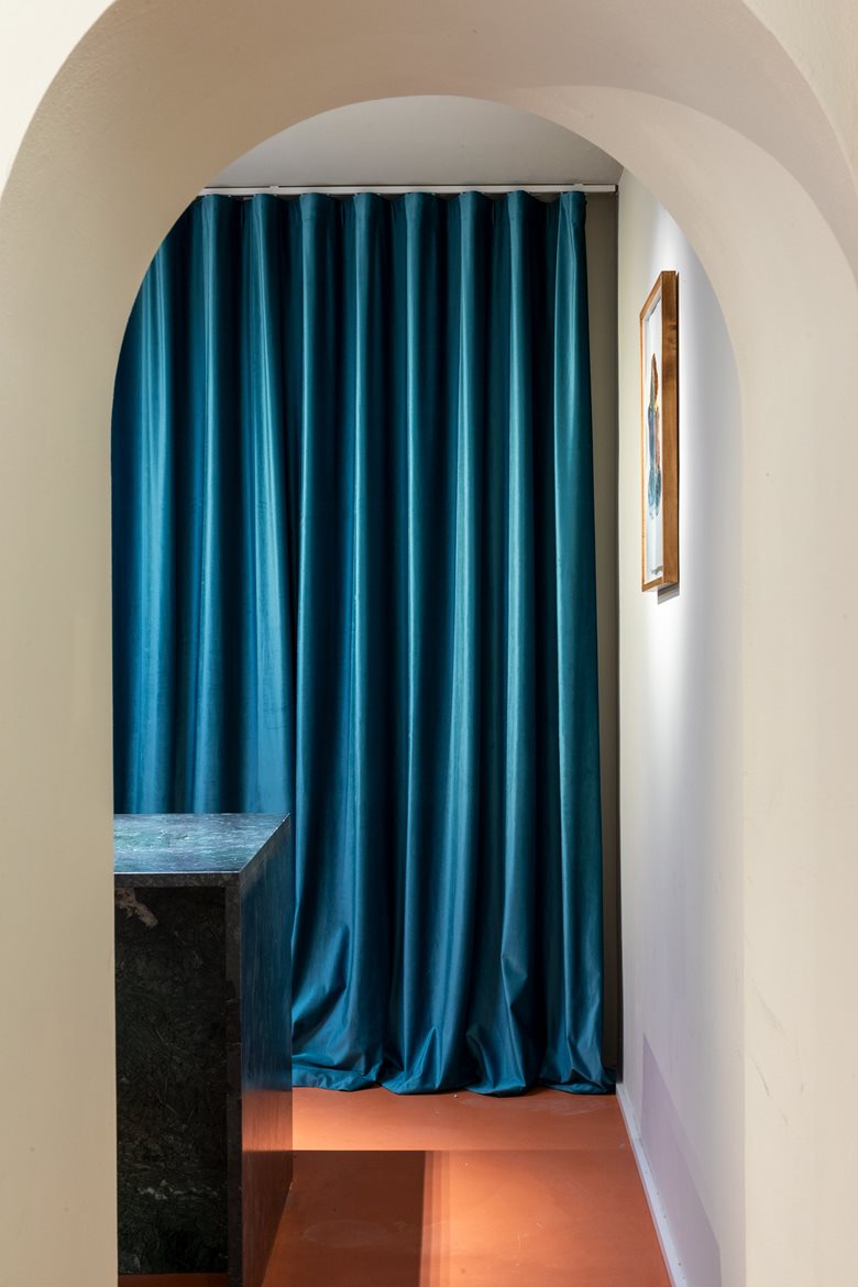 L’ingresso, pensato come soglia metafisica, è segnato da un portale in vetro e ferro nero. Una volta all’interno, si viene accolti in un involucro architettonico dinamico e flessibile: una sequenza di ambienti collegati da archi, omaggio all’archetipo romano, che si susseguono in un racconto continuo. Gli arredi su misura, disegnati dallo studio, si trasformano in scenografie funzionali: scrivanie, sedute, superfici operative e persino letti a scomparsa, tutti integrati in pannellature in legno chiaro.