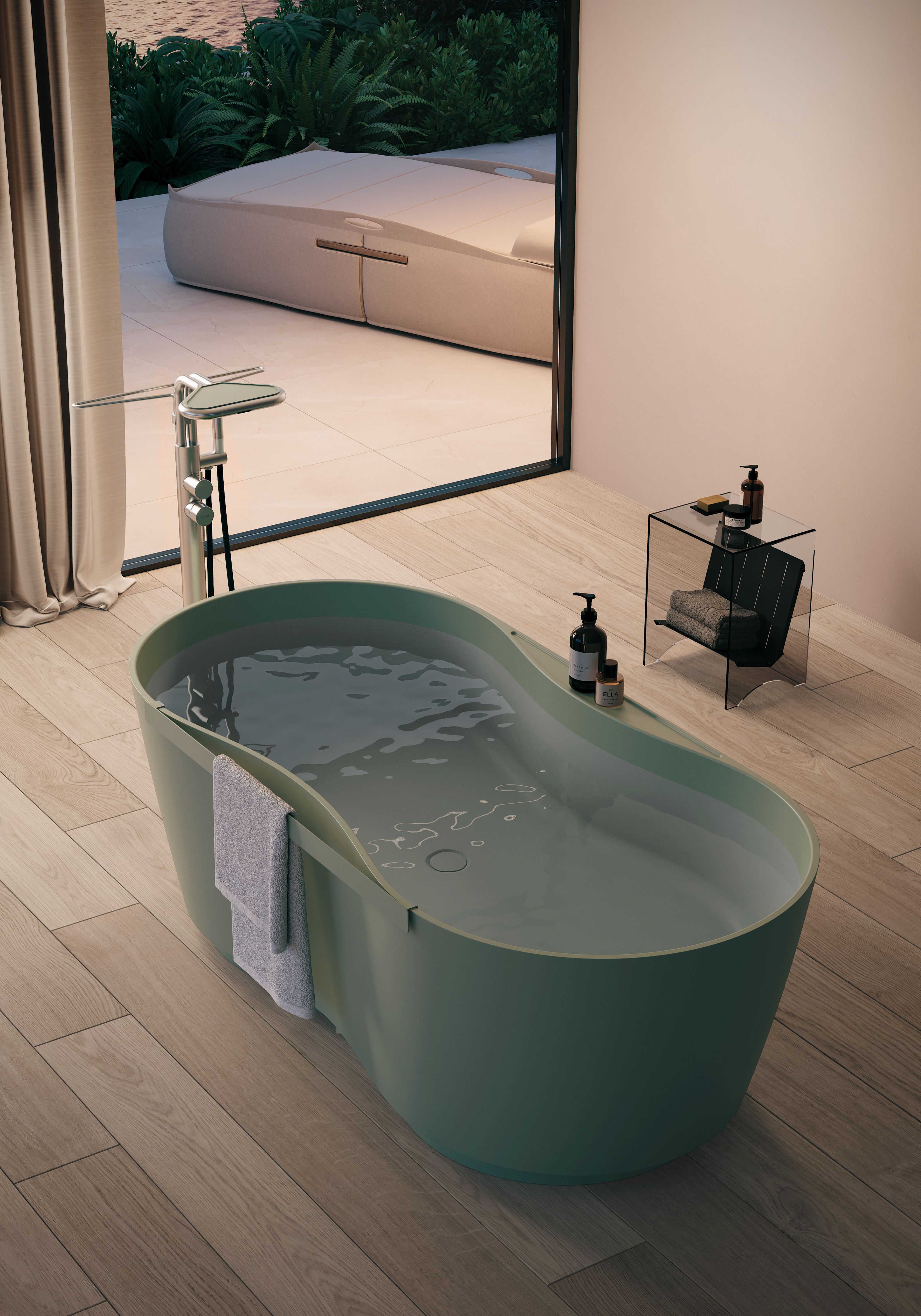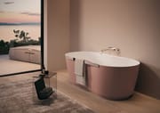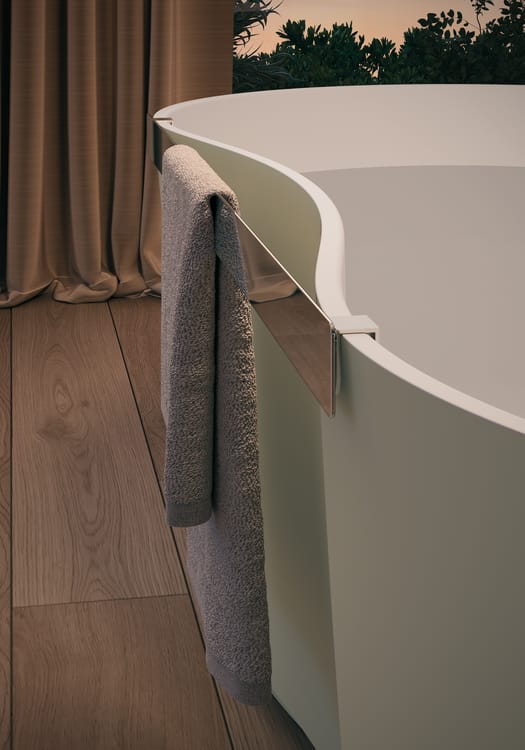Freestanding o appoggiata a parete, Domina si adatta armoniosamente a ogni ambiente grazie alle sue dimensioni contenute, offrendo flessibilità anche nel posizionamento della rubinetteria di carico. Elementi come il piano d'appoggio integrato e il maniglione porta asciugamani opzionale la rendono un prodotto che combina estetica e funzionalità, trasformando il bagno in un rituale di benessere quotidiano.