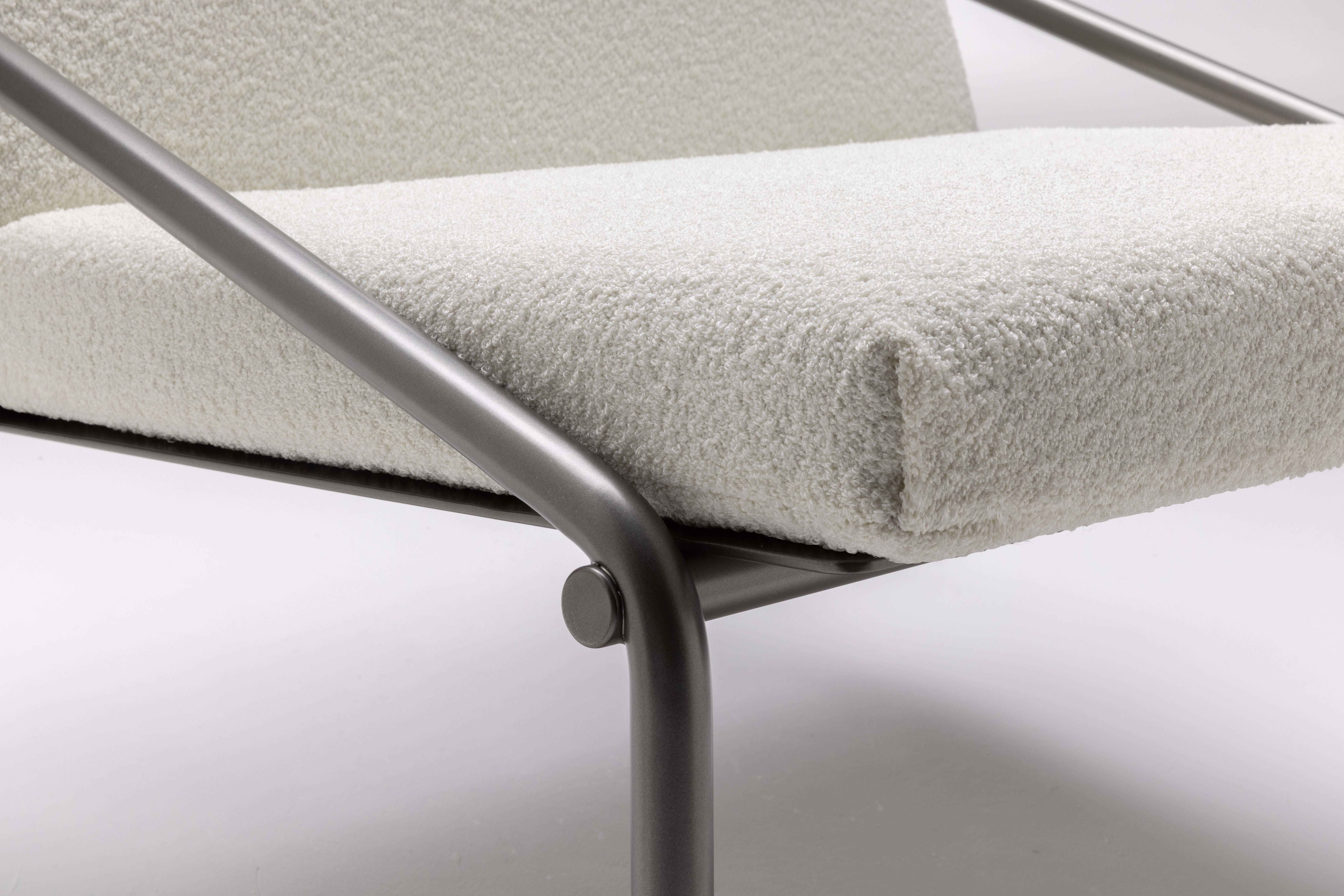 L’identico raggio di curvatura, applicato sia al tubolare d’acciaio delle gambe che alla seduta, crea un continuum visivo e formale, rafforzando l’armonia del progetto e dando il nome alla poltrona. Per incrementarne il comfort, è possibile aggiungere una sottile imbottitura, libera e indipendente, che amplia le possibilità d’uso e di interpretazione.