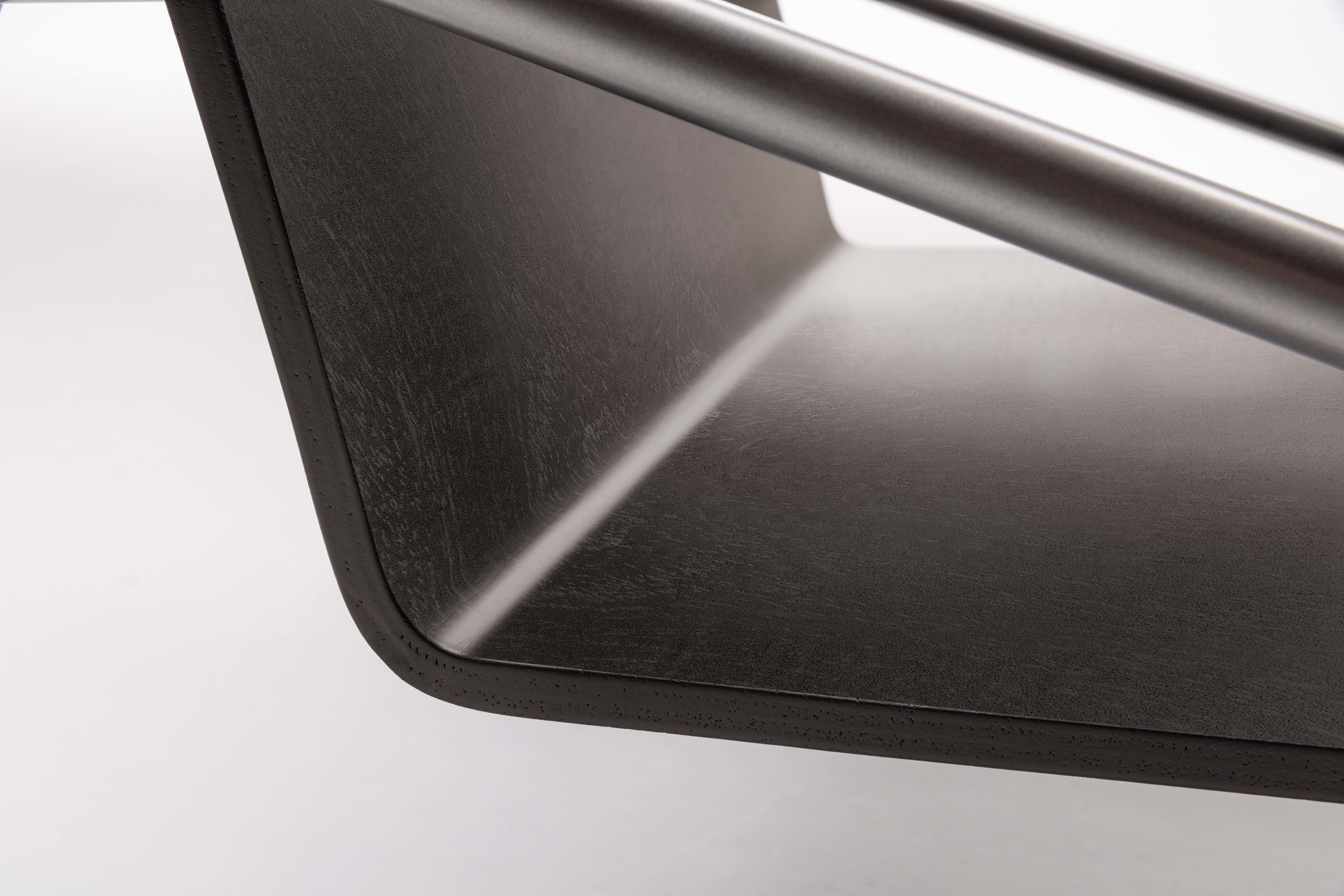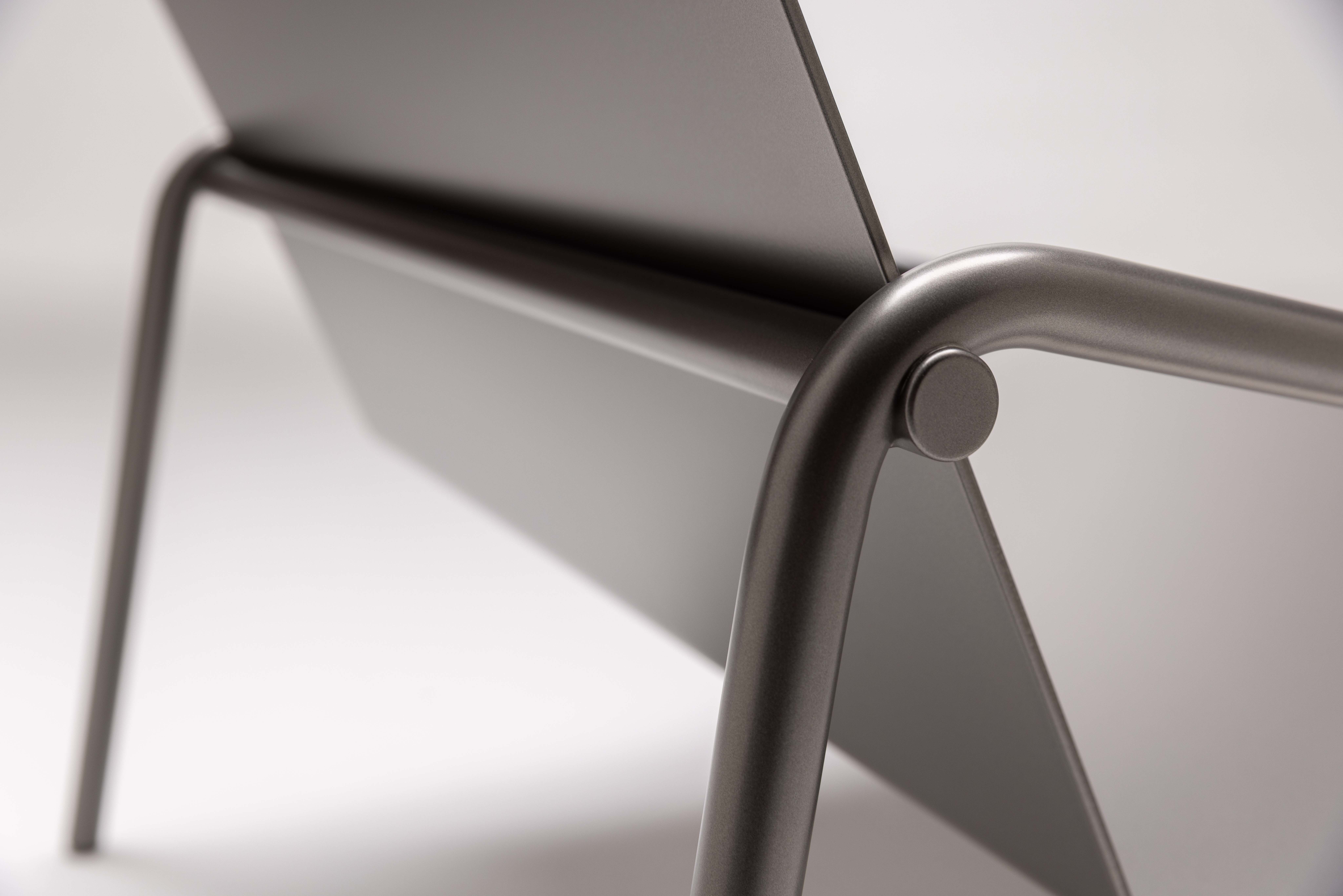 Il metallo, modellato attraverso la calandratura, si trasforma in un telaio essenziale in cui i nodi di connessione non vengono nascosti, ma messi in risalto come segni distintivi della struttura portante. Su questa architettura rigorosa e minimale si inserisce con naturalezza un foglio di alluminio, nella versione outdoor, oppure un multistrato curvato per quella indoor.