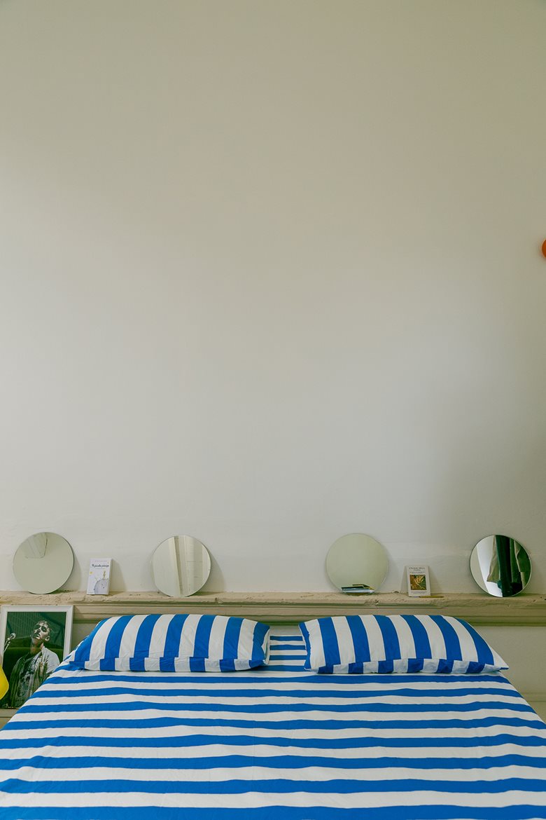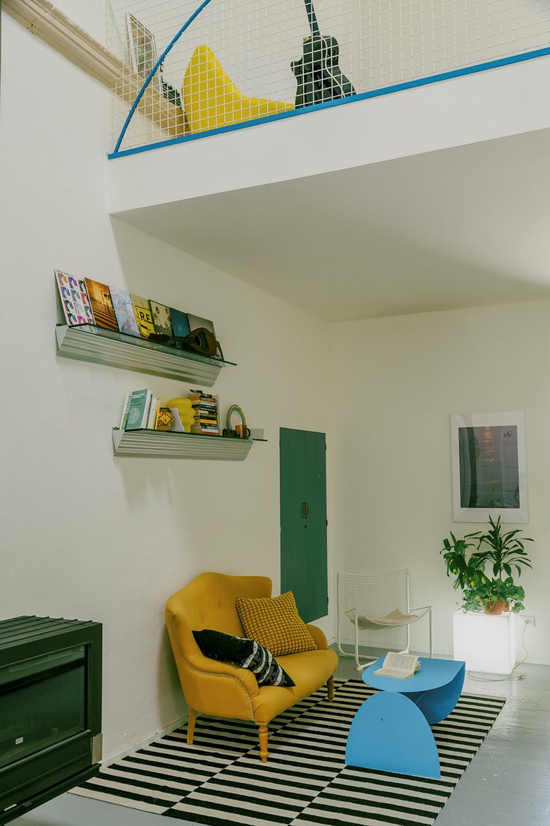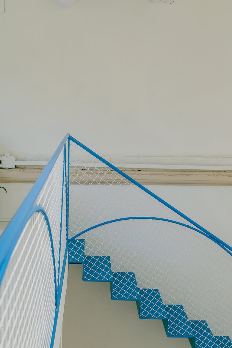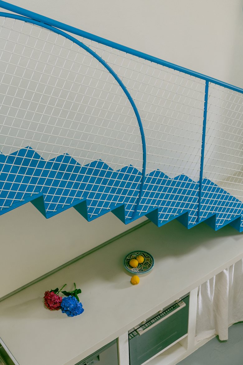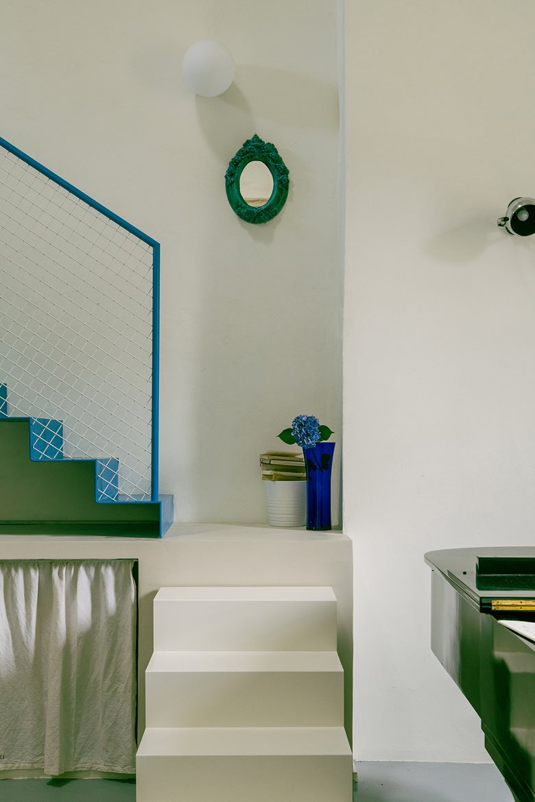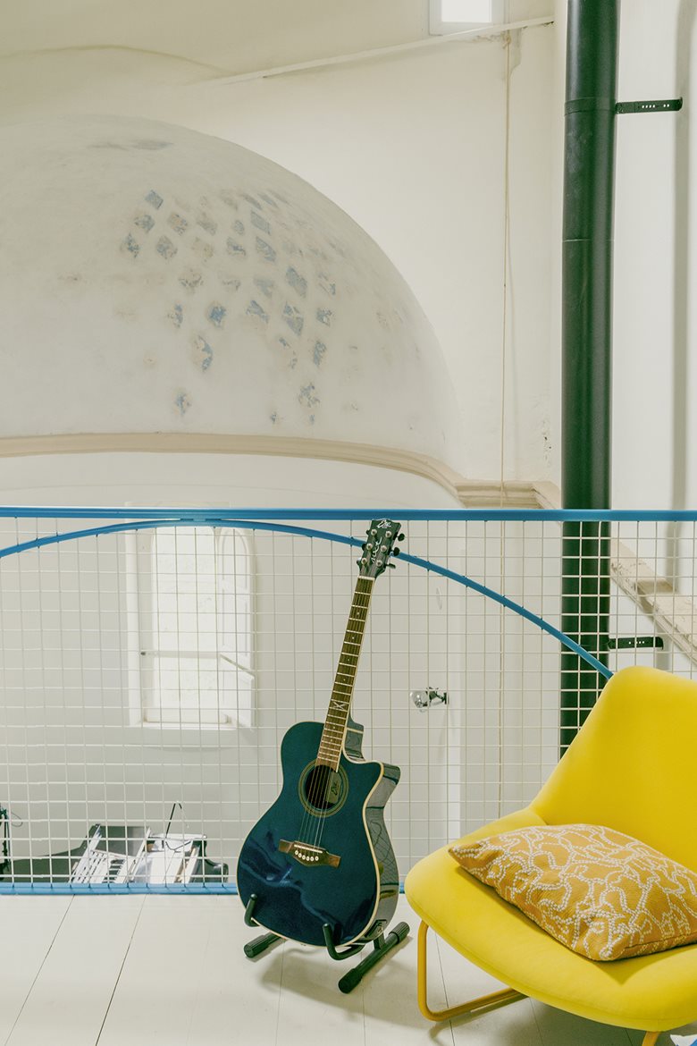 Il contrasto tra antico e nuovo si traduce anche in una palette cromatica vivace: l’azzurro della scala in ferro richiama un frammento di affresco nell’abside, mentre colori accesi per arredi e finiture restituiscono umanità e leggerezza all’ambiente.