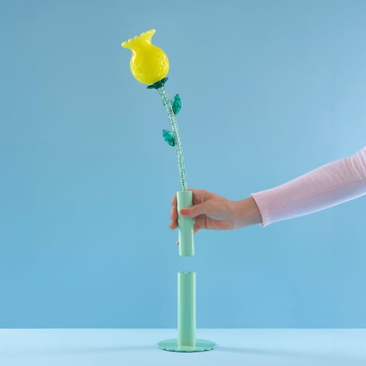 La collezione è proposta con vaso in vetro, elettrificato via cavo, in due misure: quella con dimensioni più piccole è adatta per uno o due steli, la più grande può accoglierne fino a cinque. È disponibile la lampada a batteria ricaricabile wireless, nascosta nel gambo, che estende le possibilità di utilizzo a tutti i contesti. In questa versione la luce è dimmerabile e si accende con un semplice tocco.