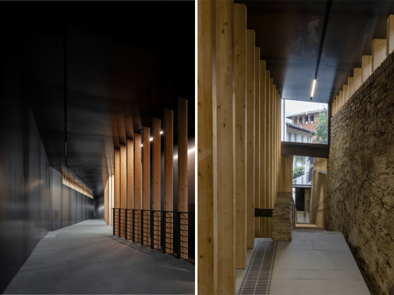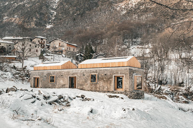 La struttura e i rivestimenti sono in legno locale di larice da filiera corta, materiale scelto per sostenere l’economia della Val di Susa e garantire durabilità ed efficienza energetica. L’edificio è inoltre dotato di stufe a biomassa e pannelli fotovoltaici per una completa autonomia dal punto di vista energetico. Il secondo edificio, soggetto a vincoli idrologici, è stato trasformato in una sequenza di corti pavimentate in legno, destinate ad attività culturali all’aperto come spettacoli, concerti e incontri. La volumetria di questo edificio sarà recuperata con un intervento ex-novo dedicato al wellness, attualmente in cantiere. Il progetto, sviluppato in collaborazione con l’Ecomuseo di Moncenisio, adotta un approccio essenziale e sostenibile, fondato su materiali naturali, risorse locali e un forte legame con il paesaggio alpino”.