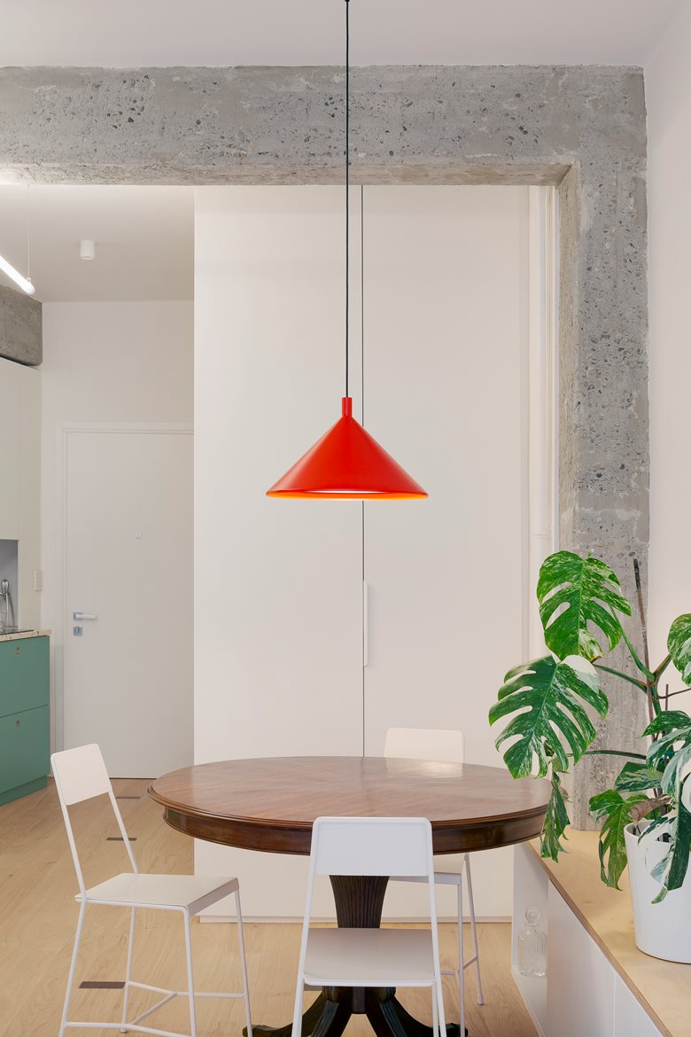 La pianta trapezoidale, le prospettive inusuali e il terrazzo a L hanno offerto il punto di partenza per un intervento che ha previsto la demolizione della partizione tra soggiorno e ingresso, creando un ampio open space con travi e pilastri in cemento a vista.