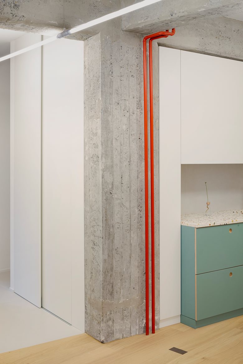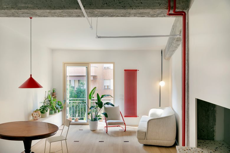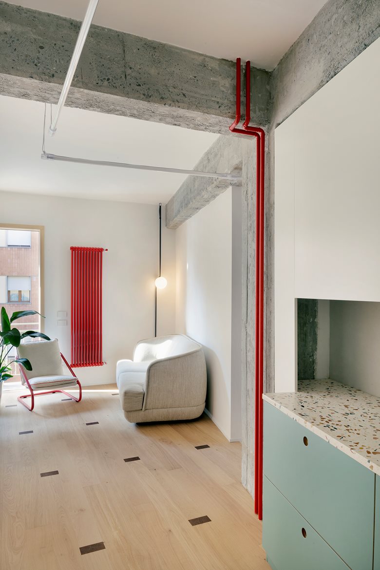 Il parquet in rovere chiaro è il filo conduttore del progetto. Nella zona giorno è posato a correre, con intarsi in legno scuro che creano geometrie delicate e punti visivi di equilibrio. Gli elementi tecnici, come termosifoni e tubi, diventano protagonisti grazie al colore rosso, che ritorna anche nelle luci e nella rubinetteria, trasformando dettagli funzionali in elementi giocosi.