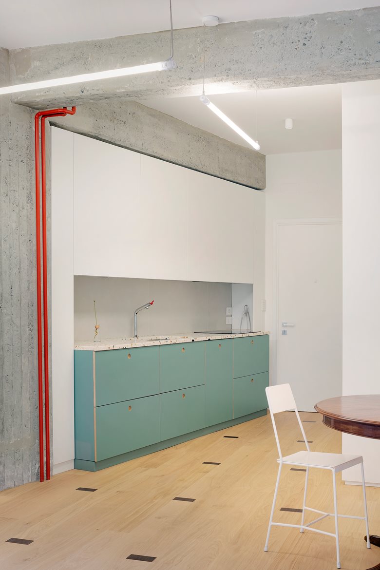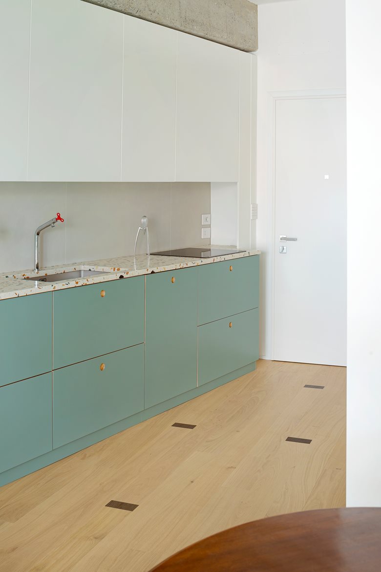 L’obiettivo principale era aggiungere una camera, esigenza nata con la nascita della figlia, e ridefinire gli spazi in modo funzionale senza compromessi. La cucina lineare, collocata subito dopo l’ingresso, con mobili verdi e piano in battuto policromo, si inserisce perfettamente sotto le travi a vista, mentre tre blocchi d’arredo — guardaroba, frigorifero e forno — sostituiscono il precedente ripostiglio.