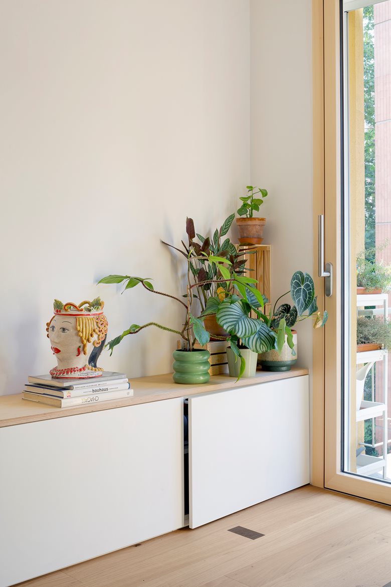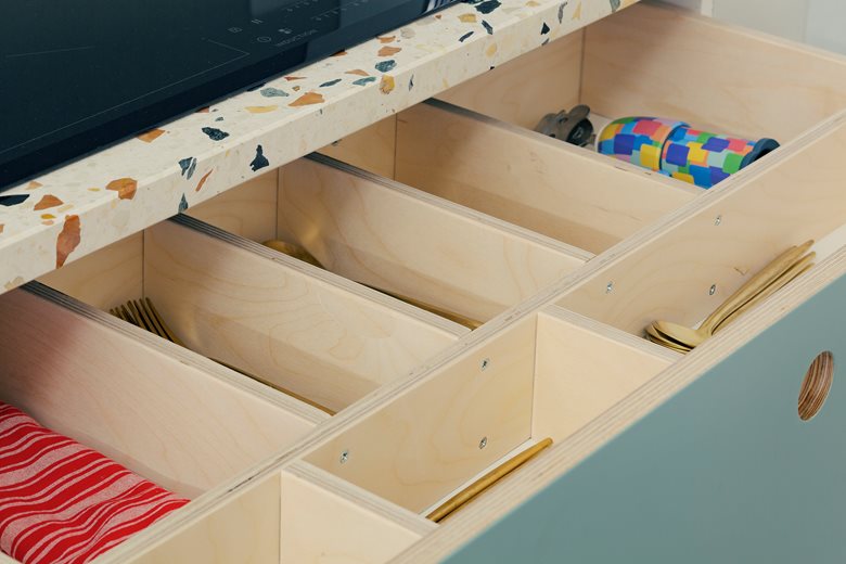 La betulla, con la sua tonalità chiara e materica, diventa la vera protagonista dei volumi della casa: la ritroviamo nella maniglia artigianale della cucina, nei cassetti, nel multistrato a vista dei mobili e nel top del bagno, fino alla camera padronale dove pavimento e schienale del letto in multistrato creano un continuum materico e funzionale, nascondendo il guardaroba senza necessità di armadiature tradizionali.