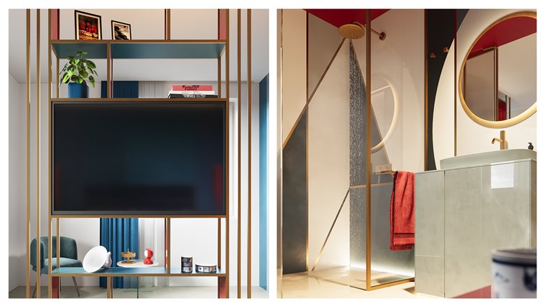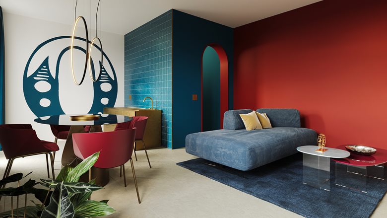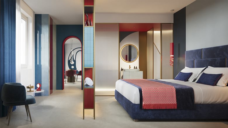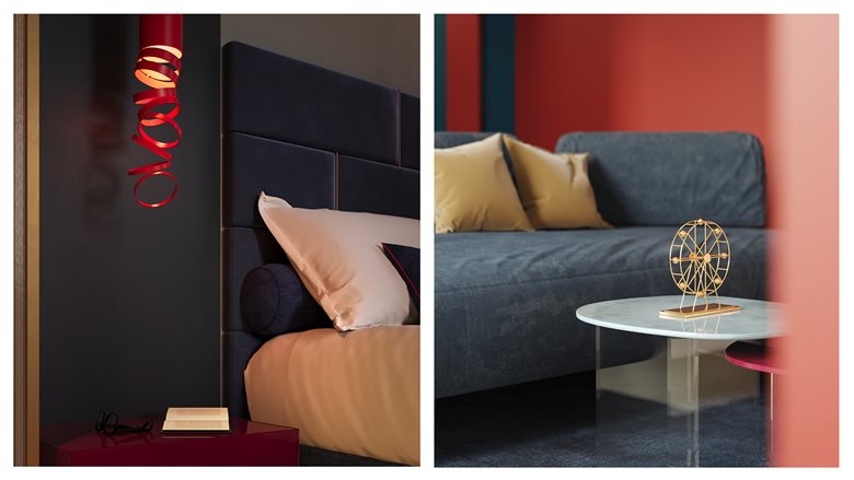 Luci notturne e visioni immaginifiche accolgono l’ospite e lo invitano a vivere un’esperienza di stupore, sospesa tra realtà e fantasia. La palette riprende i codici del circo in un linguaggio narrativo in cui ogni sfumatura ha un significato preciso: il blu navy evoca armonia e profondità, il rosso rubino trasmette energia e vitalità, il ceruleo infonde serenità e leggerezza, mentre gli accenti dorati illuminano lo spazio e ne amplificano l’eleganza.