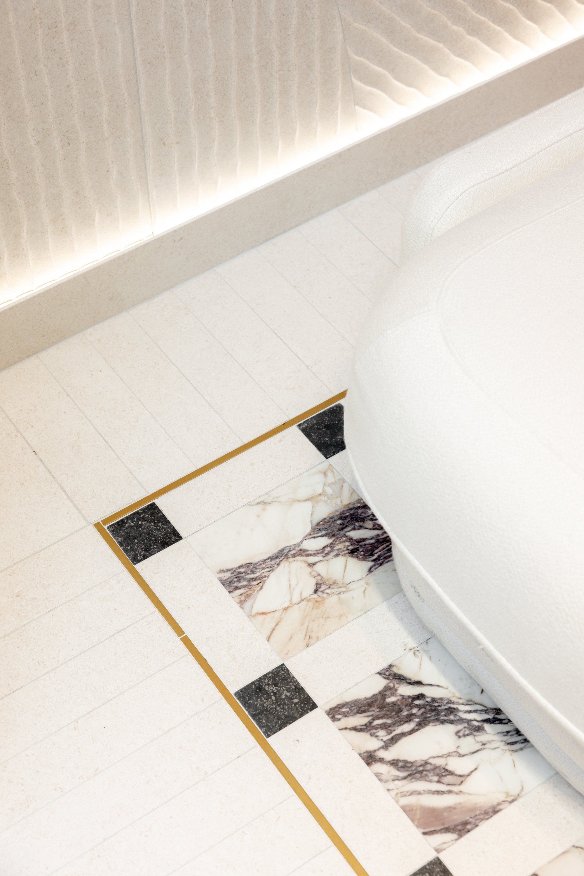 Nel suo Dress Code, Beriestain trasforma la ceramica in una combinazione di texture ricche, formati diversificati e una palette di colori Deeply Chic, capaci di vestire qualsiasi spazio. Le superfici in ceramica effetto pietra si ispirano ai tradizionali interni parigini, evocando il fascino delle architetture monumentali di fine Ottocento, dove il contrasto tra materiali pregiati e giochi di luce crea ambienti avvolgenti.