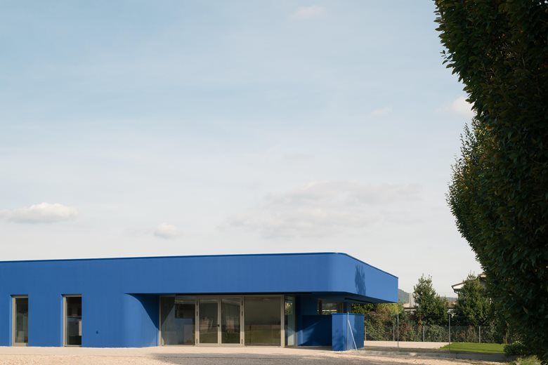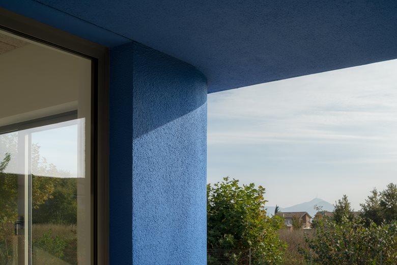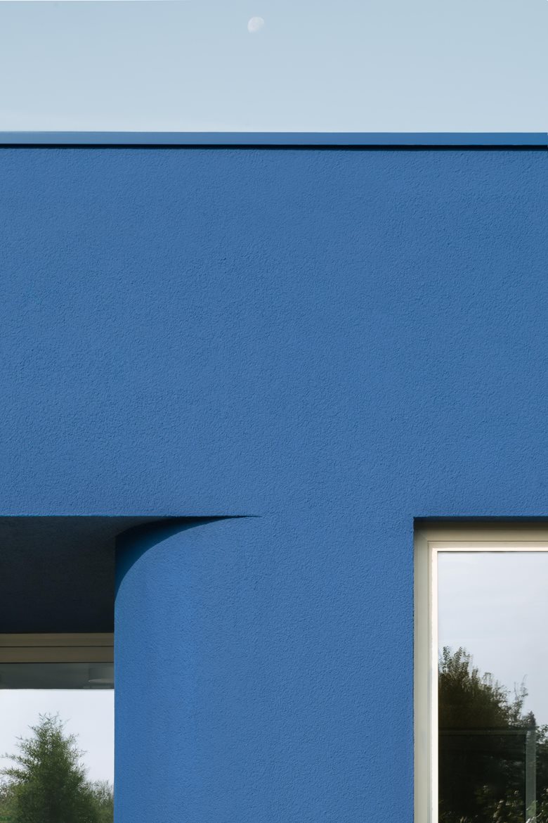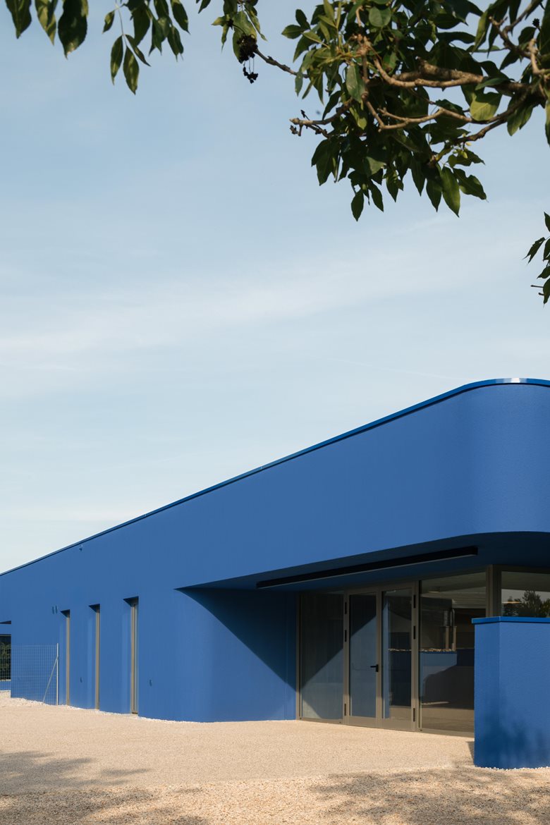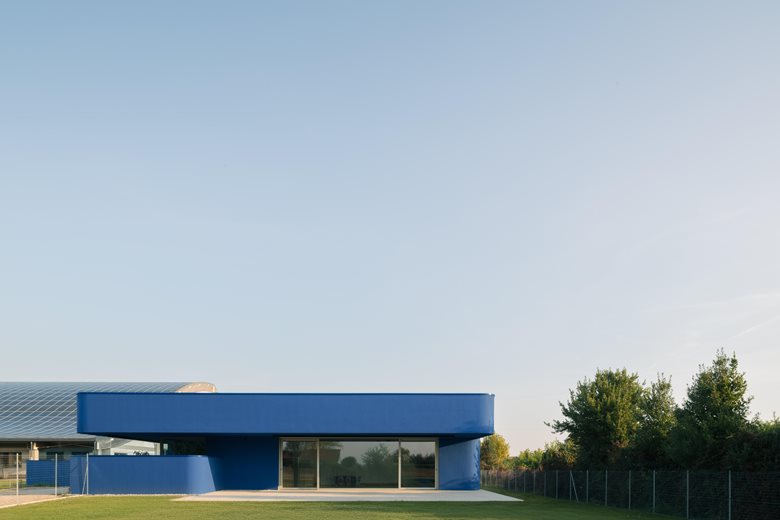 L’edificio si distingue per il suo involucro esterno blu intenso, che dialoga con il cielo e il paesaggio, e per gli angoli smussati che conferiscono movimento alla geometria, creando un gioco di luci e ombre mutevoli durante la giornata.