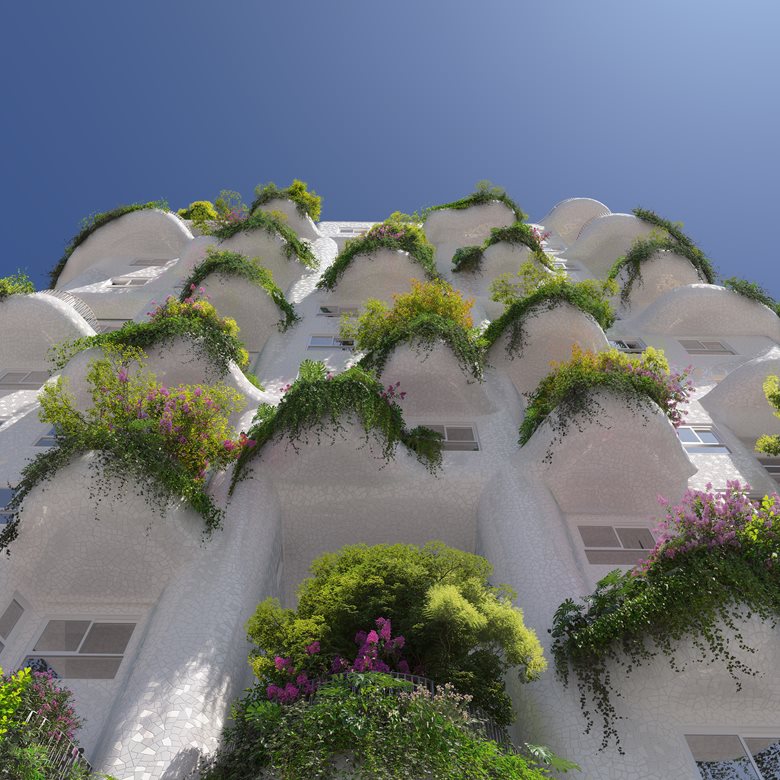 L’estetica dell’edificio si ispira alla natura: i numerosi balconi, i fioriere e le aperture presentano curve morbide e organiche, mentre la facciata è rivestita da un mosaico di piastrelle ceramiche irregolari che rimanda al lavoro di Antoni Gaudí. L’uso di diverse tonalità di bianco e di piastrelle di dimensioni variabili permette di adattare il rivestimento a ogni curva, garantendo una finitura elegante e di facile manutenzione.