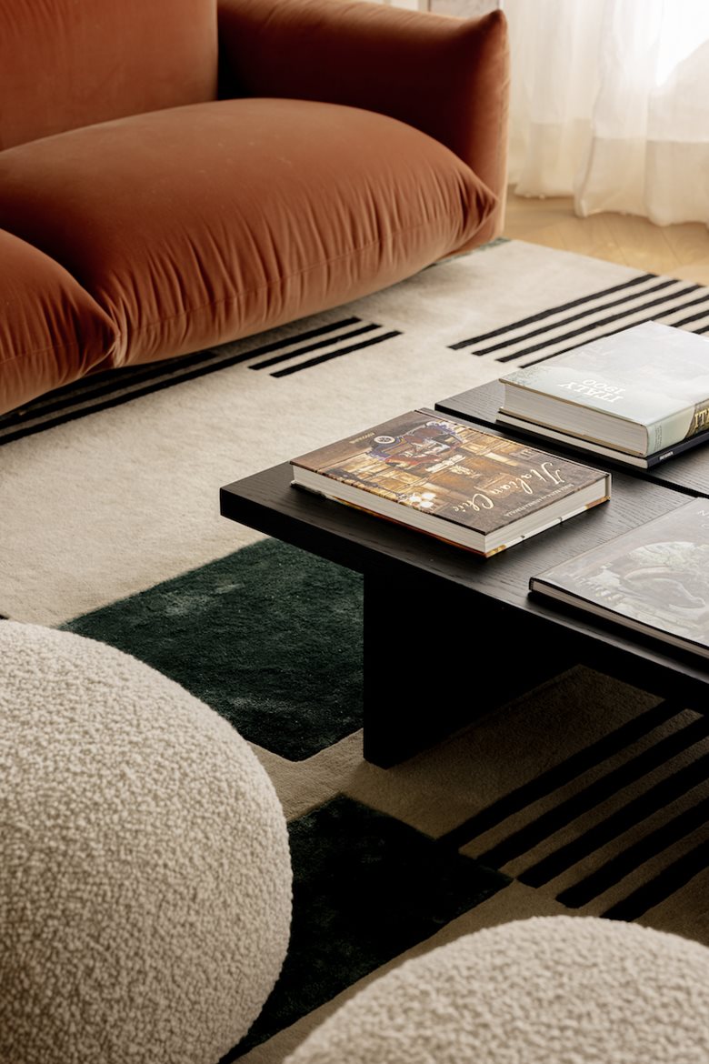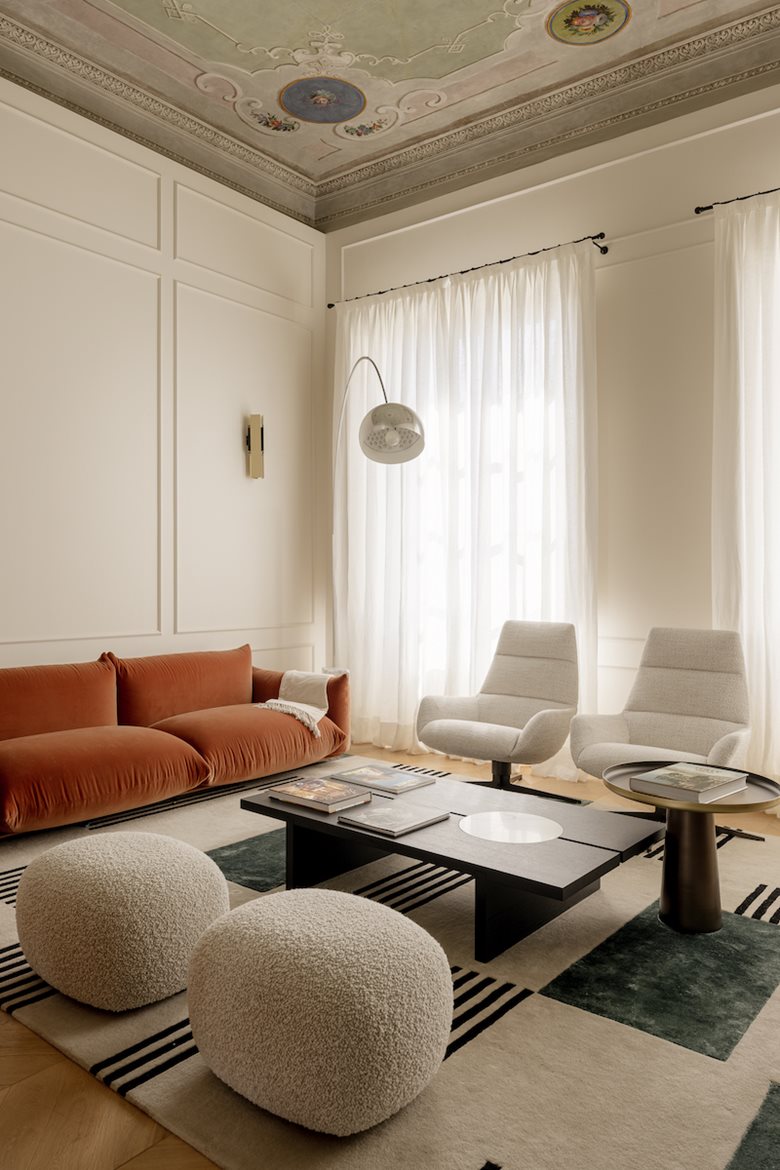 L’ambiente si sviluppa attorno a un living centrale a pianta aperta, dove la luce naturale sottolinea i soffitti affrescati con motivi floreali e geometrici. Al centro della zona giorno, una combinazione cromatica decisa introduce una nota calda e avvolgente, definendo uno spazio conviviale raffinato.