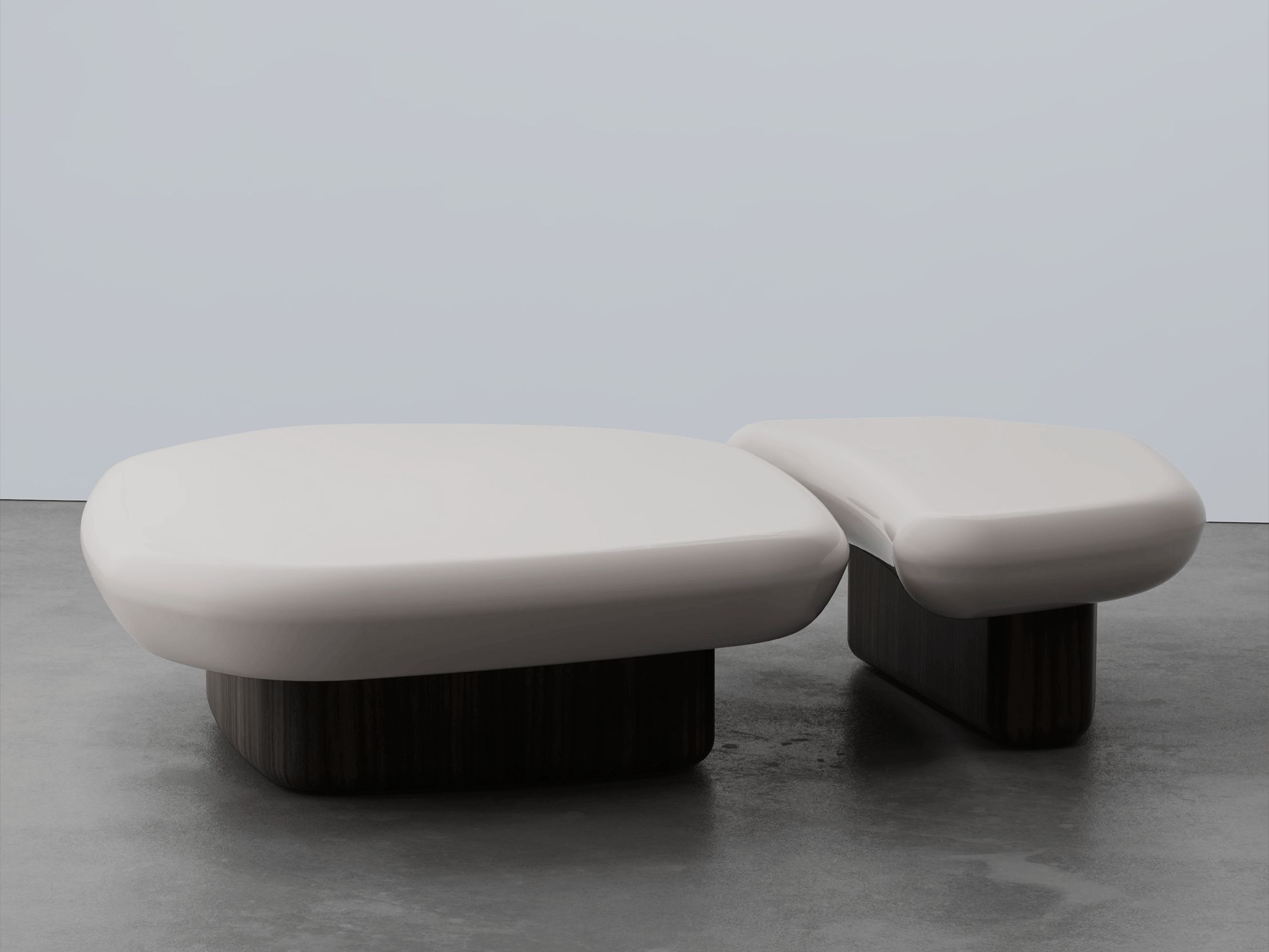 All’interno di questa visione si inseriscono i coffee e side table Kawa, Moonrise, Romo e Pingu, ciascuno interprete di un dialogo tra forme organiche, materiali preziosi e dettagli accurati. In tutti, il laccato lucido gioca un ruolo centrale: amplifica le curvature morbide di Kawa, accentua il dinamismo cromatico di Moonrise nel confronto con marmi e pietre, sottolinea la purezza geometrica che sostiene la materia lapidea e lignea in Romo e dona a Pingu una leggerezza visiva che esalta le sue proporzioni compatte.