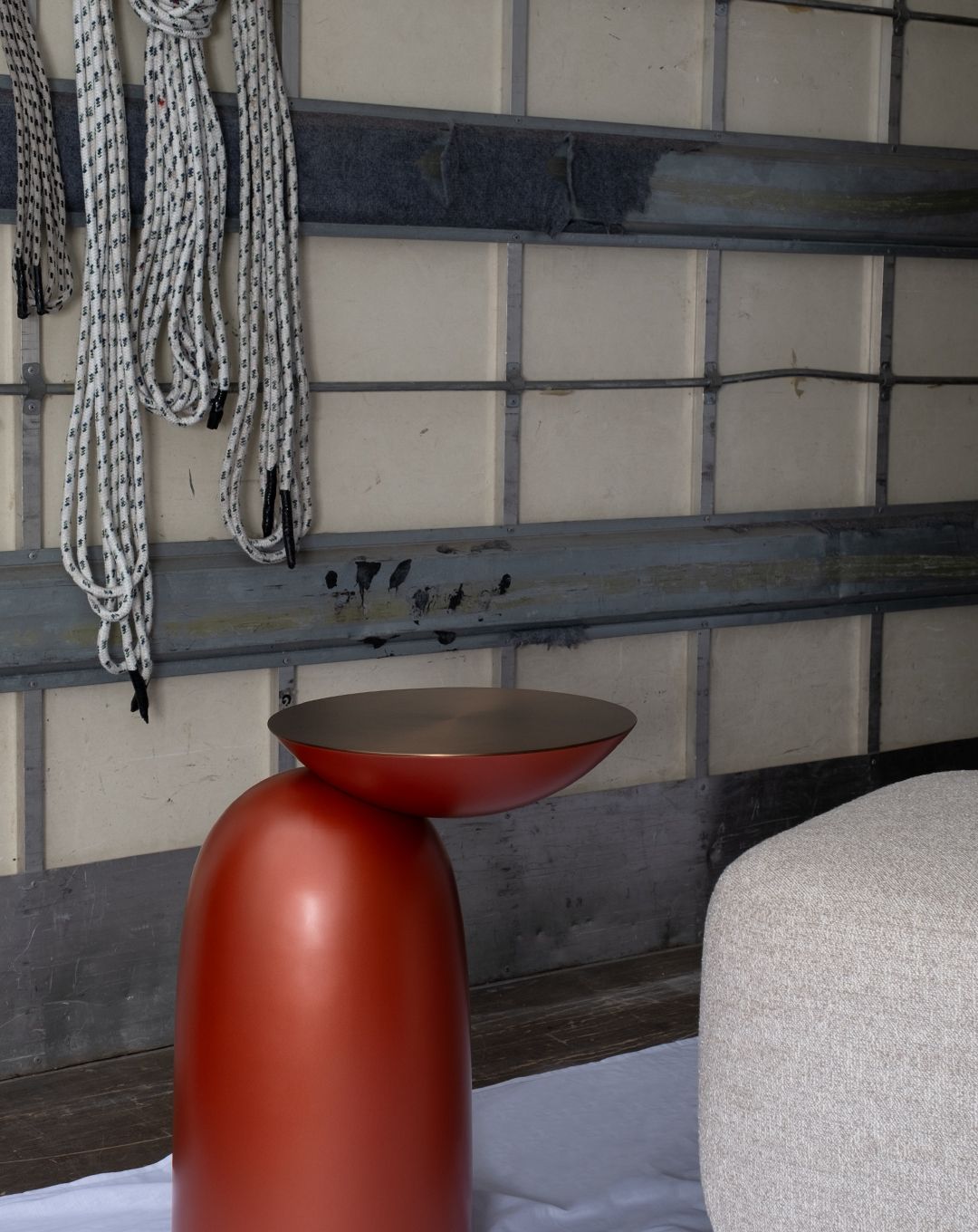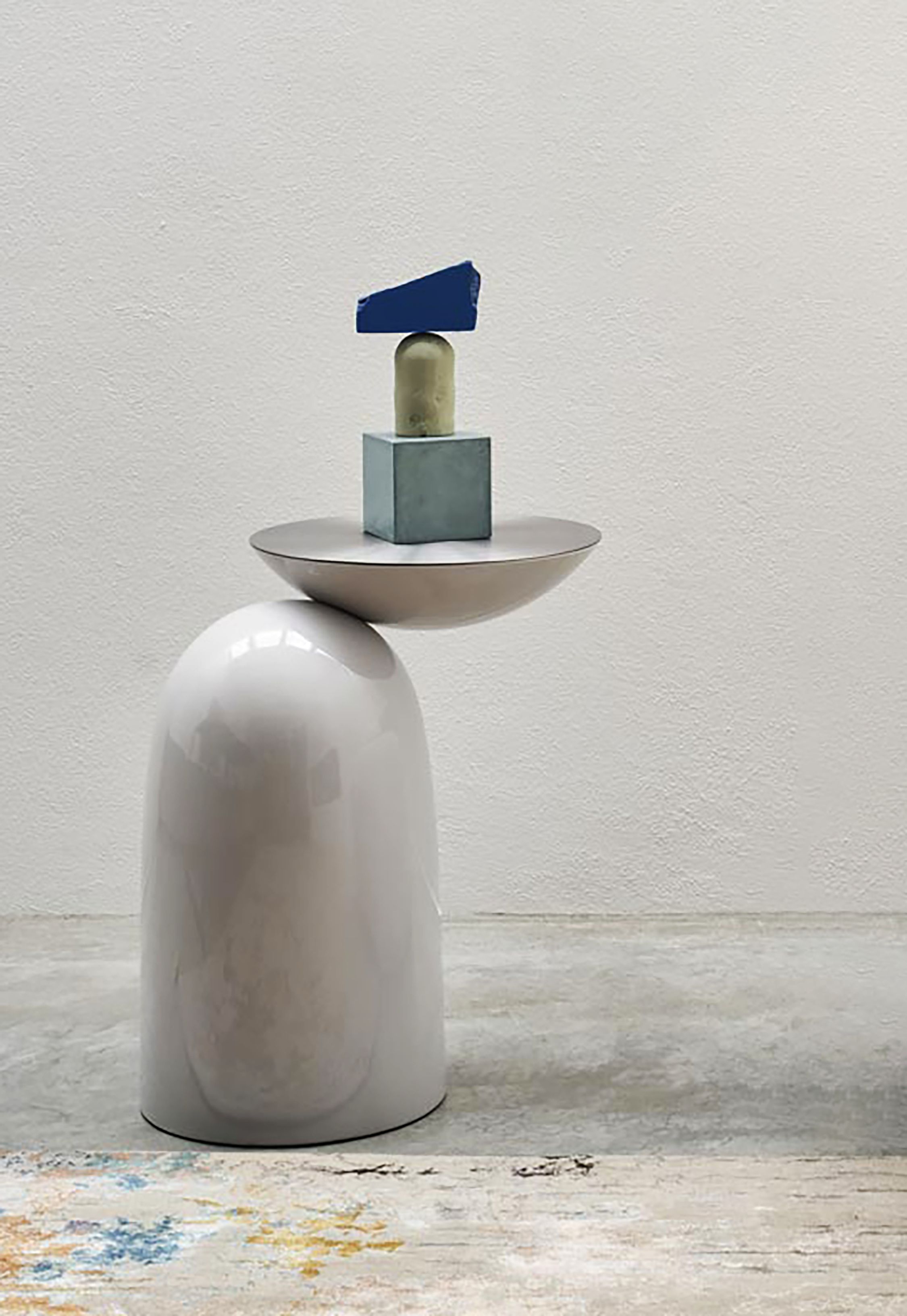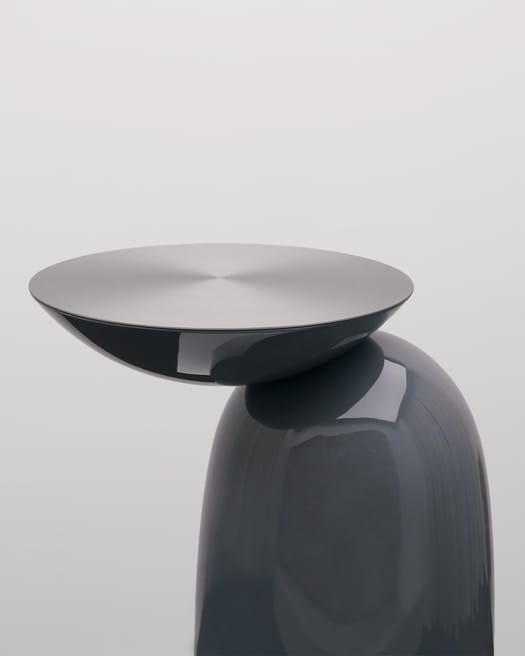 Pingu side table è un complemento versatile, ideale accanto a una poltrona per appoggiare un drink o un libro. La sua cupola rovesciata sembra sfiorare la base dalle linee morbide che la sostiene, creando un leggero equilibrio visivo, in dialogo con i riflessi del top in metallo.