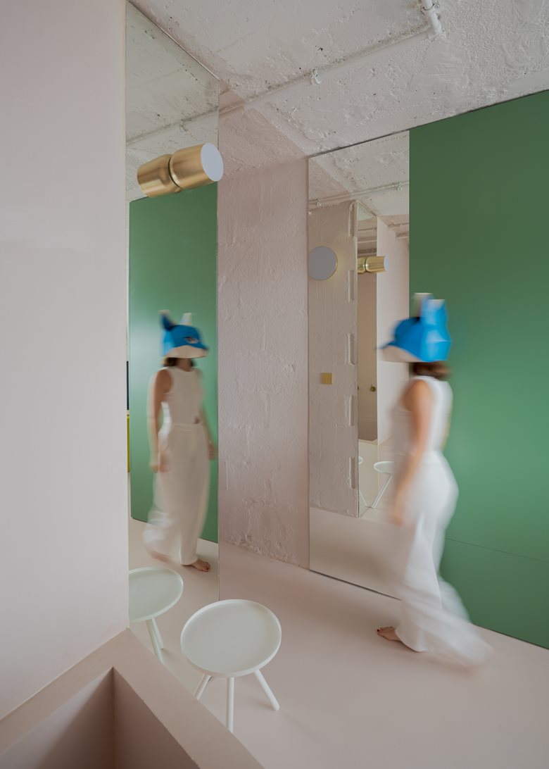 Il resto della casa è pensato come una superficie flessibile, senza gerarchie rigide, capace di adattarsi ai gesti di ogni giorno. È il colore a disegnare lo spazio e a costruirne l’atmosfera: un rosa chiarissimo riveste il pavimento e filtra la luce, un verde saturo struttura il volume del riposo, mentre tende blu Klein introducono una privacy temporanea senza interrompere la percezione dell’insieme.