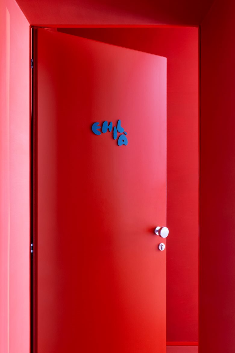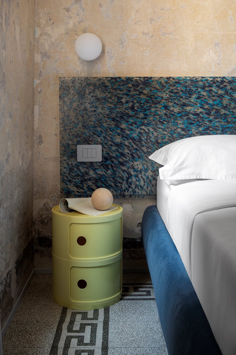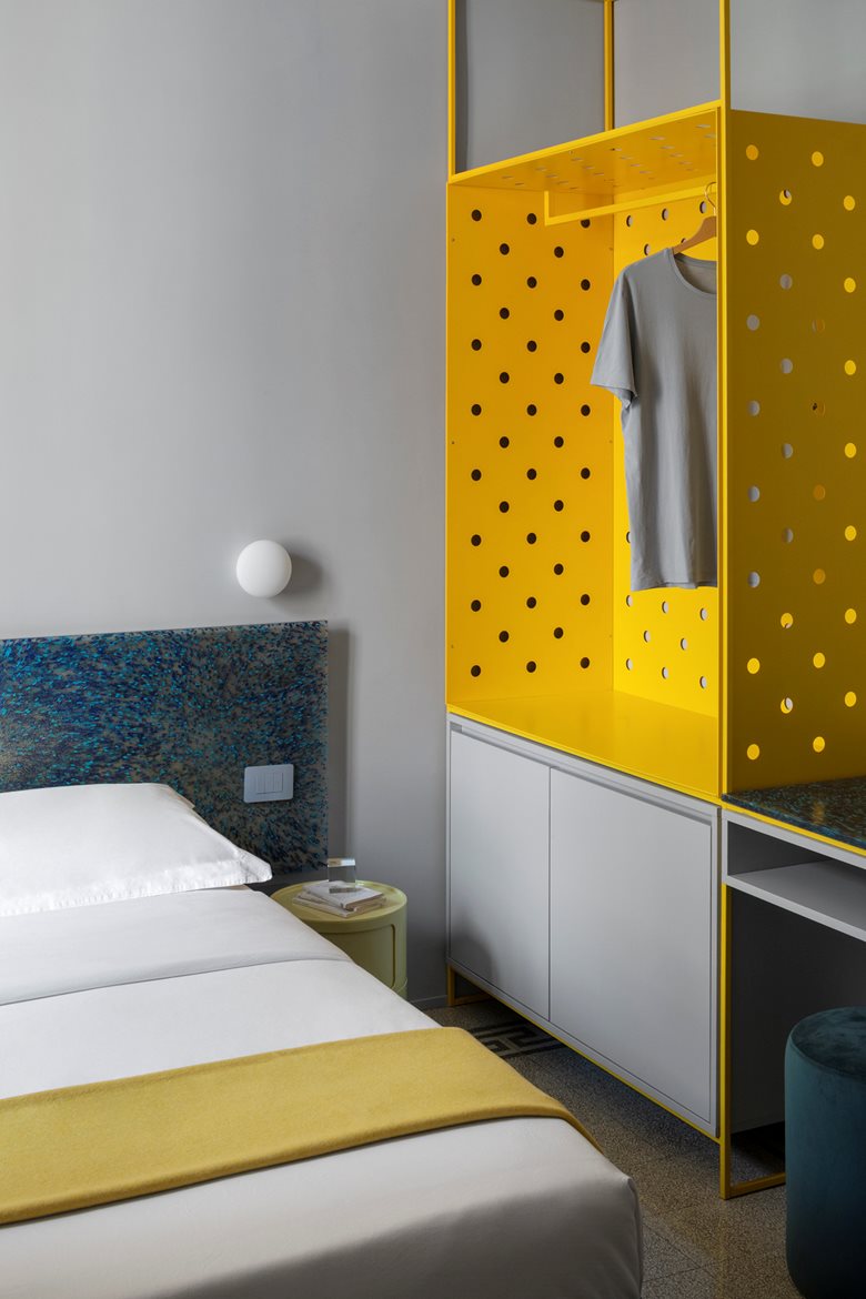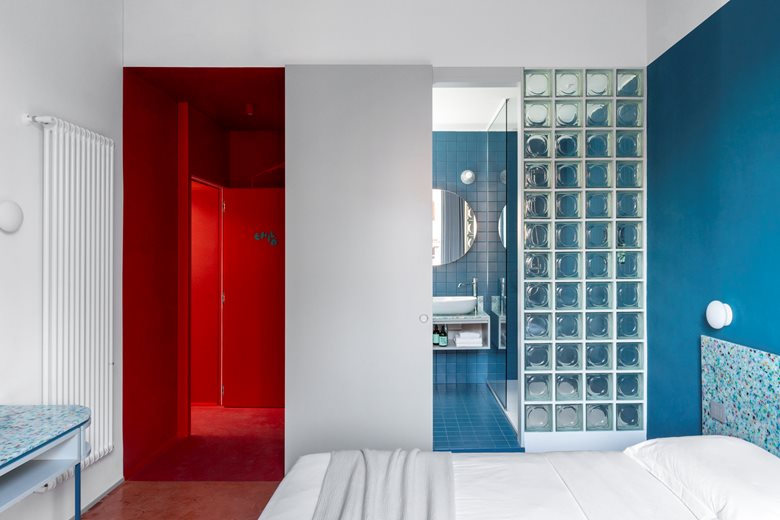 Gli accessi sono ritmati da ingressi ribassati – per ospitare impianti tecnici – che guidano l’ingresso alle stanze in modo compresso e ovattato. Le testiere dei letti, realizzate con lo stesso materiale plastico riciclato, entrano in dialogo con pareti colorate, superfici continue in linoleum o cementi resinosi, e vecchi pavimenti recuperati in cotto o graniglia.